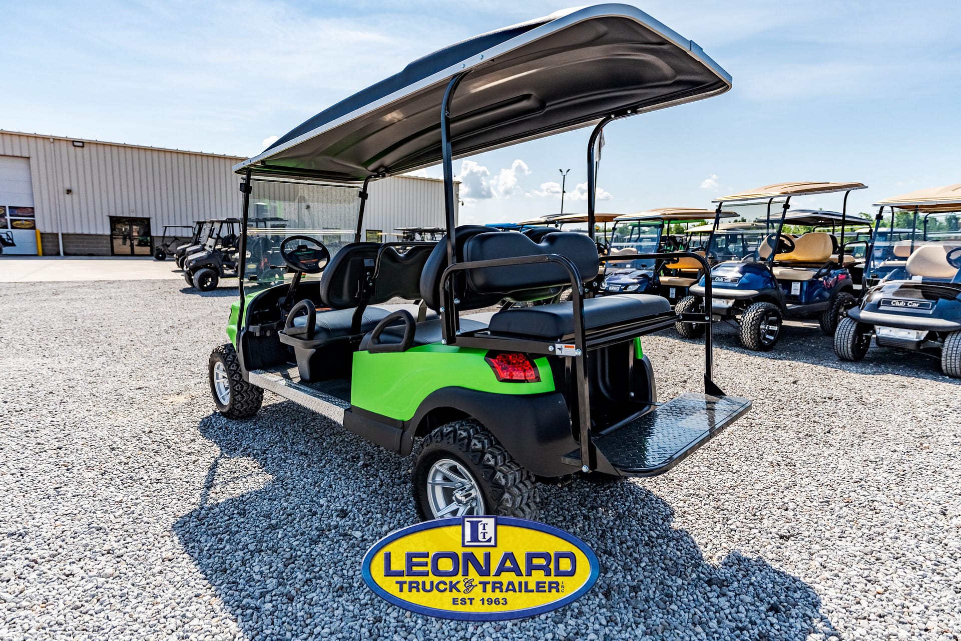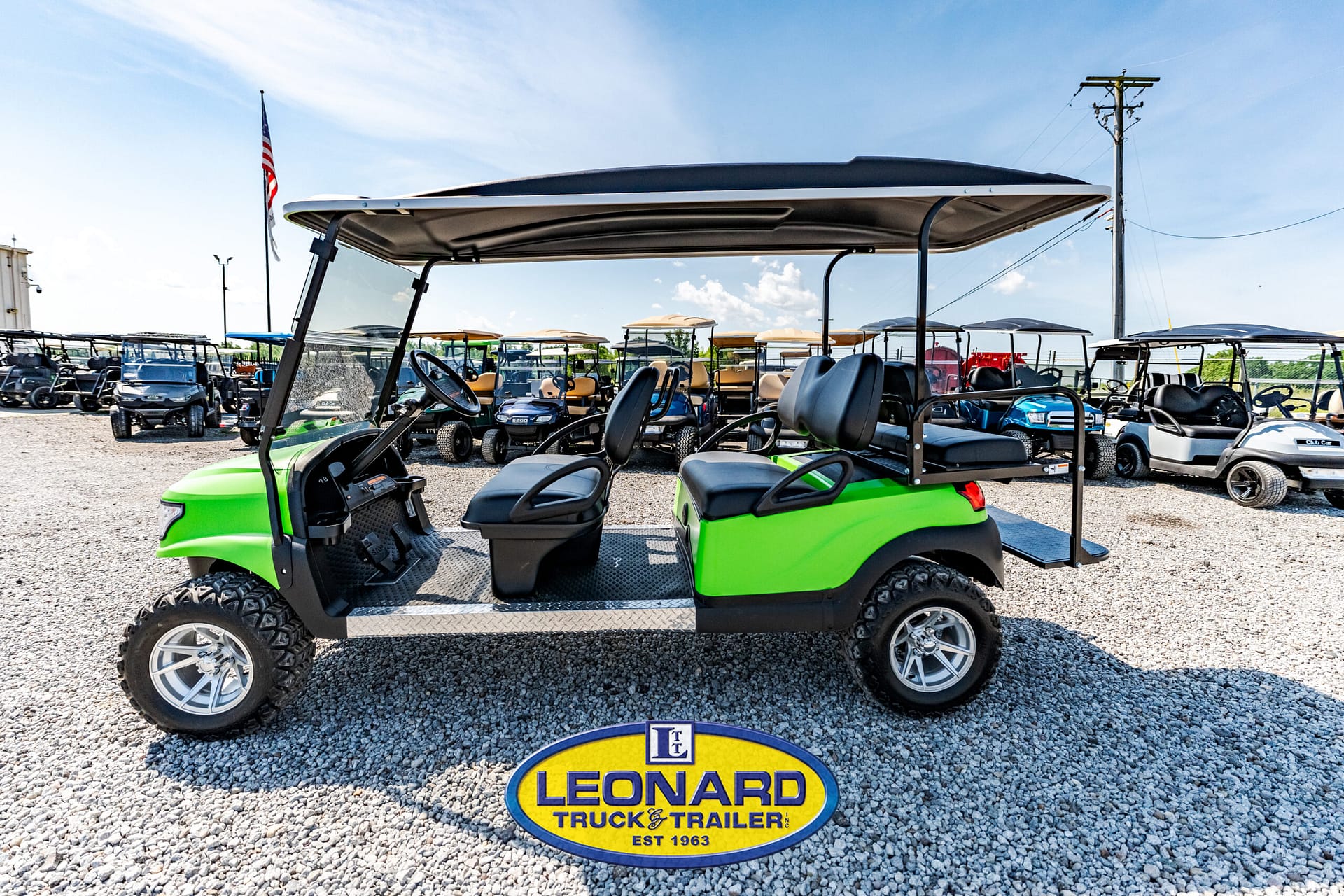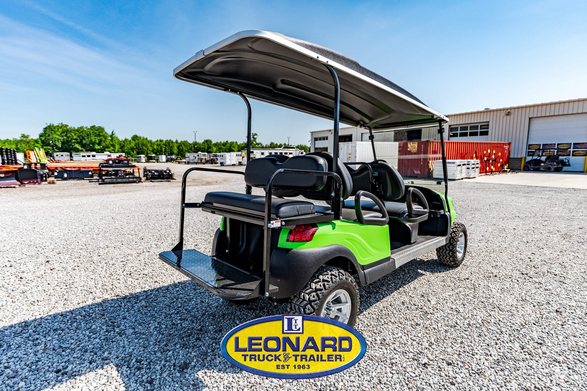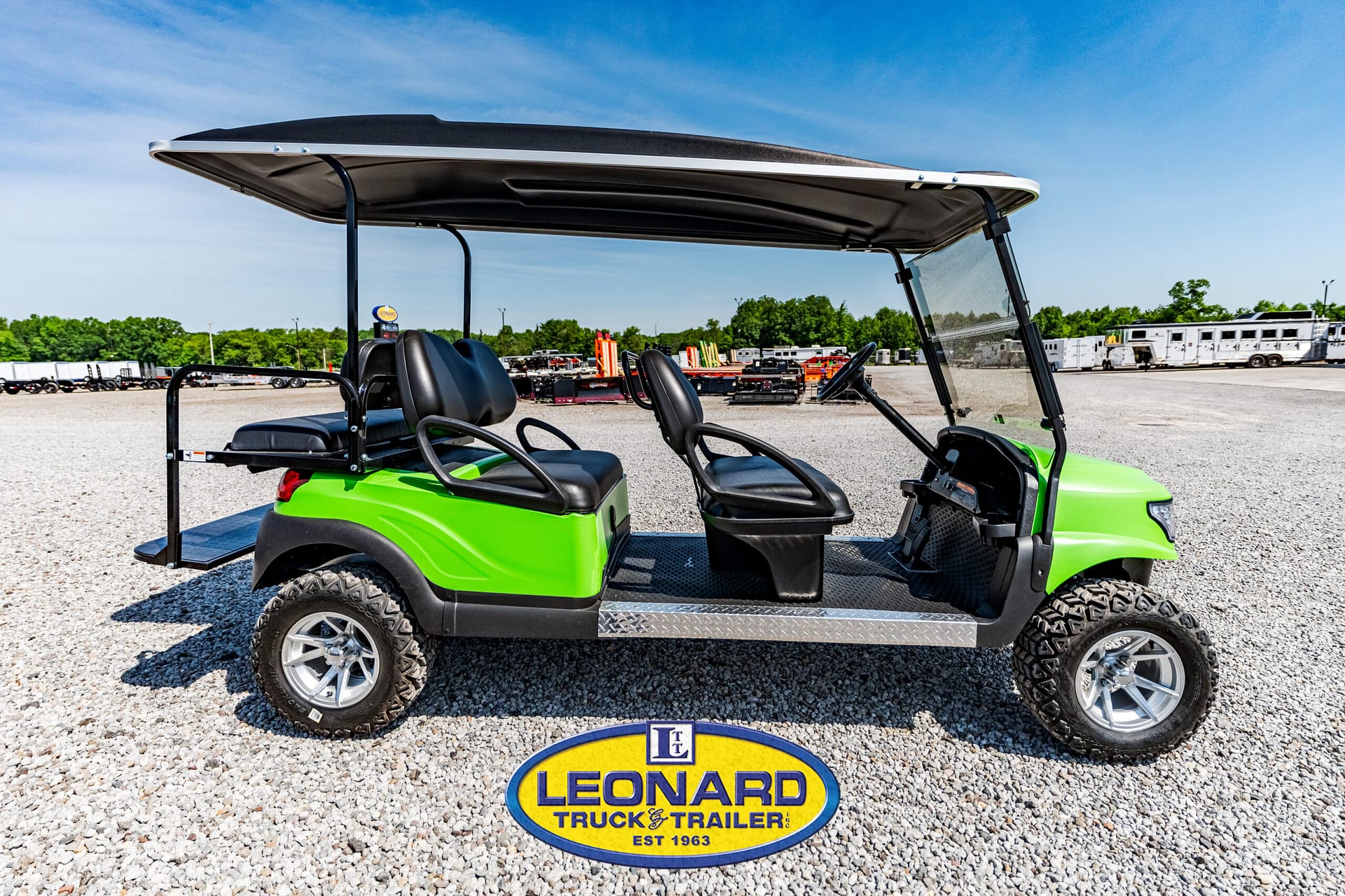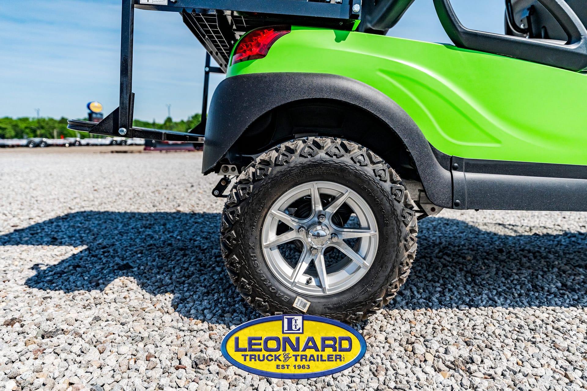 Used 2014 CLUB CAR PRECEDENT stretch lifted electric cart with LED head and tail lights, seat kit and 116″ eagle top. All terrain tires