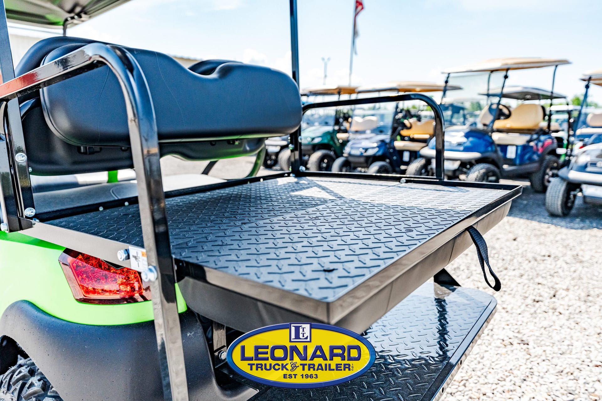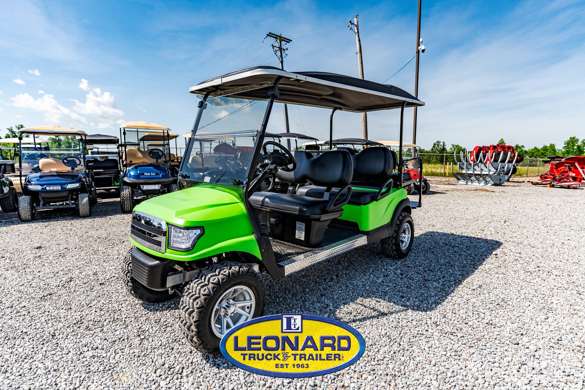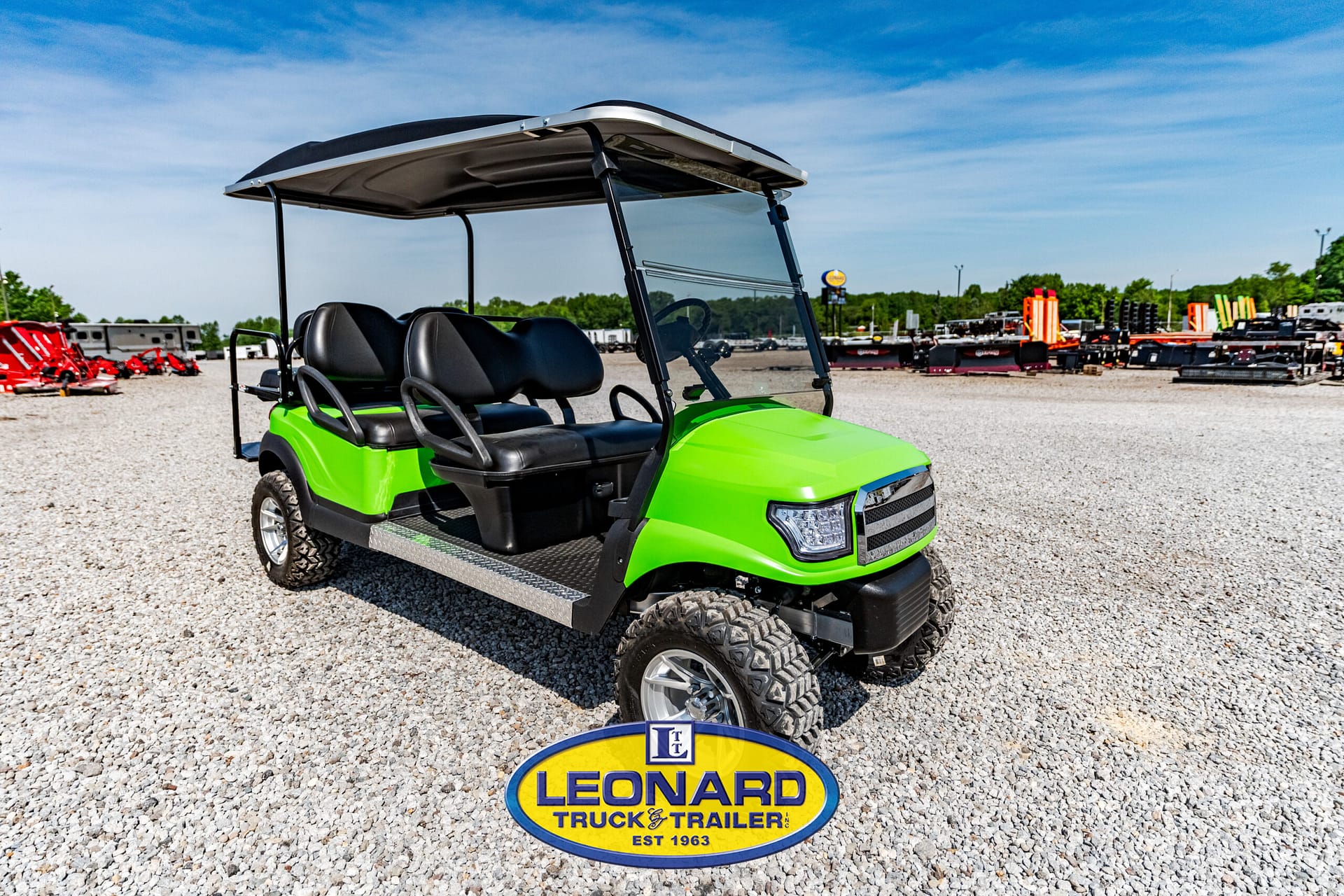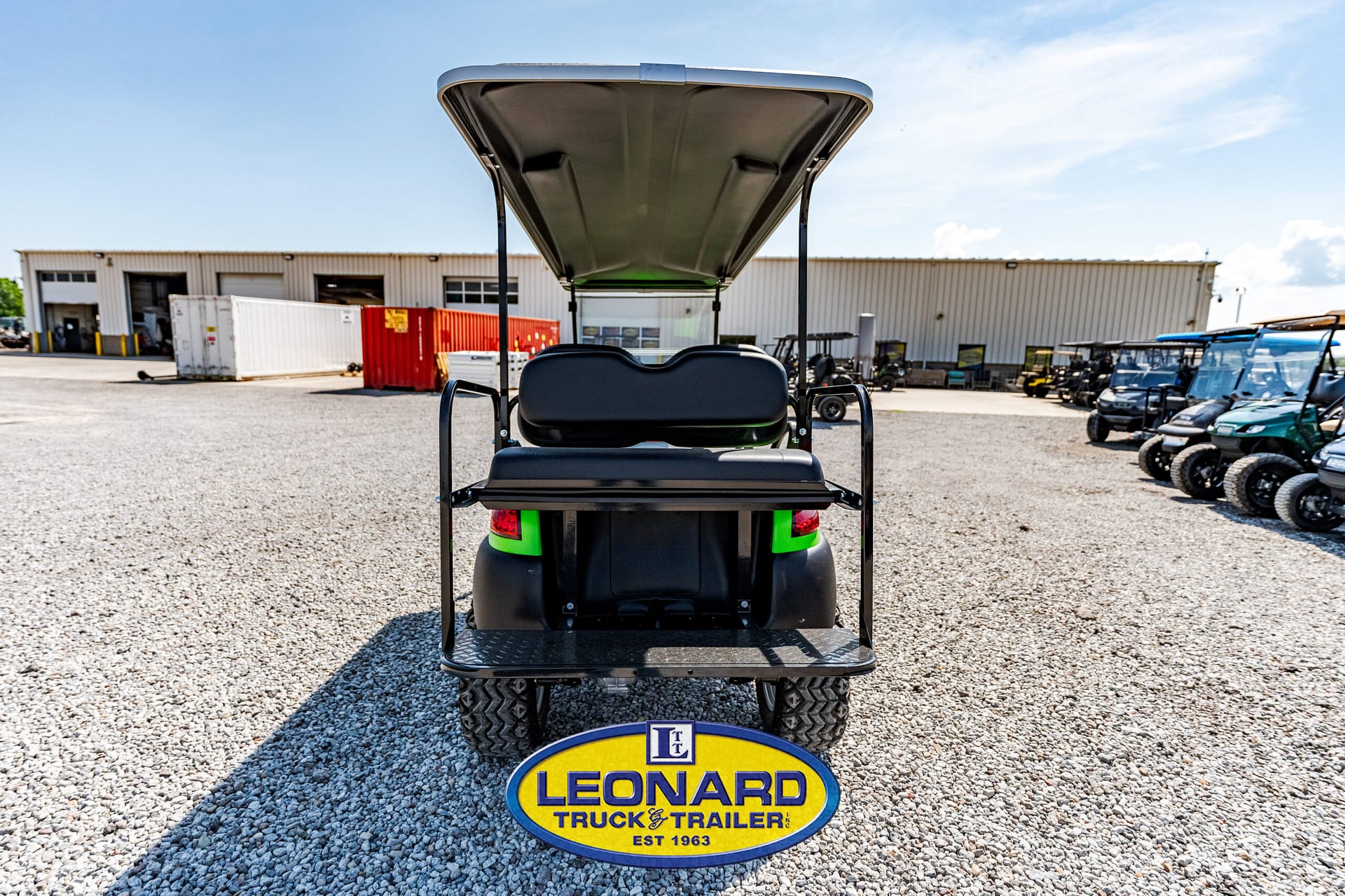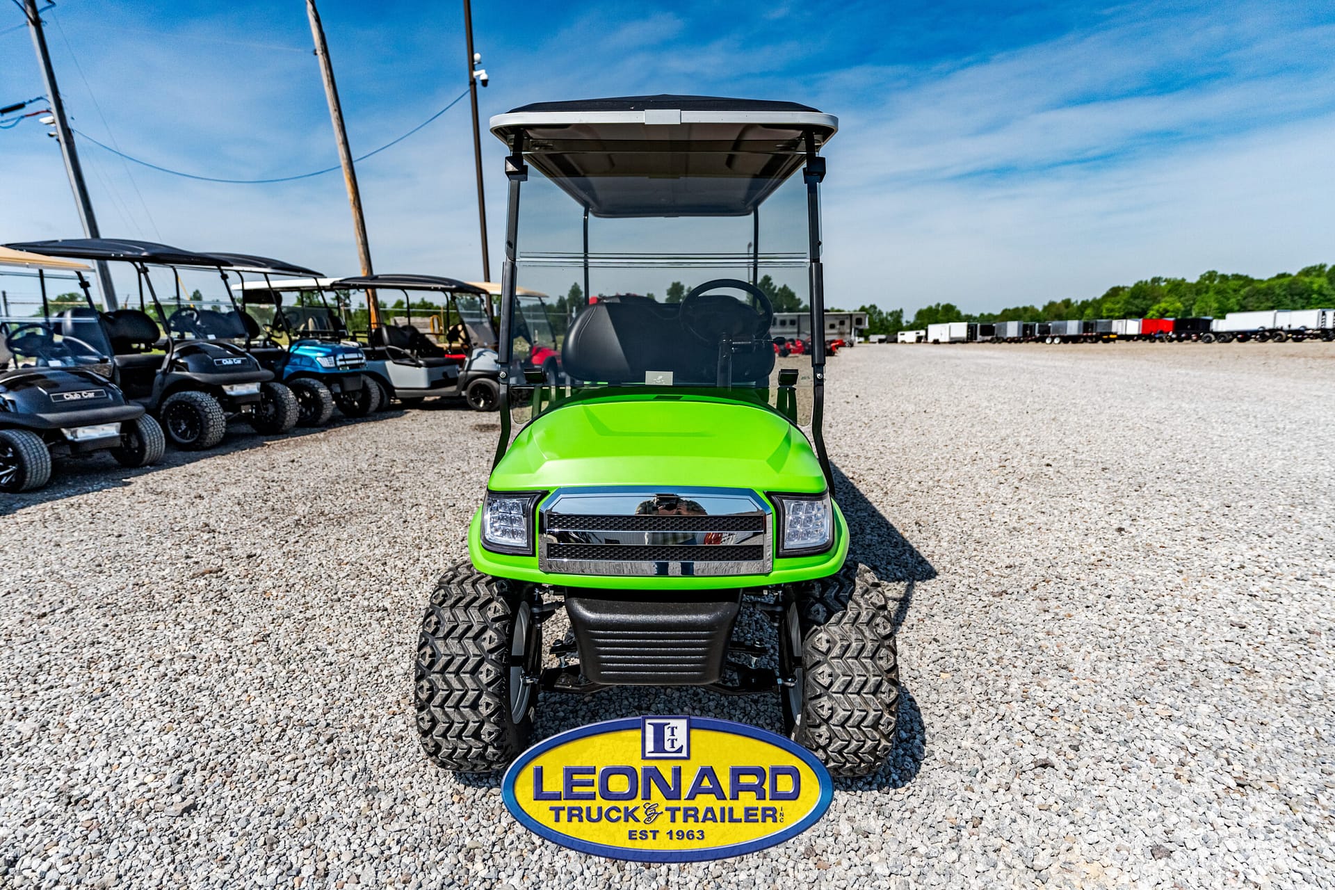 Used 2014 CLUB CAR PRECEDENT stretch lifted electric cart with LED head and tail lights, seat kit and 116″ eagle top. All terrain tires
