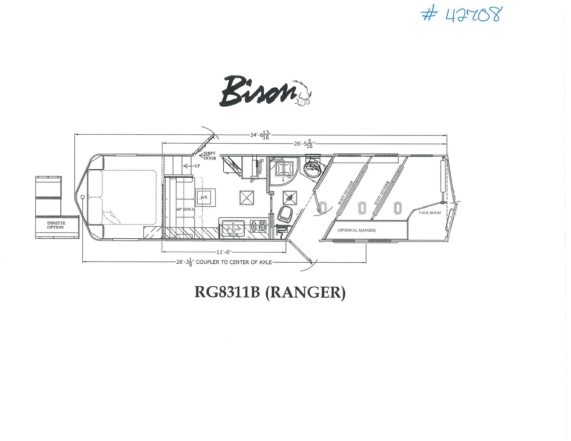 Bison Ranger has a steel frame w/aluminum skin 3 horse slant, rear tack and 13′ Living Quarters w/slide out. This unit is equipped with the standard features plus options. White exterior, 7000# axles, ST235/85R16″, aluminum rims, hydraulic jack single leg, step at escape door, ducted 15,000 btu air conditioner, water heater gas/electric dsi-6 gal, stereo with interior/exterior speakers, power awning. Horse area: managers 3h/2 stall, stud wall, 4 load lights. Rear tack: swing out blanket bar. Living Quarters: Dapple grey interior, westport mink flooring, grove park ash cabinetry, sofa & dinette, 24” lcd tv w/locking swing arm. Call for more details.