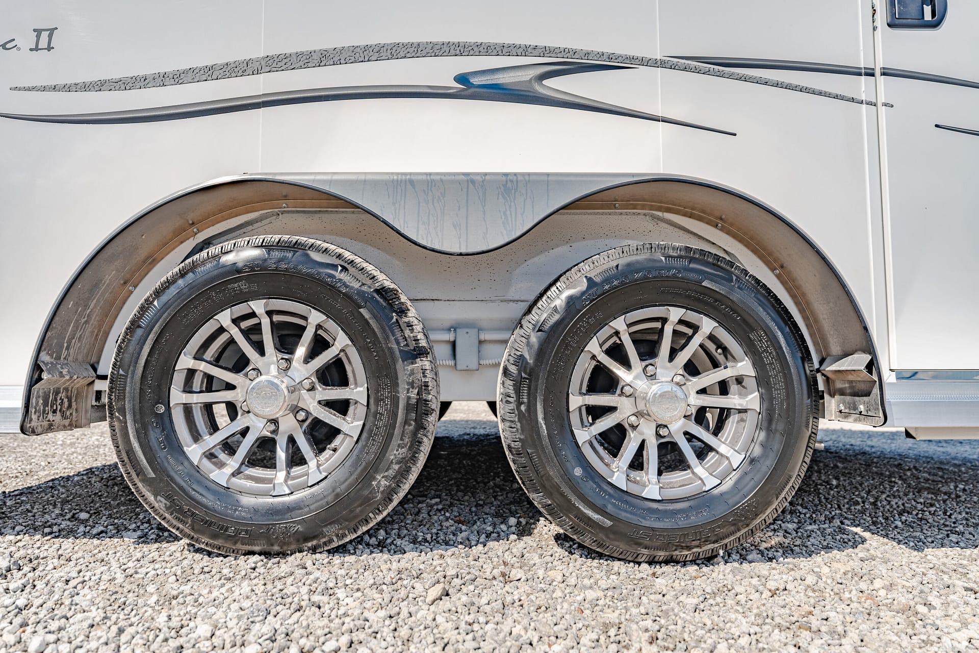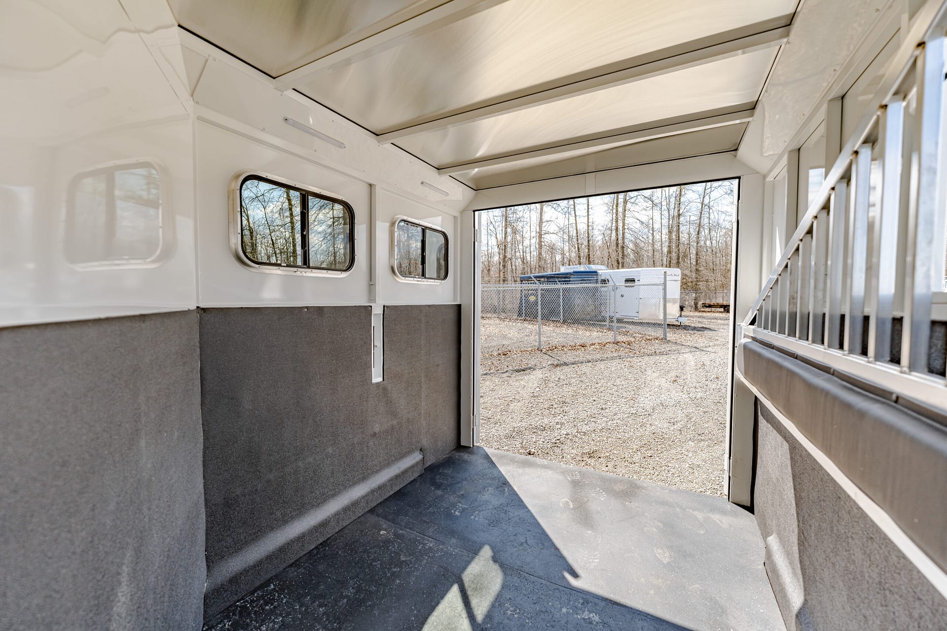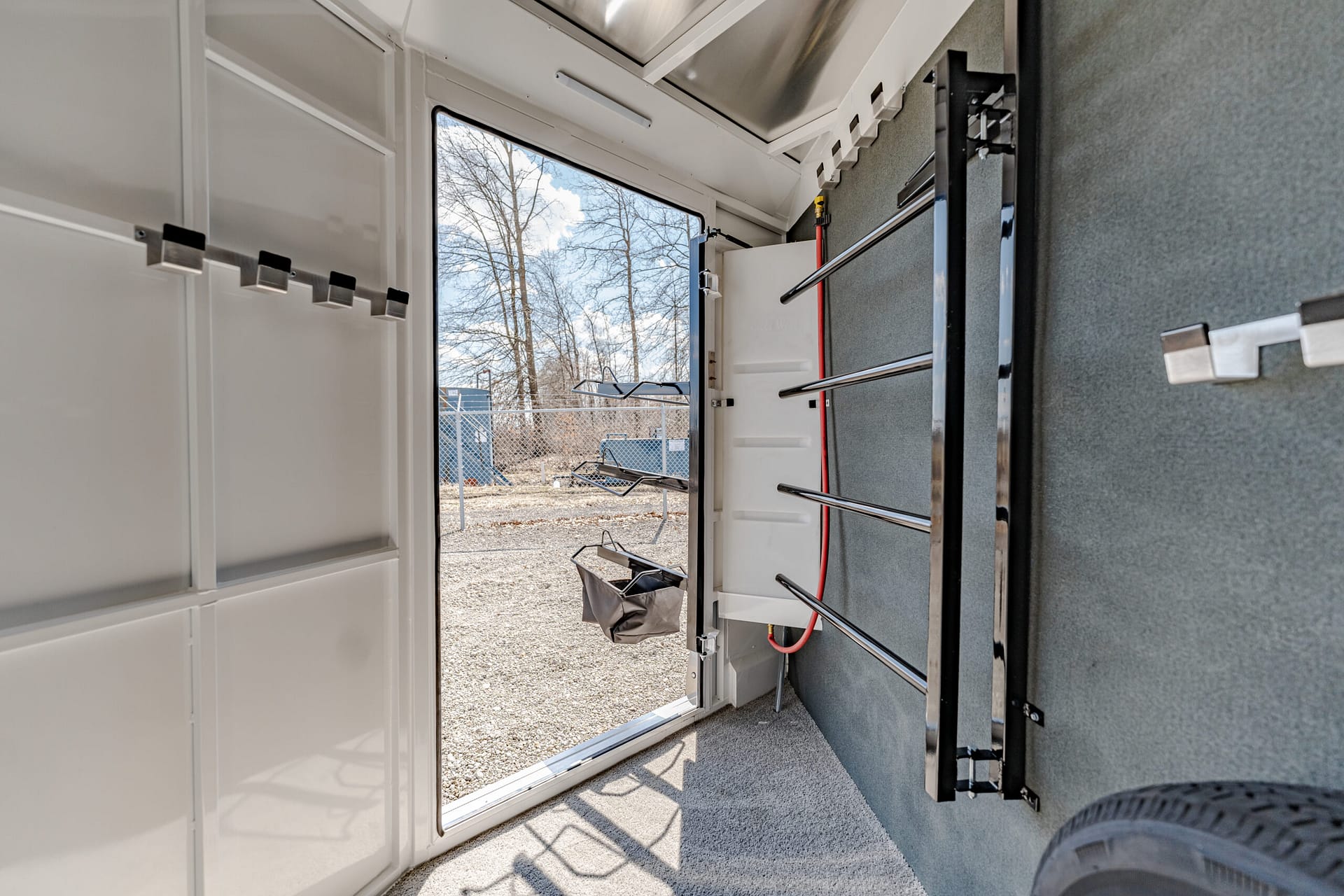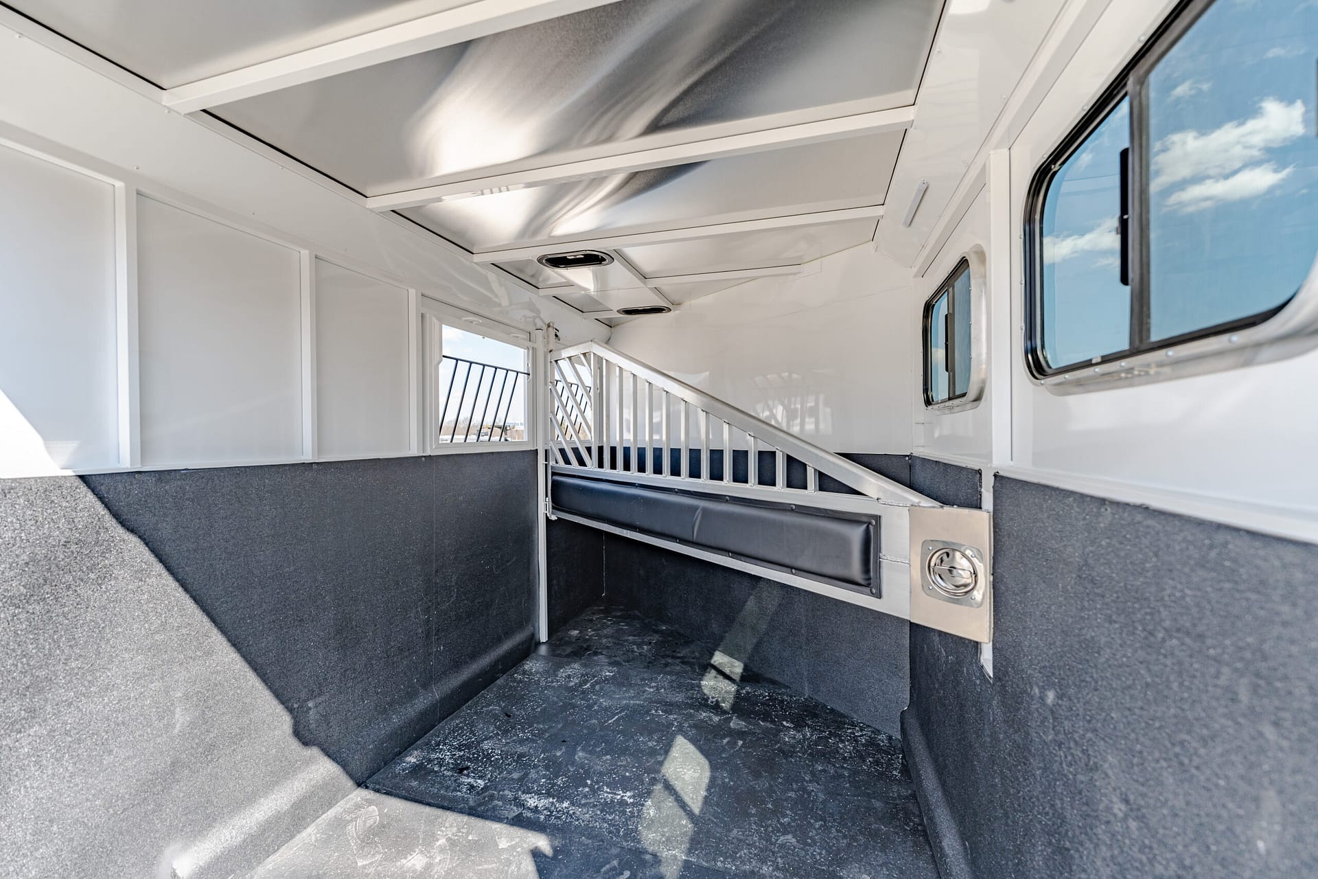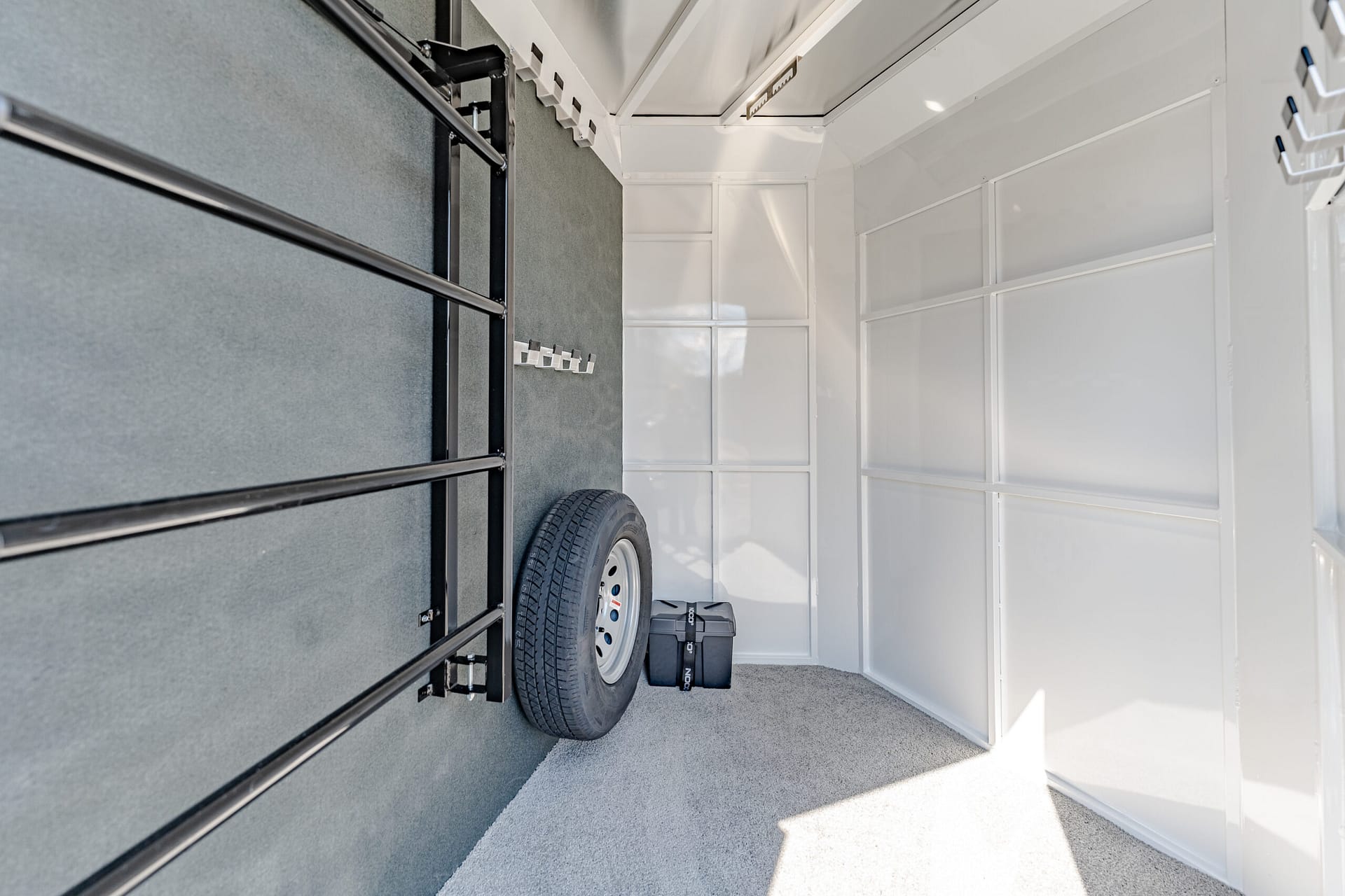 Our Classic model is constructed with a steel frame and aluminum skins. It’s 7’0″ wide, and 7’0″ tall and comes standard with custom drop-down feed doors with face grills on the head side, sliding windows on the tail side, and a roof vent in each stall. The large 41″ stalls provide plenty of room and comfort for your horse and feature the industry’s best slam latch divider system. The tack room is roomy and functional and features our state-of-the-art swing-out saddle and blanket racks.