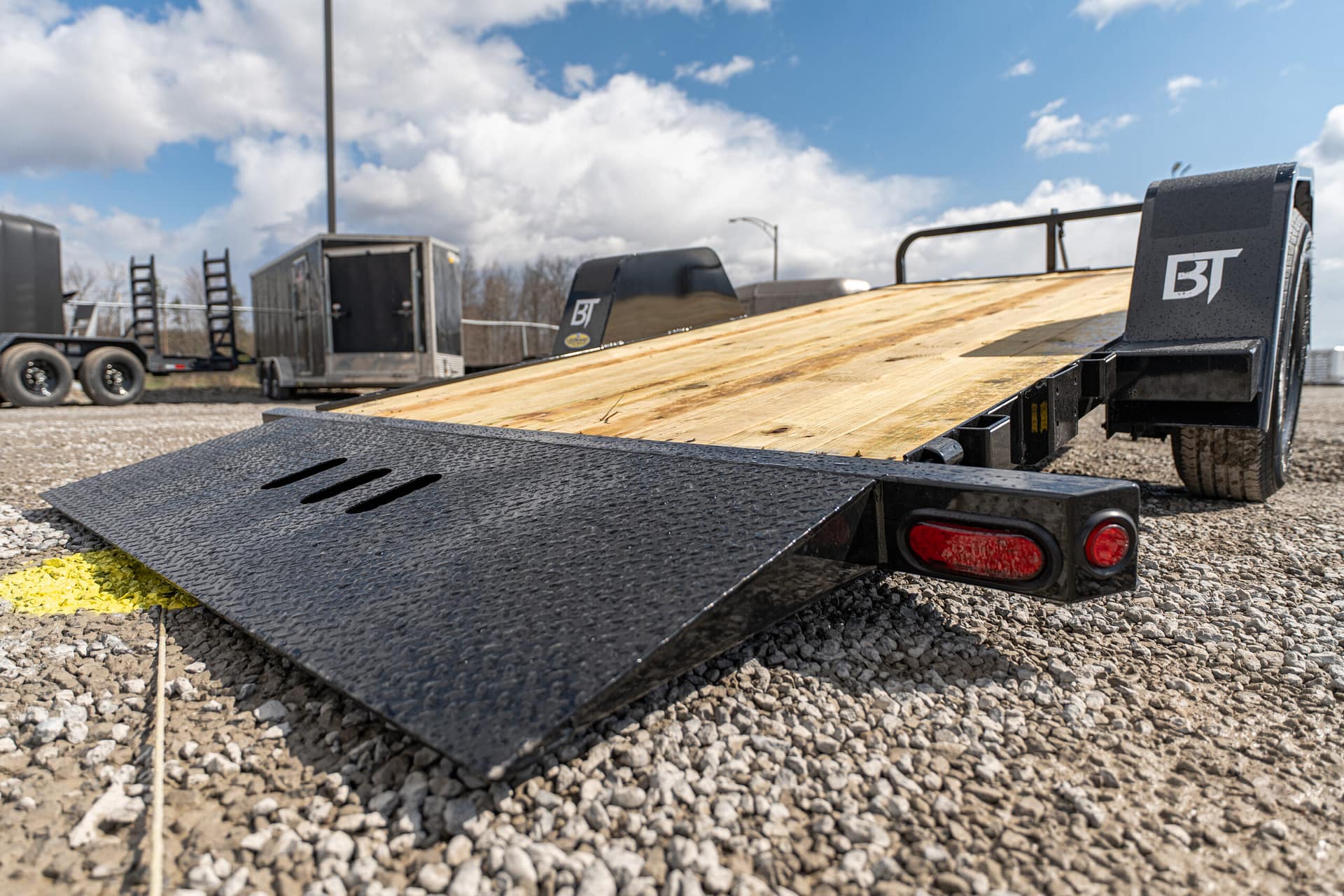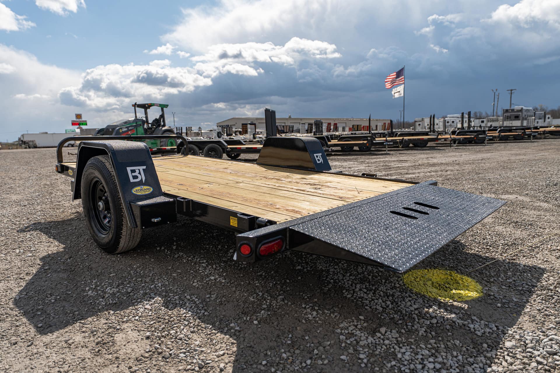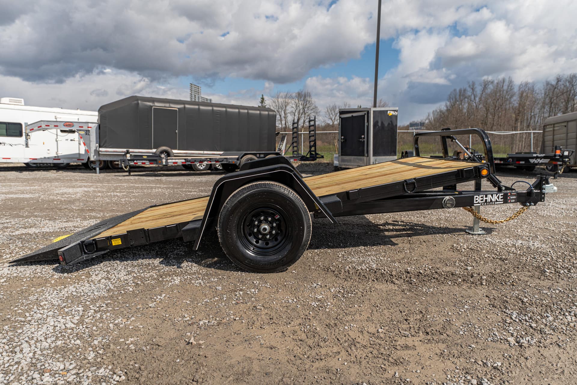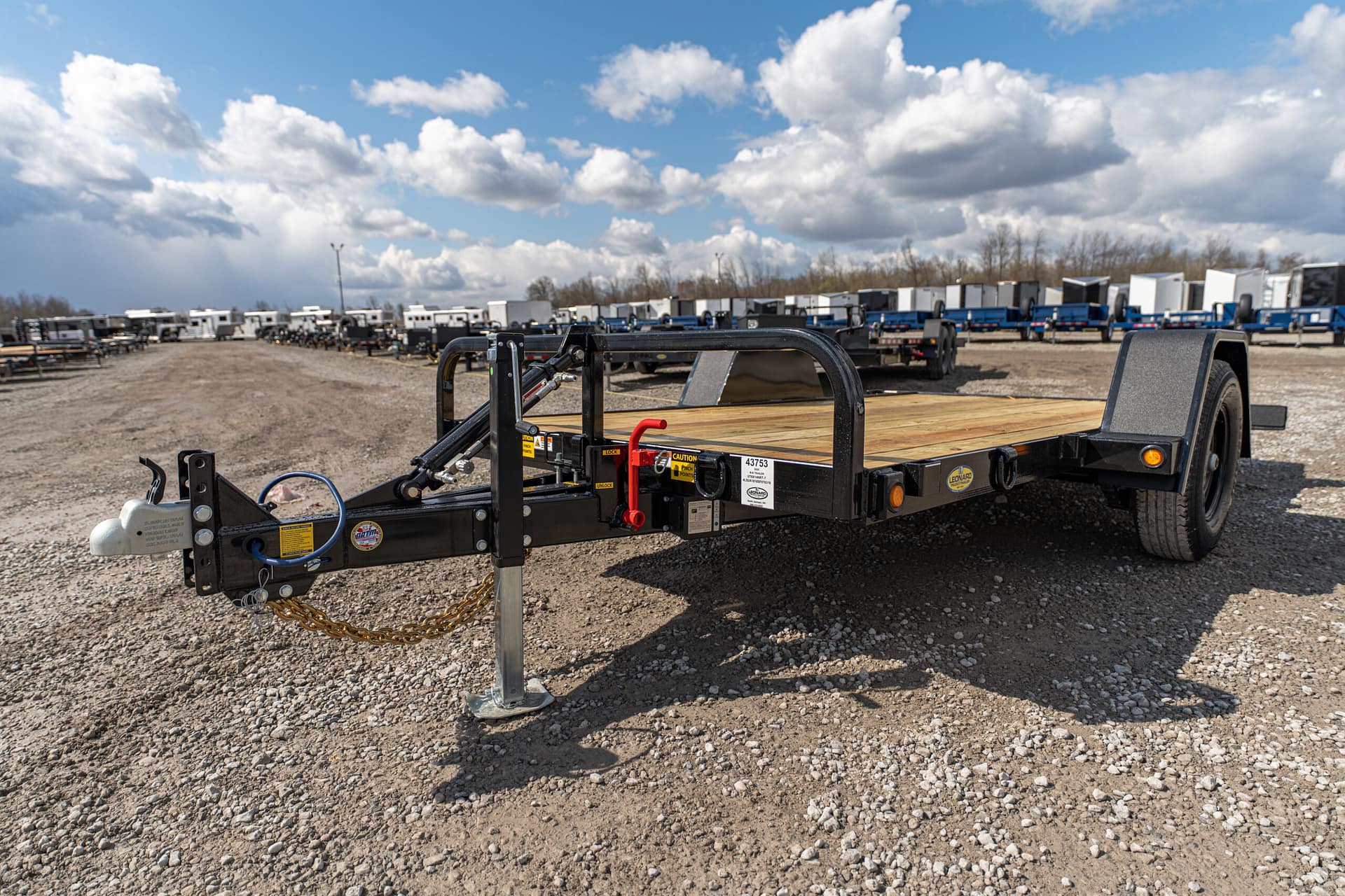 The full tilt features a single 5-7K axle with a 10-12′ tilt deck. Frame widths of 60-80″ can be achieved between the fenders. These trailers are pull-type configurations with a cylinder, that pivots off of the tongue.