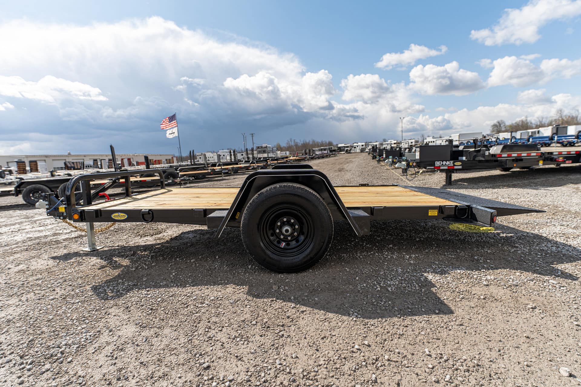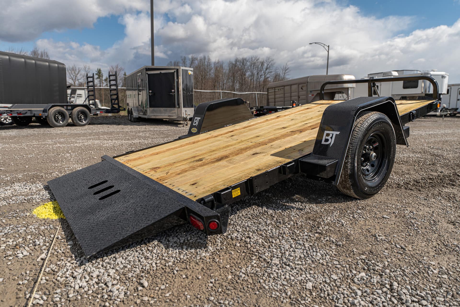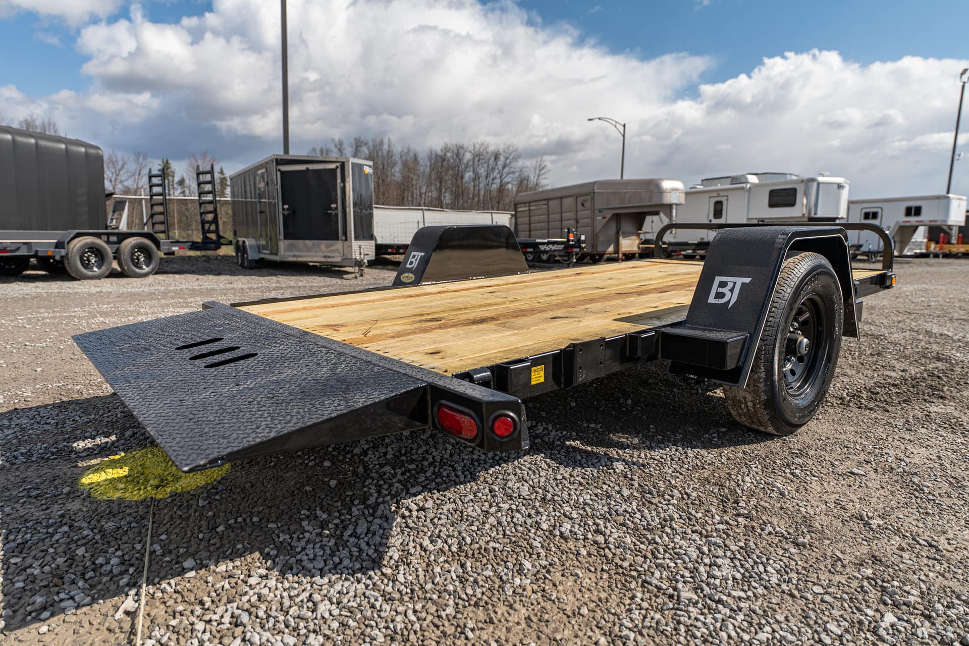 The full tilt features a single 5-7K axle with a 10-12′ tilt deck. Frame widths of 60-80″ can be achieved between the fenders. These trailers are pull-type configurations with a cylinder, that pivots off of the tongue.