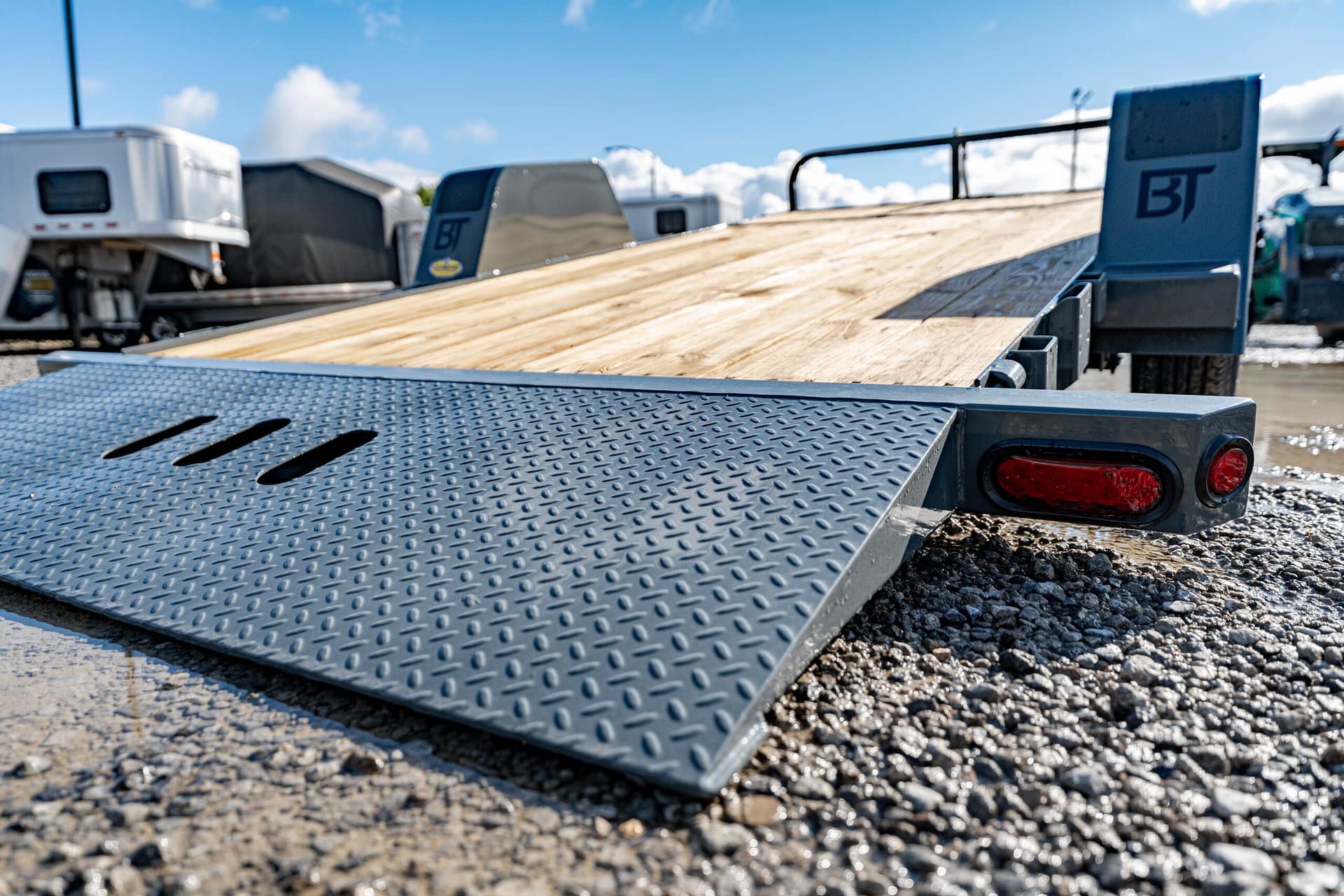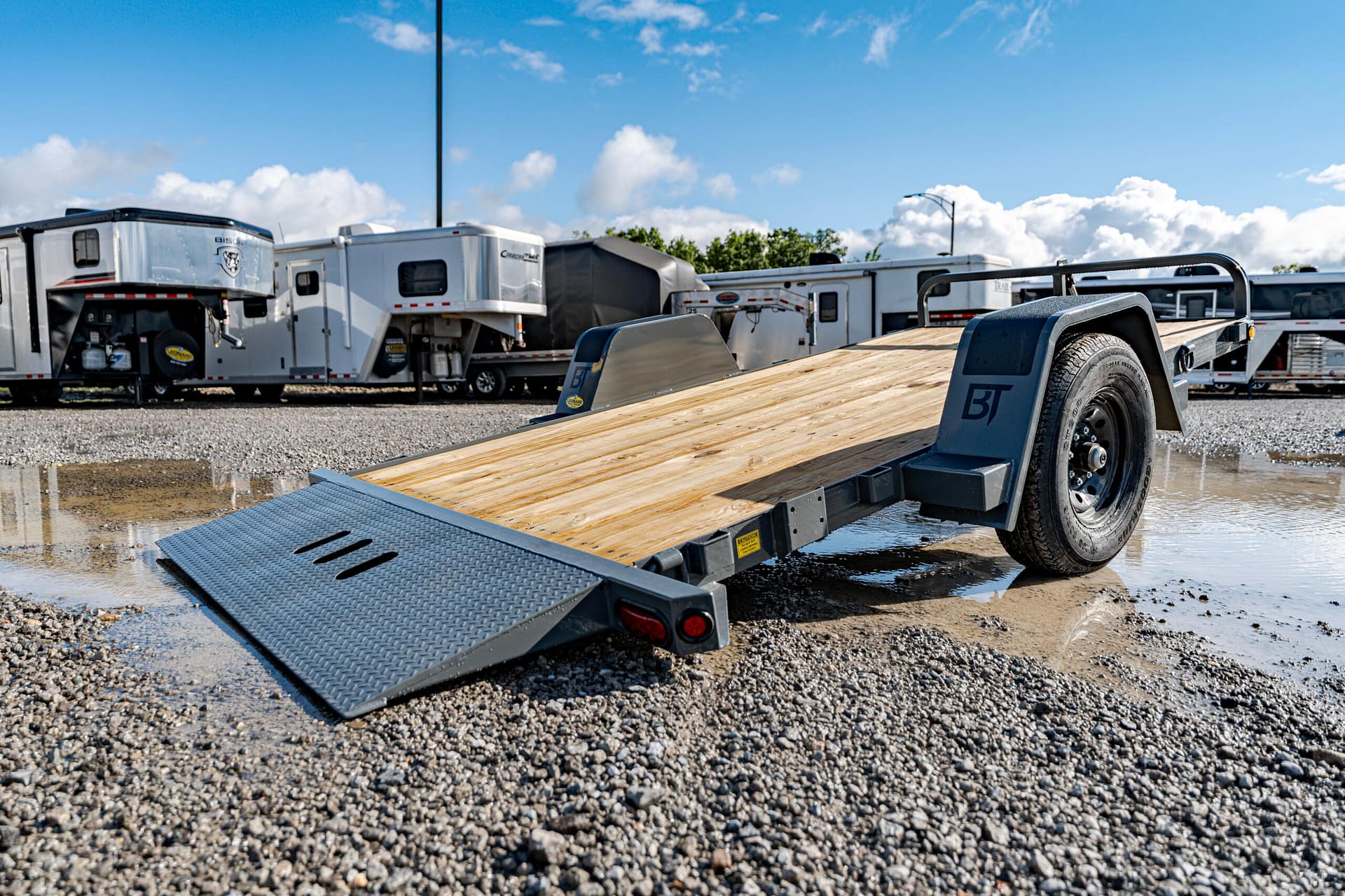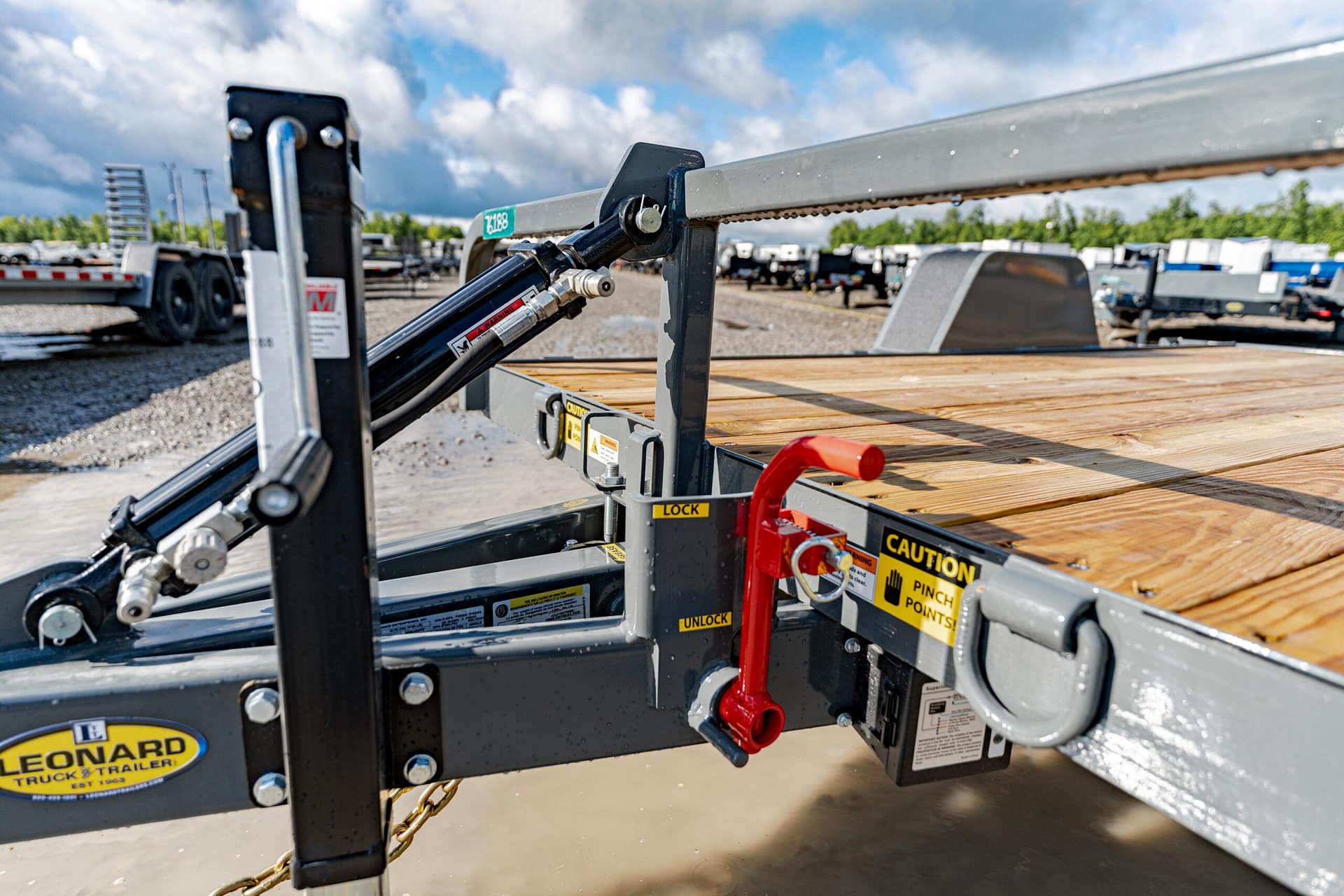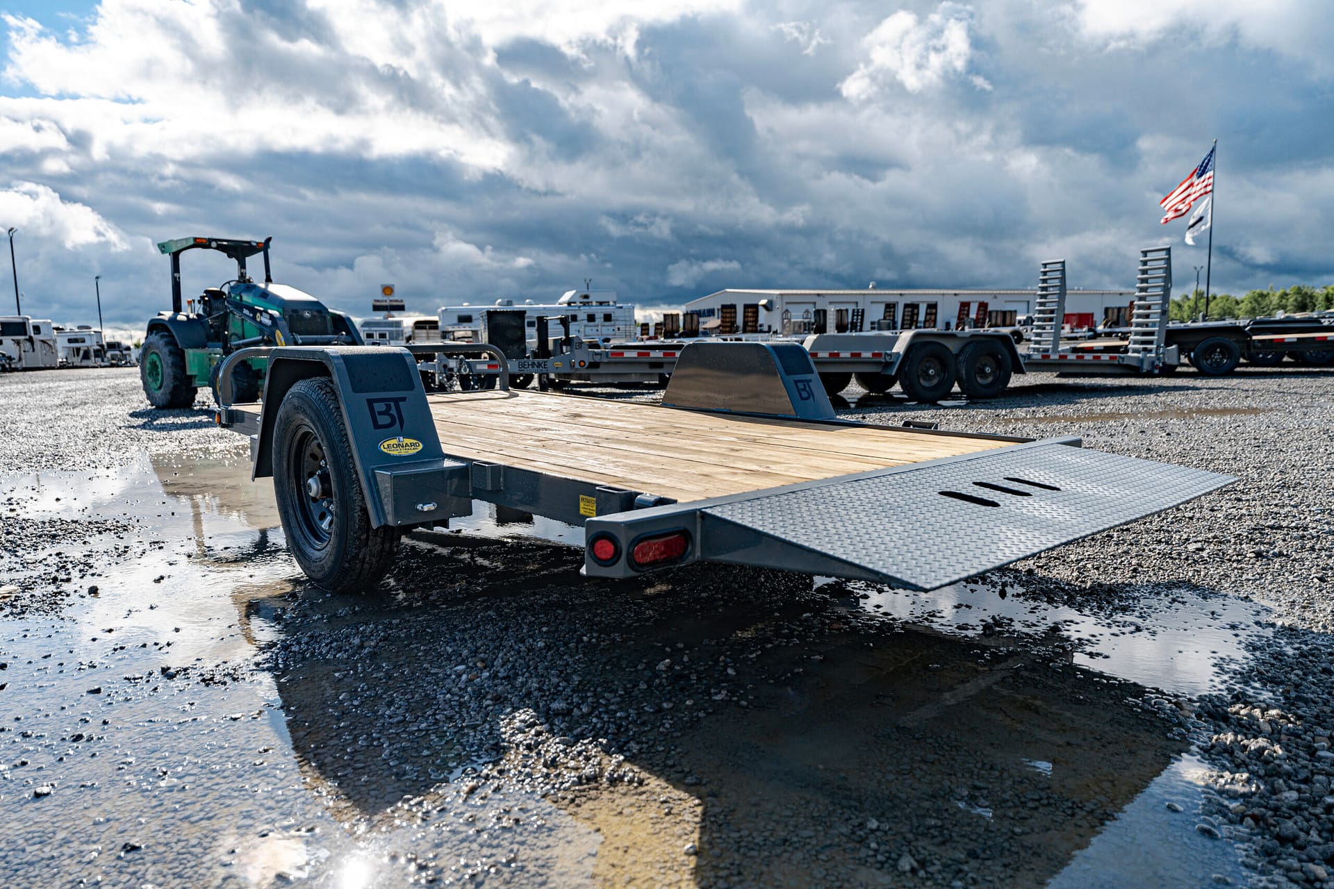 The full tilt features a single 5-7K axle with a 10-12′ tilt deck. Frame widths of 60-80”can be achieved between the fenders. These trailers are pull-type configurations with a cylinder, that pivots off of the tongue.