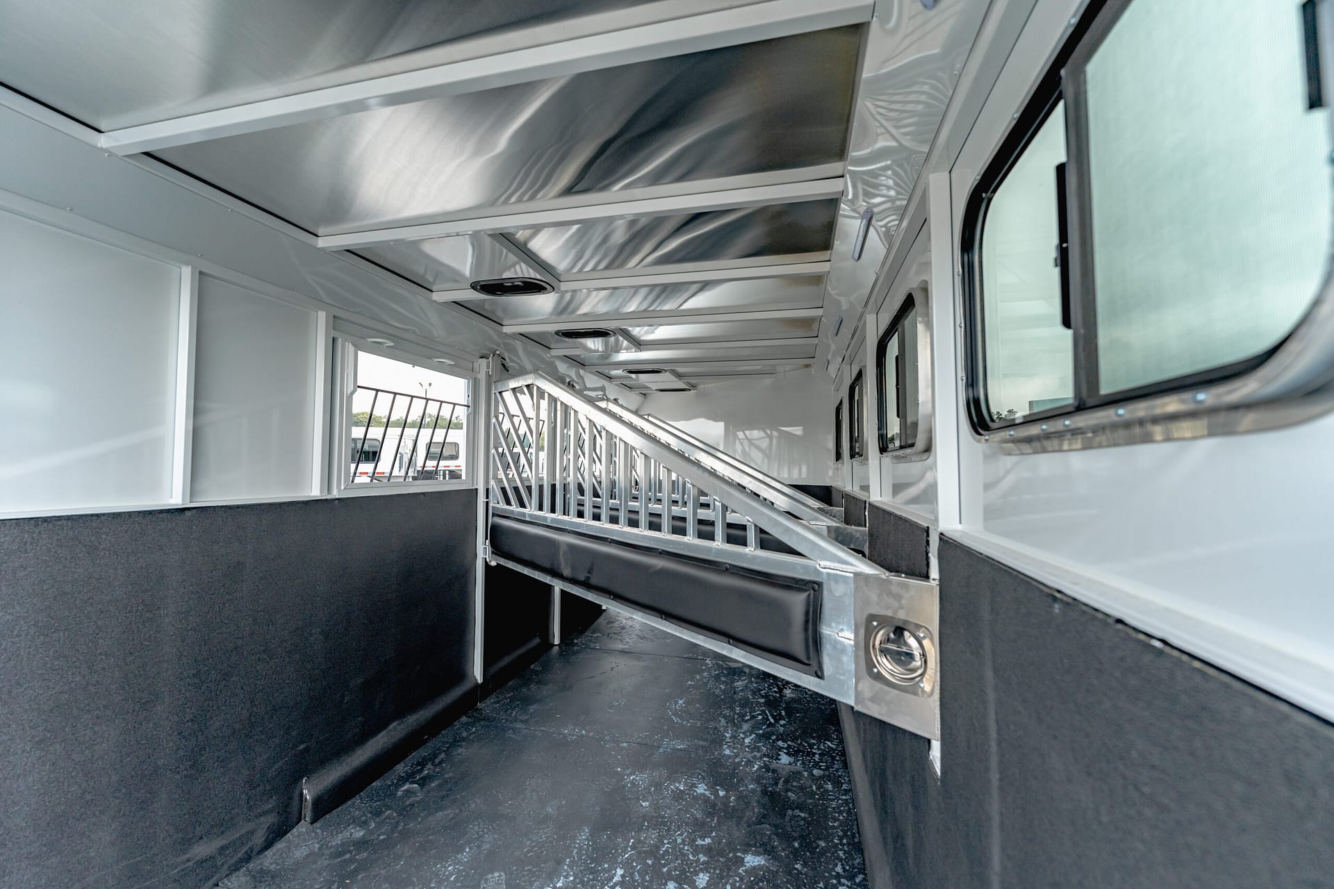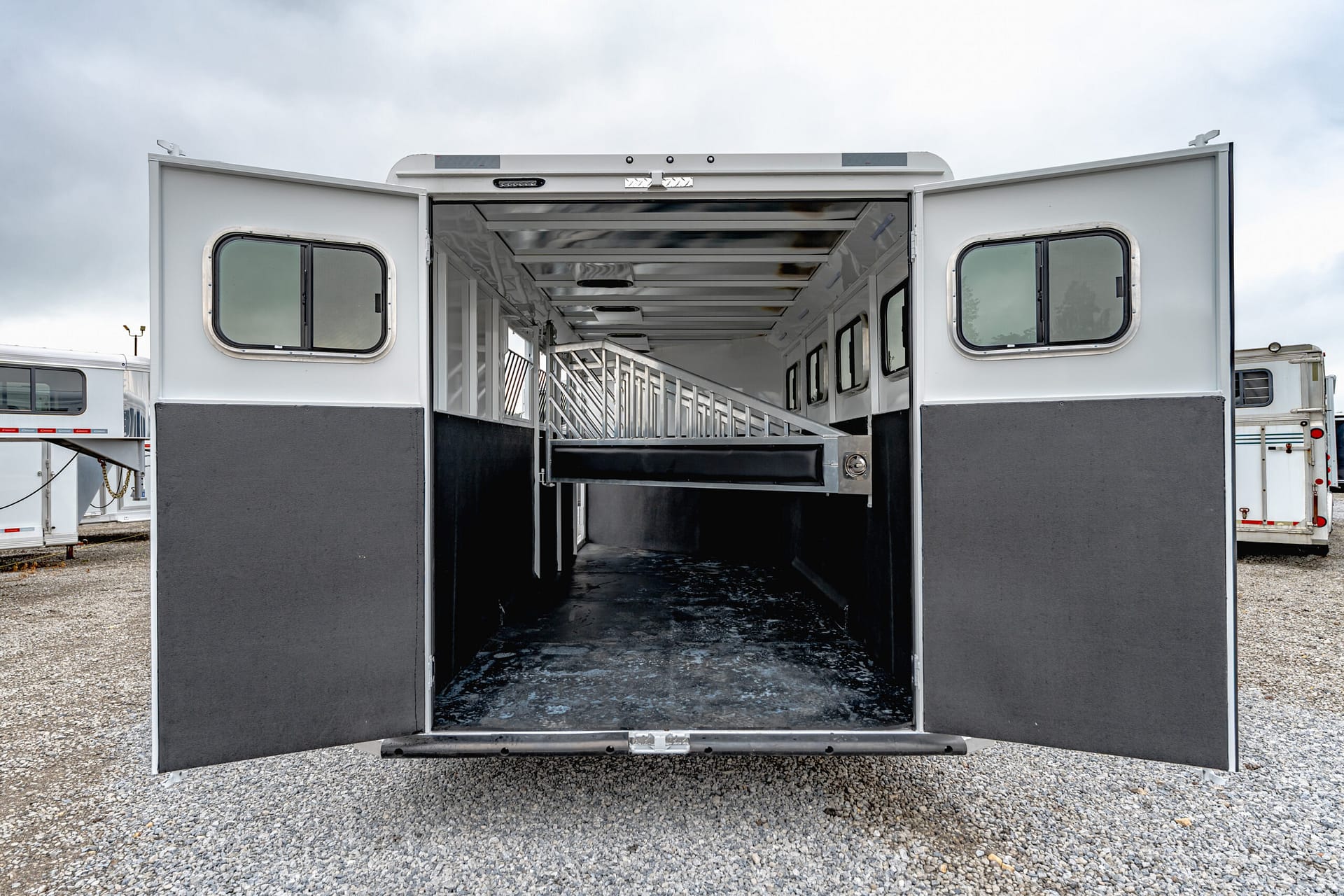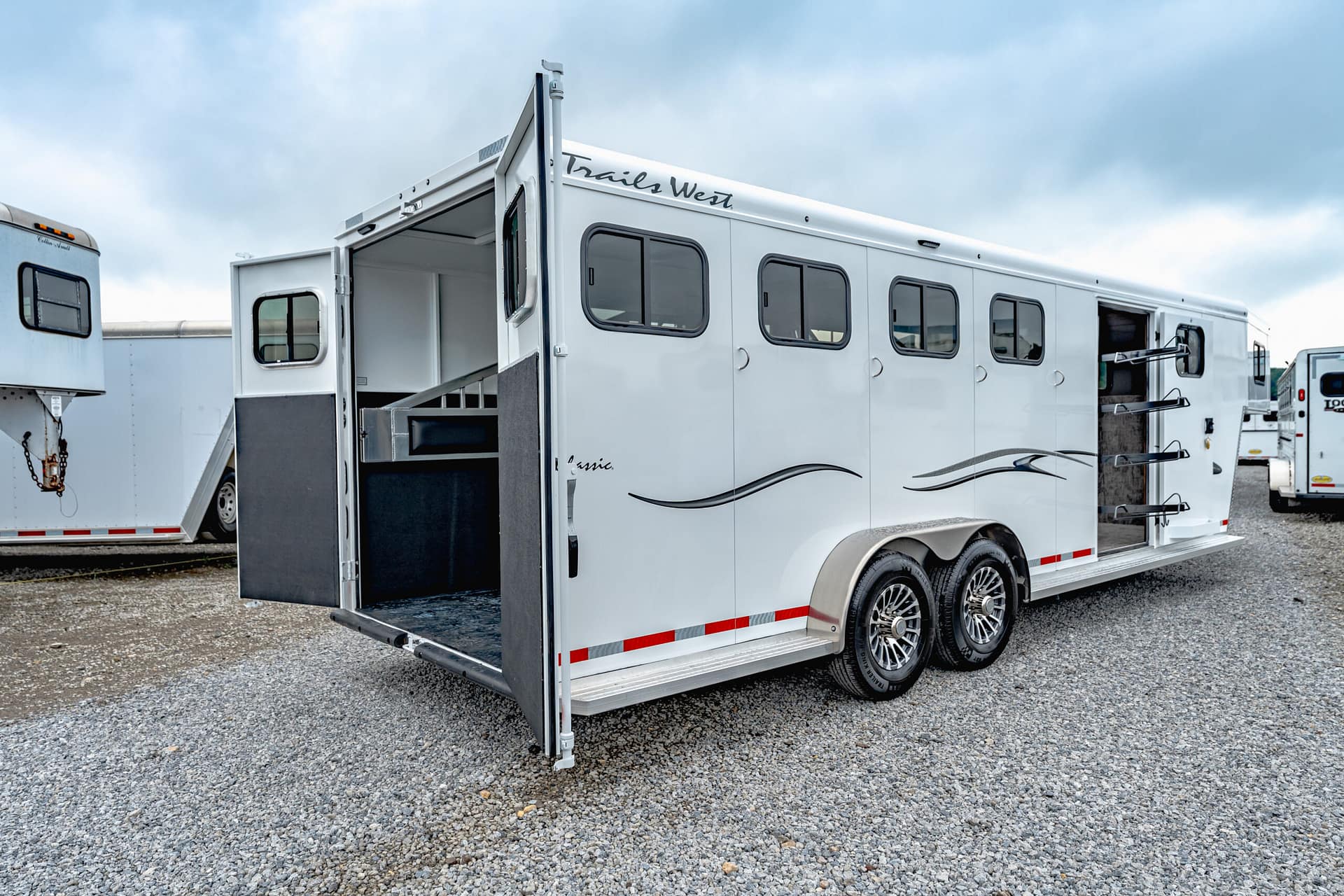 Our Classic model is constructed with a steel frame and aluminum skins. It’s 7’0″ wide, and 7’0″ tall and comes standard with custom drop-down feed doors with face grills on the head side, sliding windows on the tail side, and a roof vent in each stall. The large 41″ stalls provide plenty of room and comfort for your horse and feature the industry’s best slam latch divider system. The tack room is roomy and functional and features our state-of-the-art swing-out saddle and blanket racks.