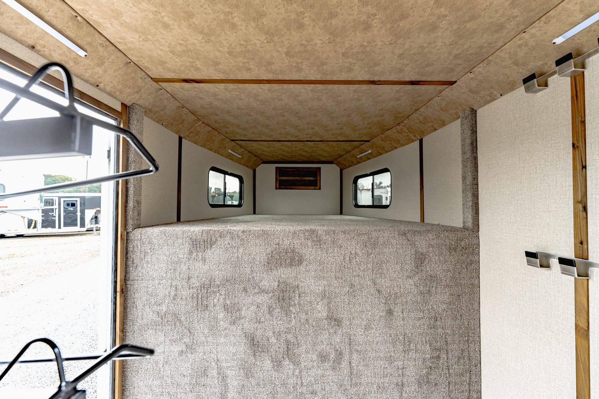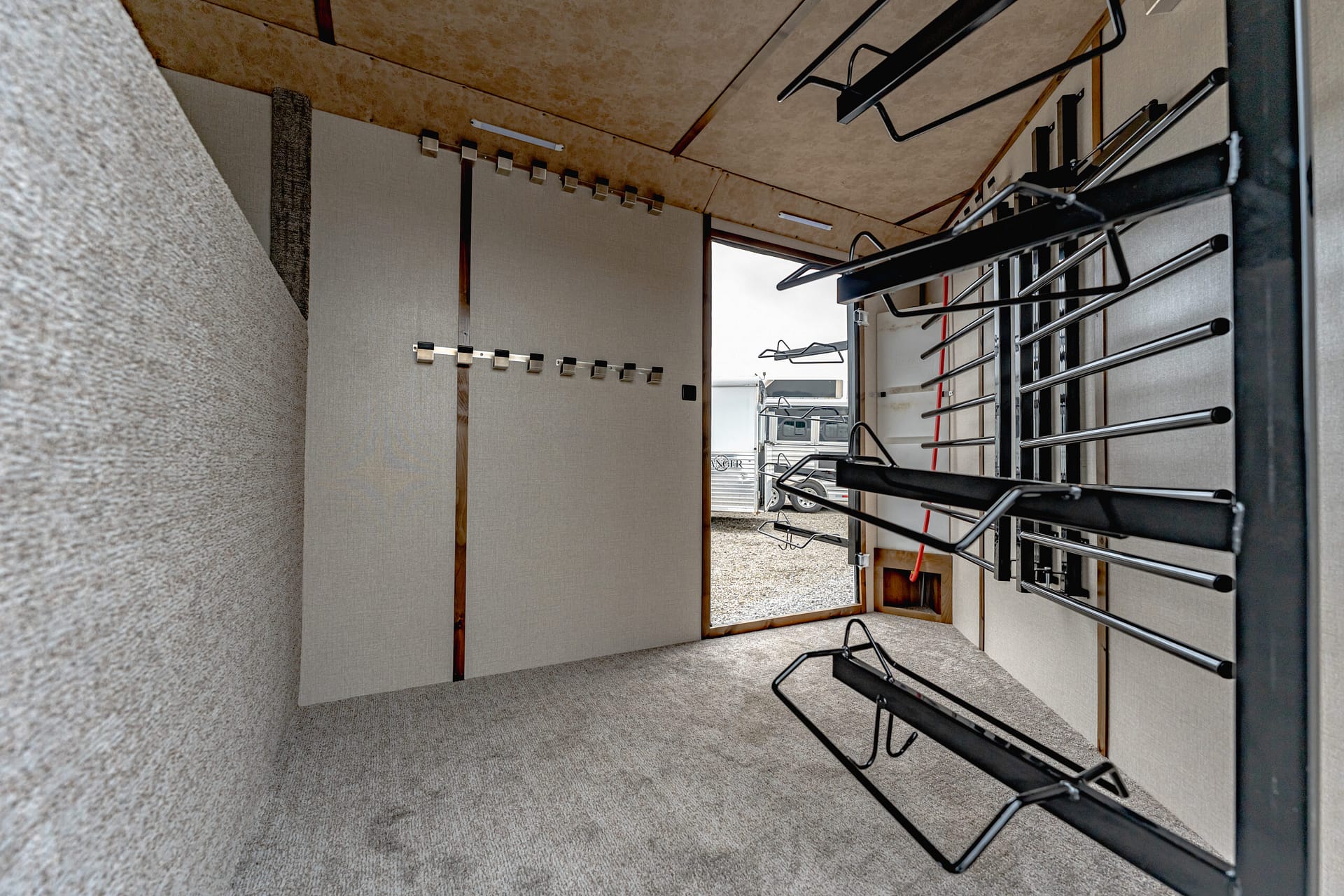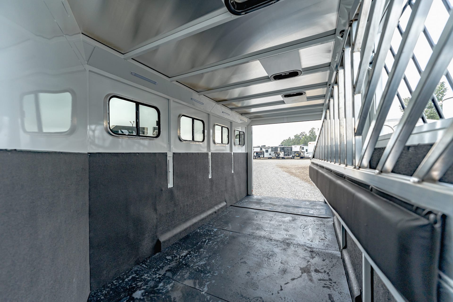 Our Classic model is constructed with a steel frame and aluminum skins. It’s 7’0″ wide, and 7’0″ tall and comes standard with custom drop-down feed doors with face grills on the head side, sliding windows on the tail side, and a roof vent in each stall. The large 41″ stalls provide plenty of room and comfort for your horse and feature the industry’s best slam latch divider system. The tack room is roomy and functional and features our state-of-the-art swing-out saddle and blanket racks.