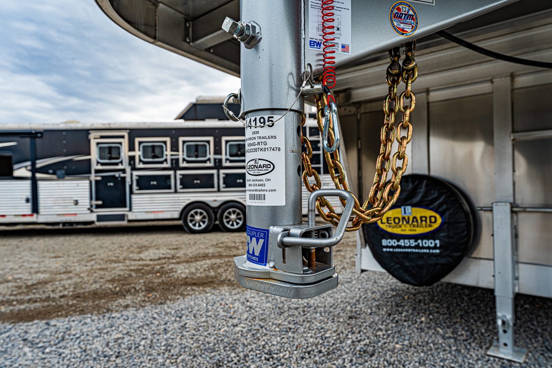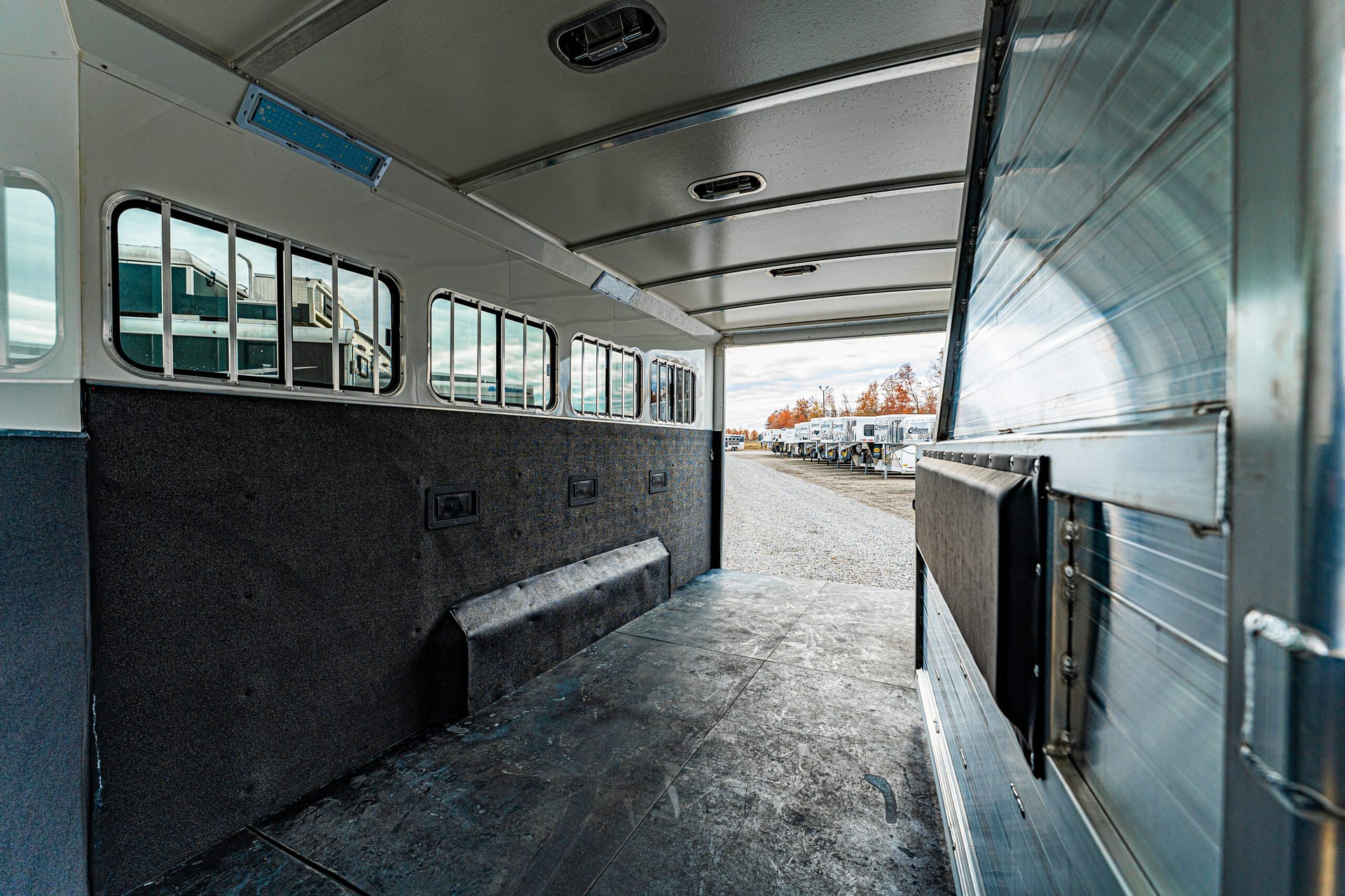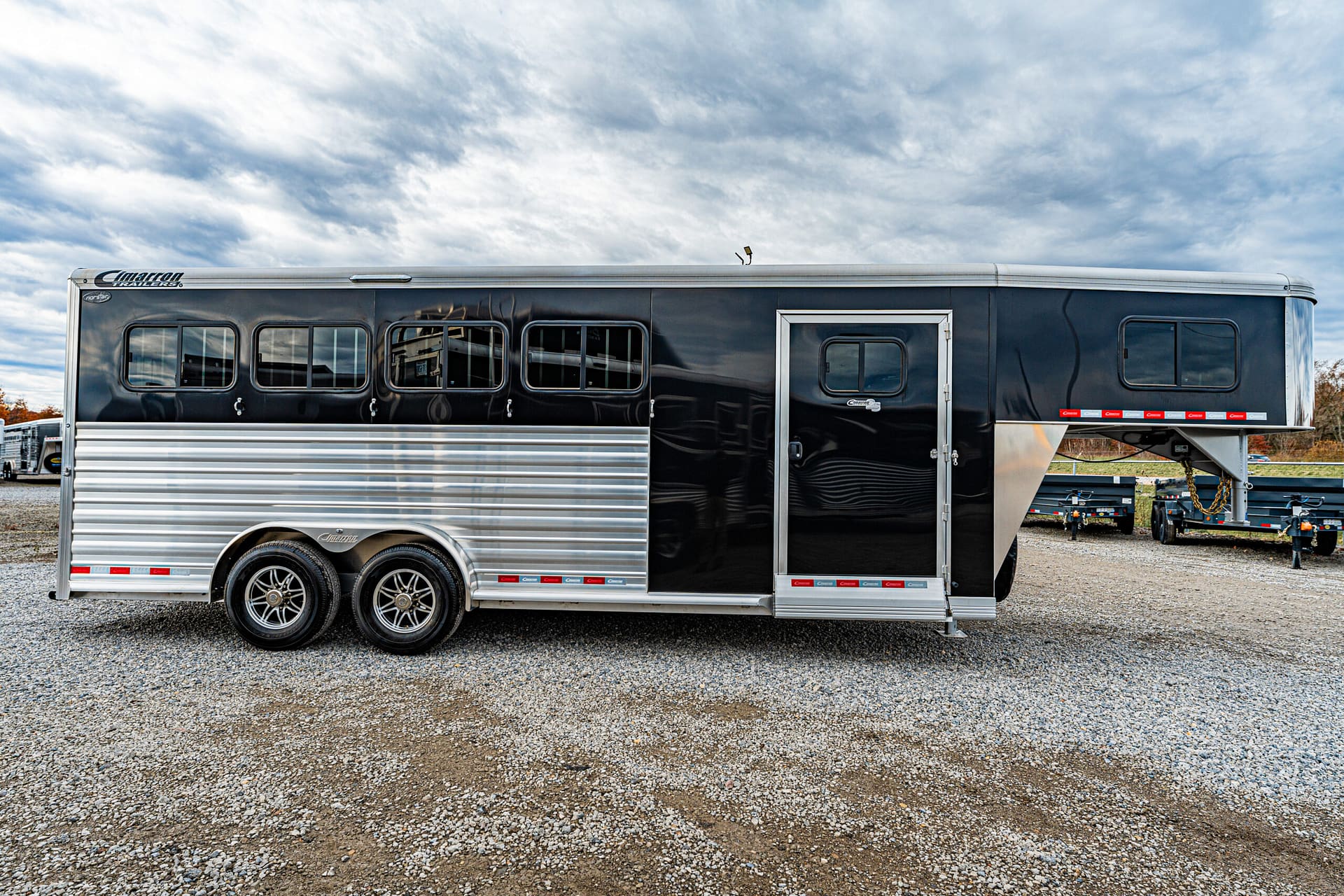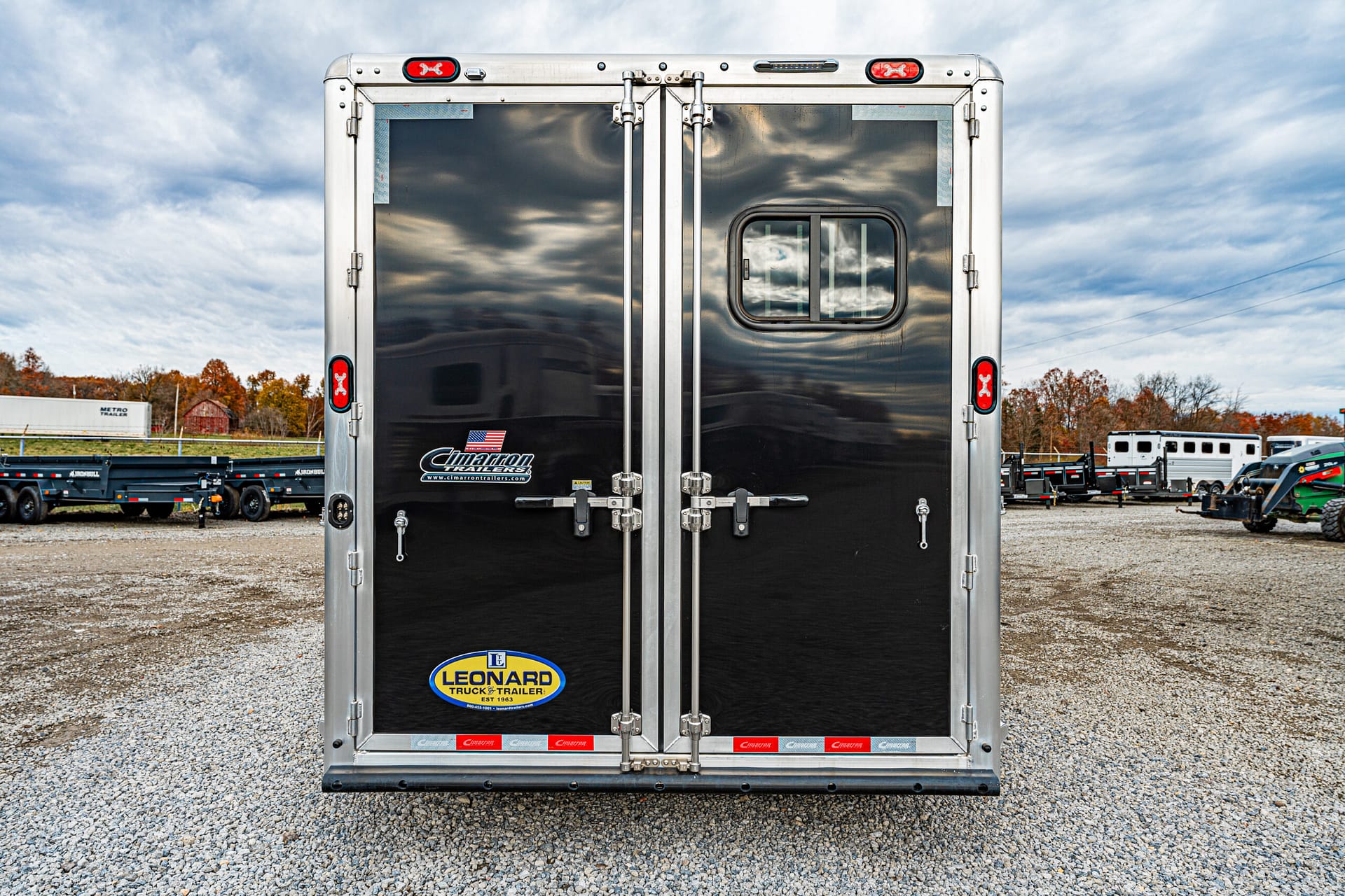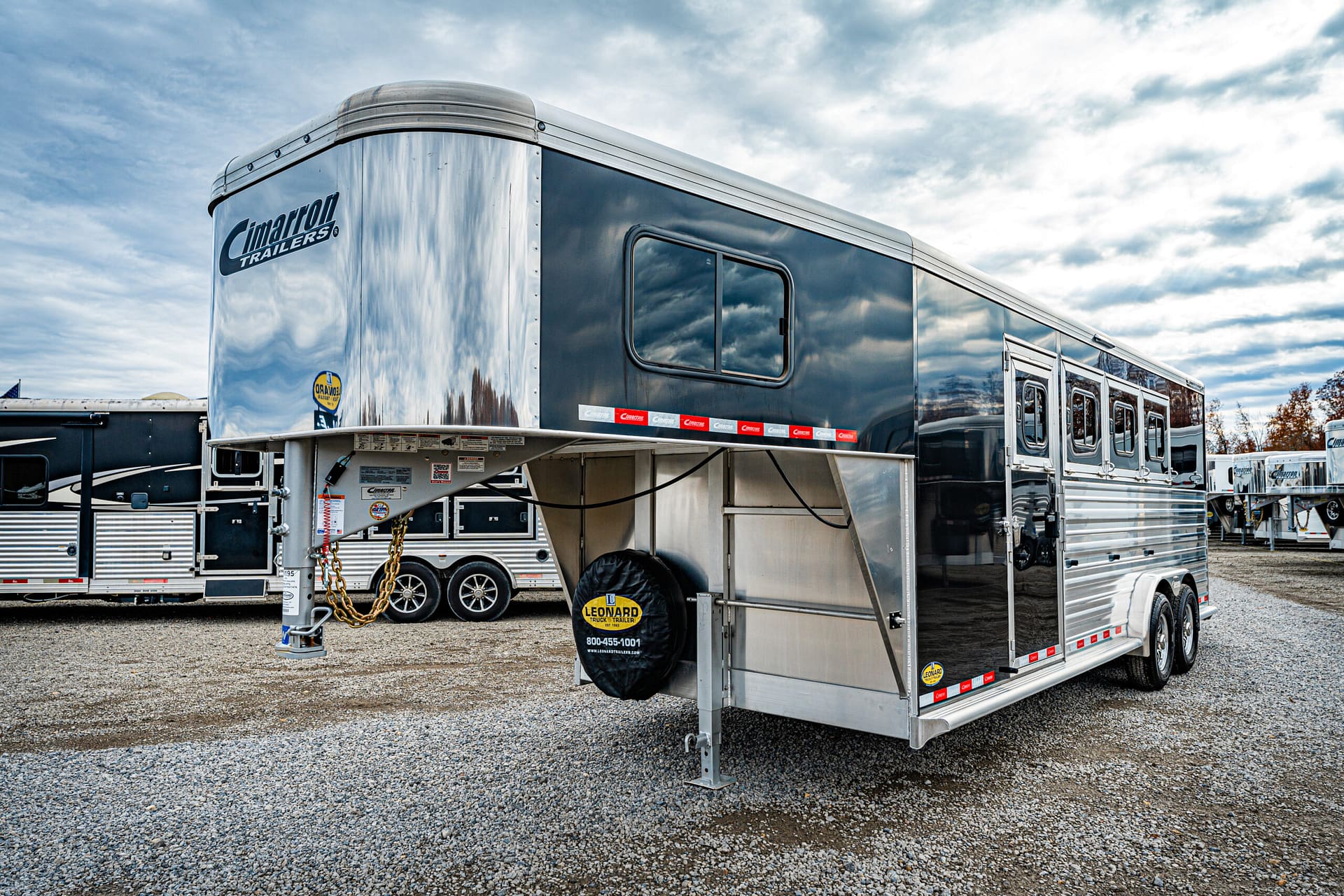 2026 New Cimarron Norstar gooseneck stock trailer. Drive train 7,000# Dexter torsion axles -extruded side slats at stall area, lower body running boards are full length, led awning lights, solid partition wall, full height and width of front tack wall, primary door front tack room door 42” wide, carpet floor, GN wall and GN deck, sliding type of windows for front tack, swing around doors above in stall area, head side fold down type with safety bars feed doors, full center gate -bars above, , 2 partial dividers, swinging solid type for head grills, dome lights, adjustable saddle rack, added recessed paddle latch on side access door, window slider 19×34 in stall area, -in partition wall 54” from floor, centered, extra divider location, straight load to move both dividers to LH side wall. Call for more details!!