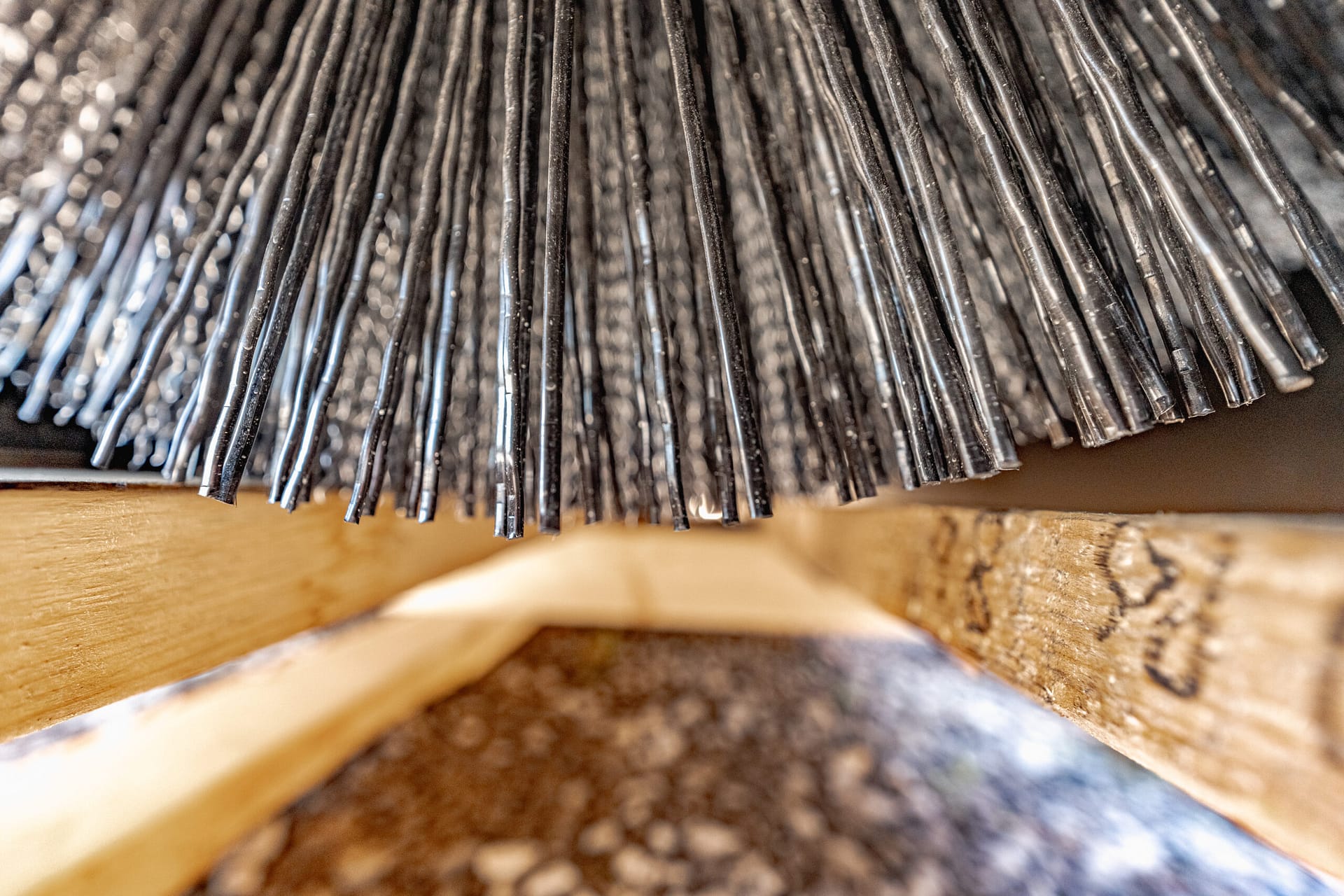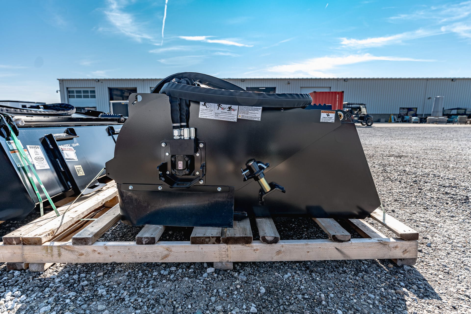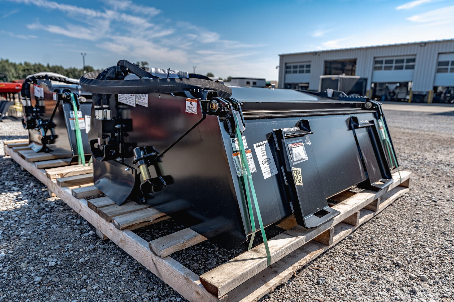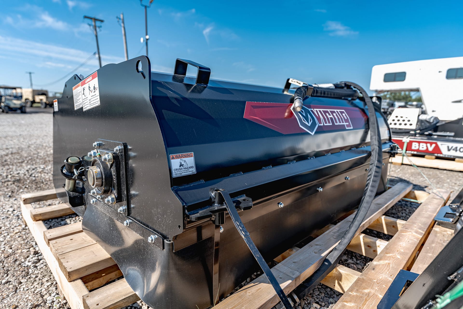 Direct drive motor with relief valve protection. Recessed and guarded motor. Oversized 2” greaseable bearing. Pin adjustment system to quickly set bristle height. HD bucket with wear bars & bolt on edge. Replace wafers easily without disconnecting hoses. Standard with poly/wire wafers.
