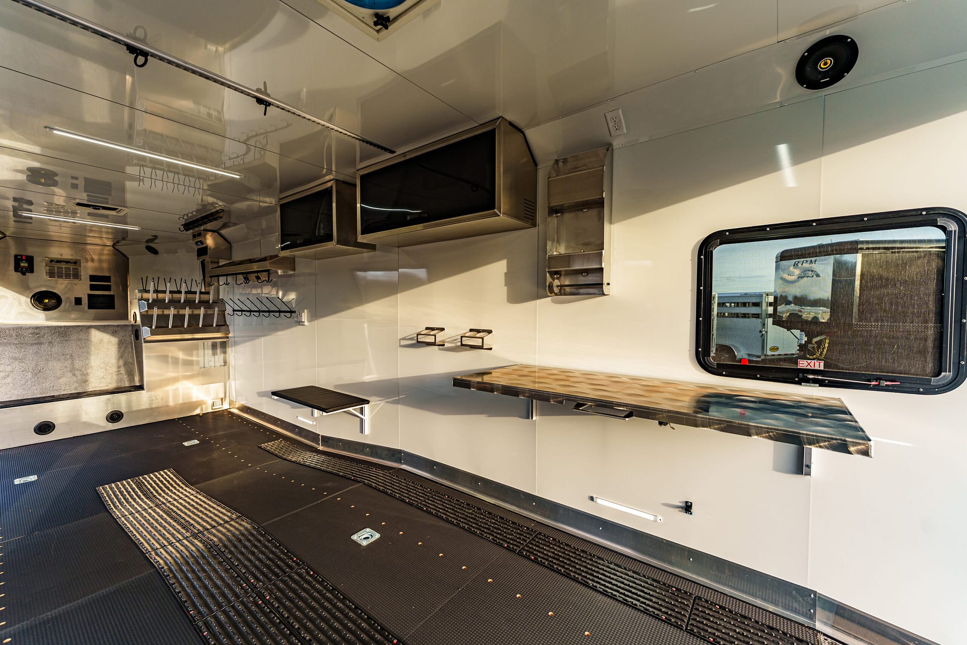 Convenience & Storage: Helmet/oil shelf, coat hooks, cup holders, fold-down benches, extra shelving with USB ports, paper towel rack, and onesie rack
