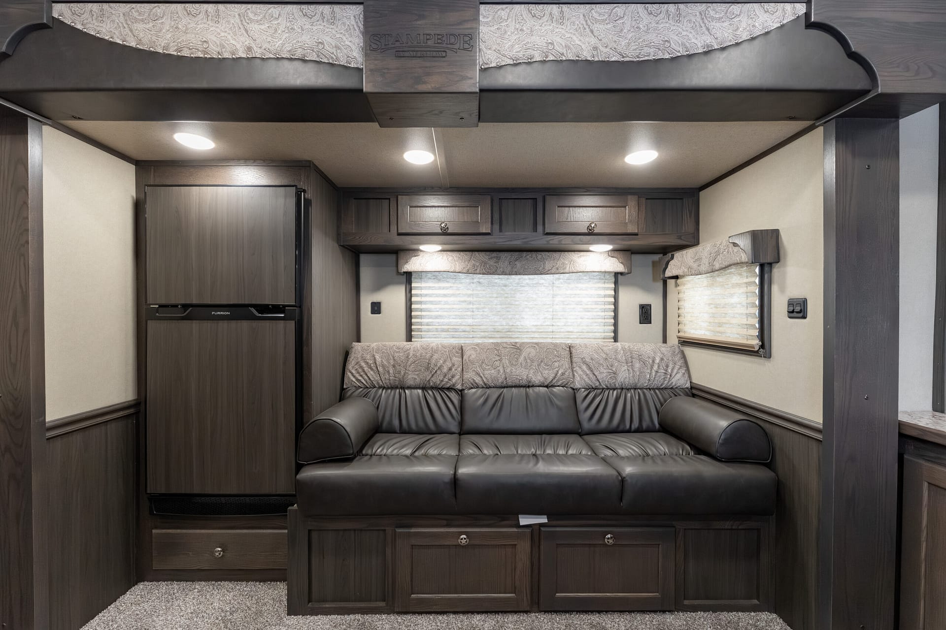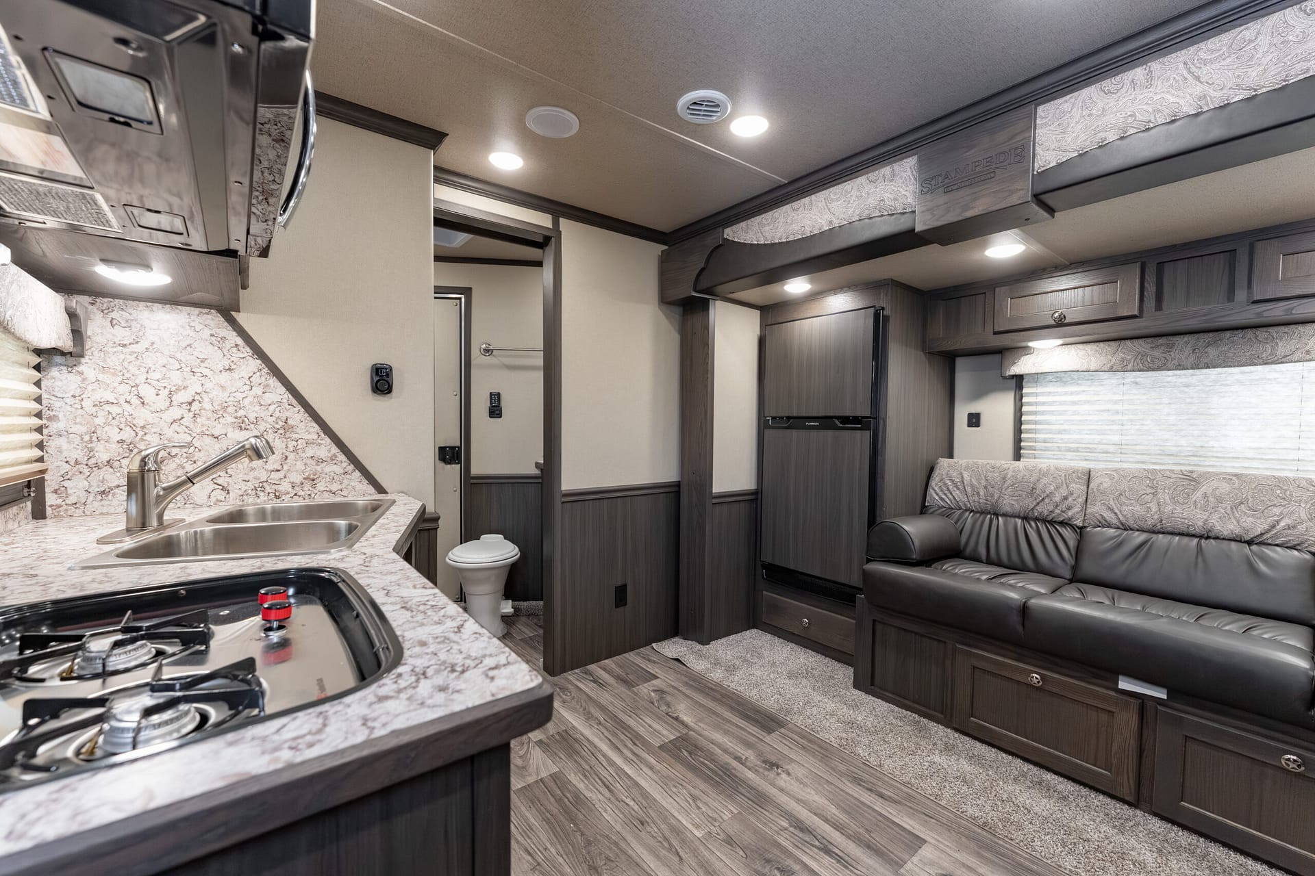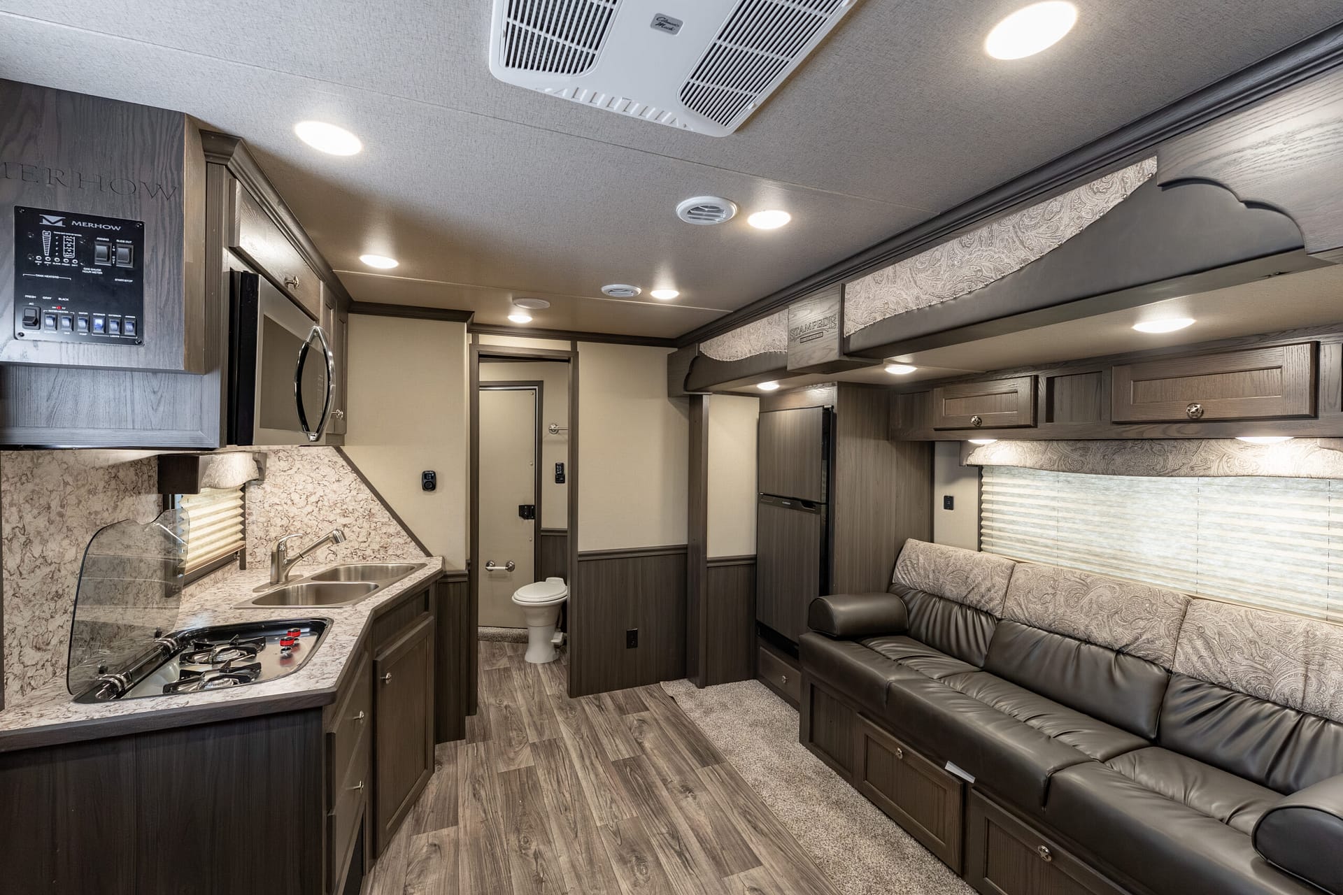 The Stampede by Merhow is LOADED with standard features! The trailer offers the same Super-Structure as our Next Generation, the same 2/8 MFG warranty with an economically-built interior that offers premium vinyl with hardwood fascia and cabinet doors that will WOW you at first glance!