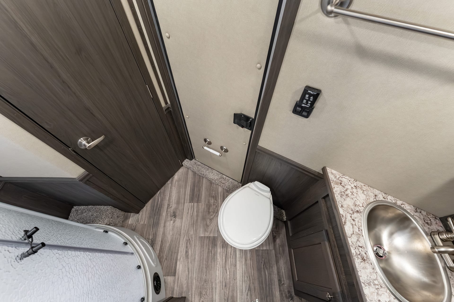 White shower pan with opaque door, foot flush RV toilet