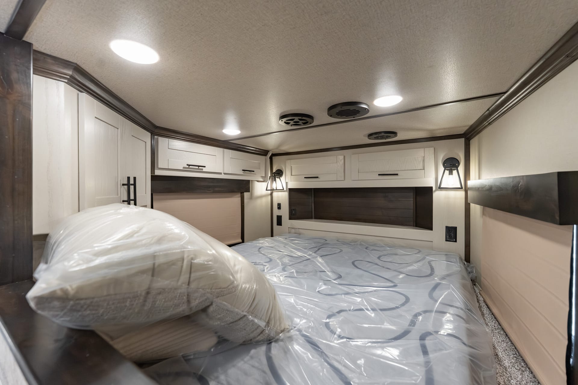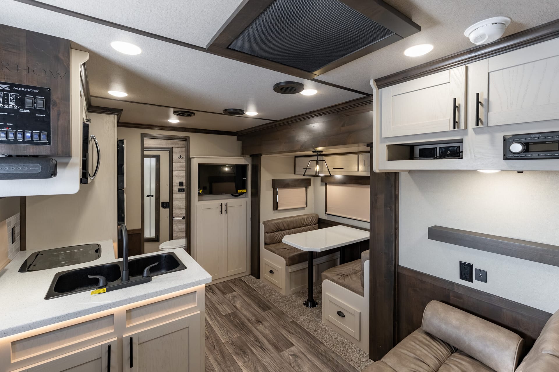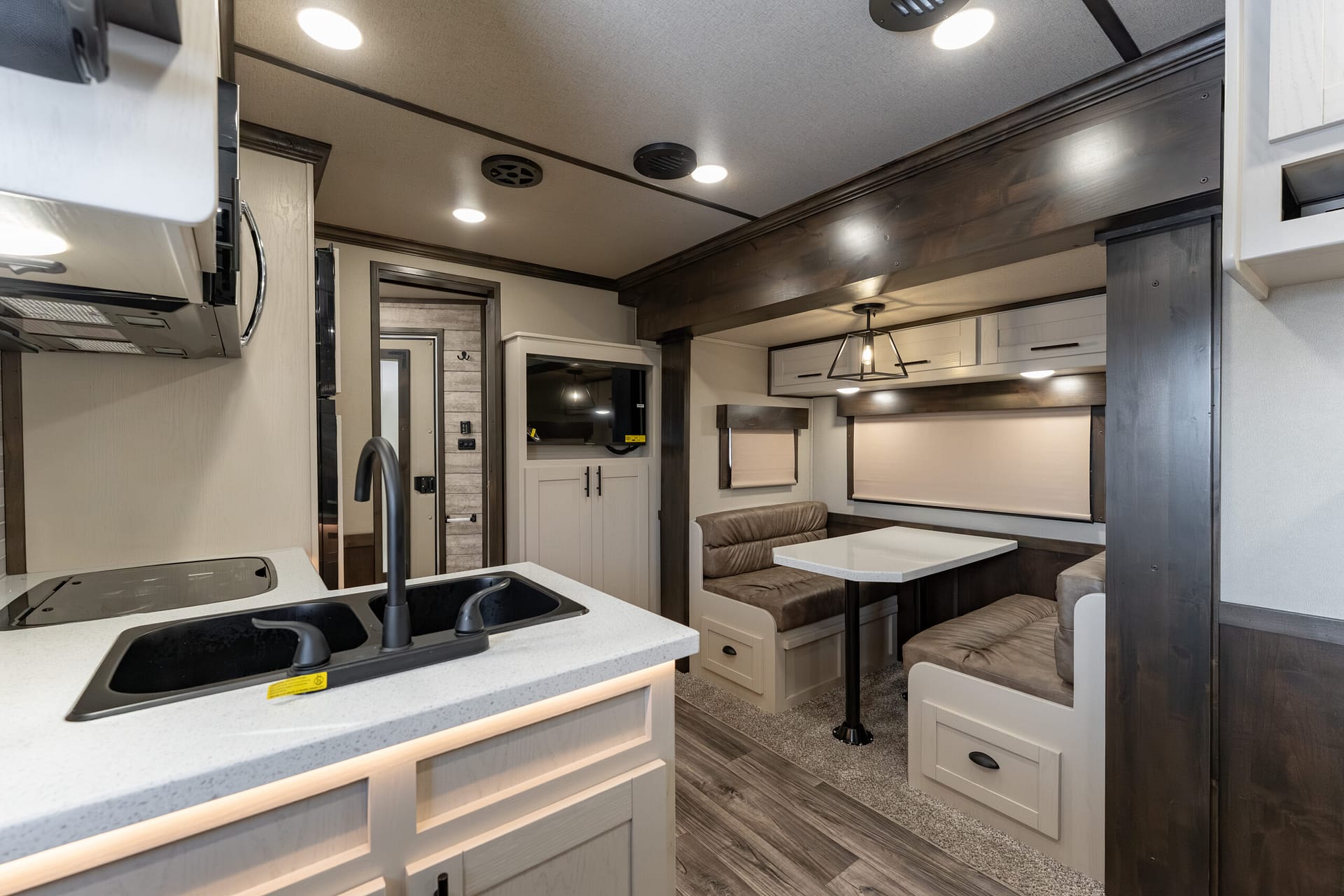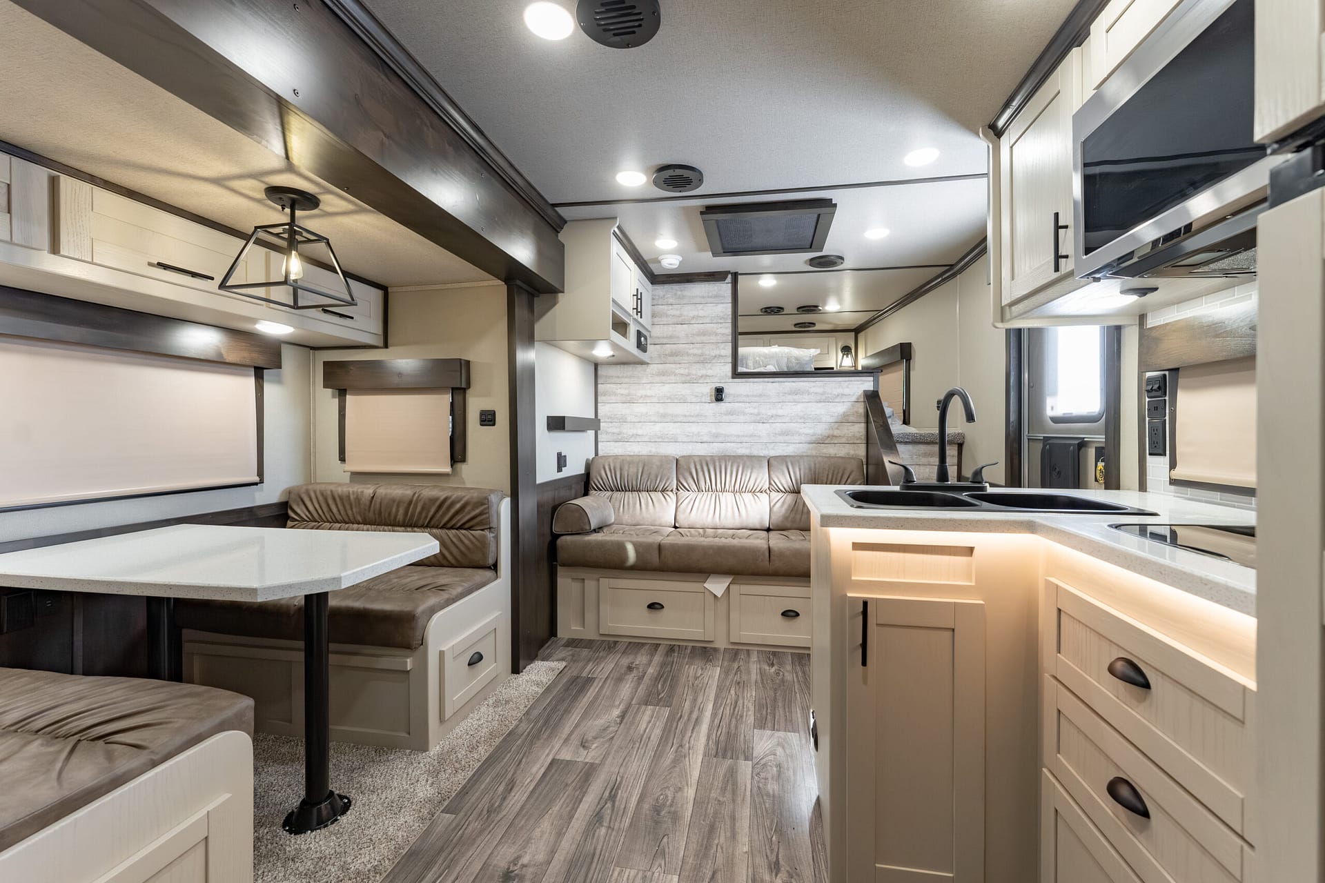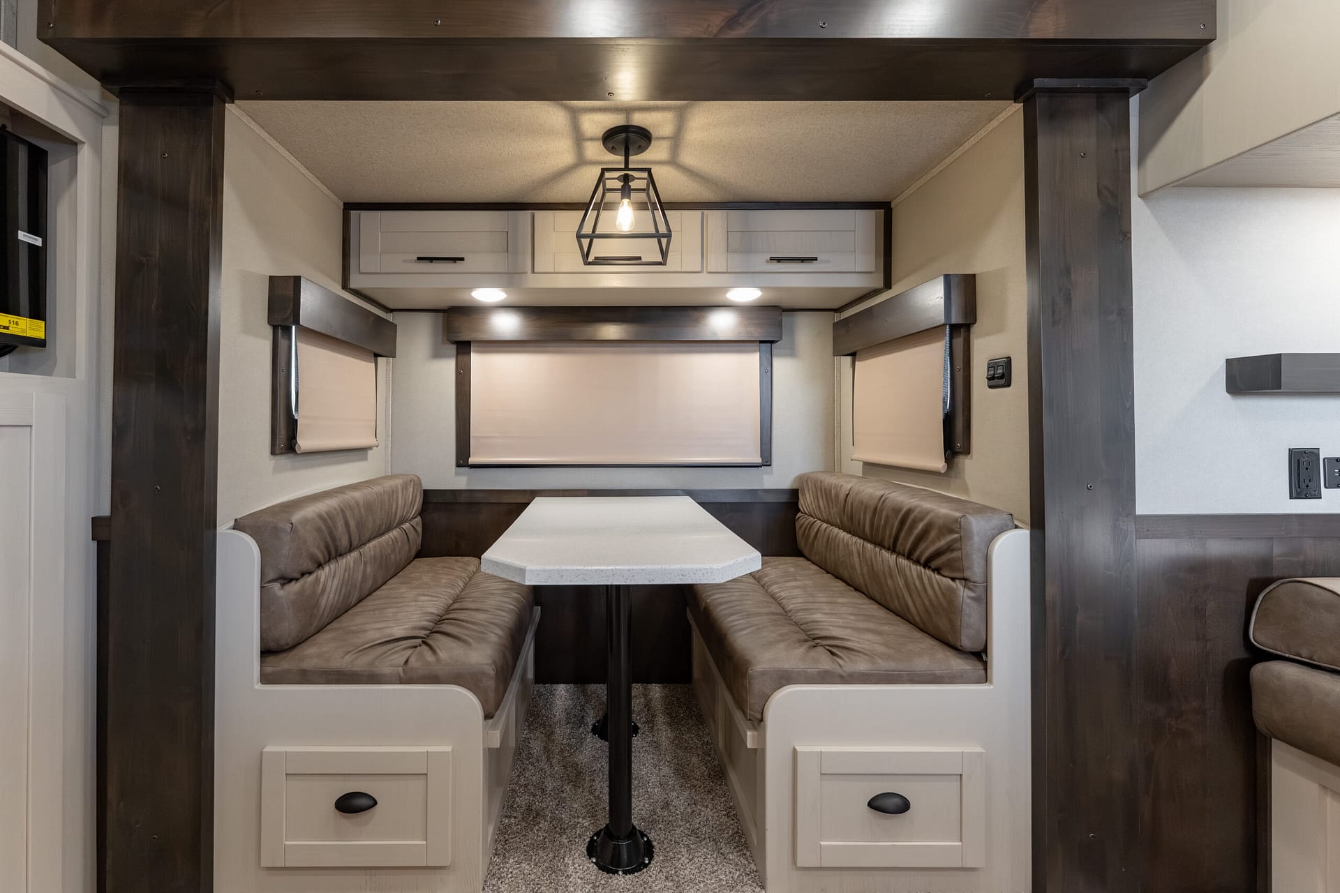 Farmhouse-style lighting (sconce lights at bunk; cage-style light above dinette)