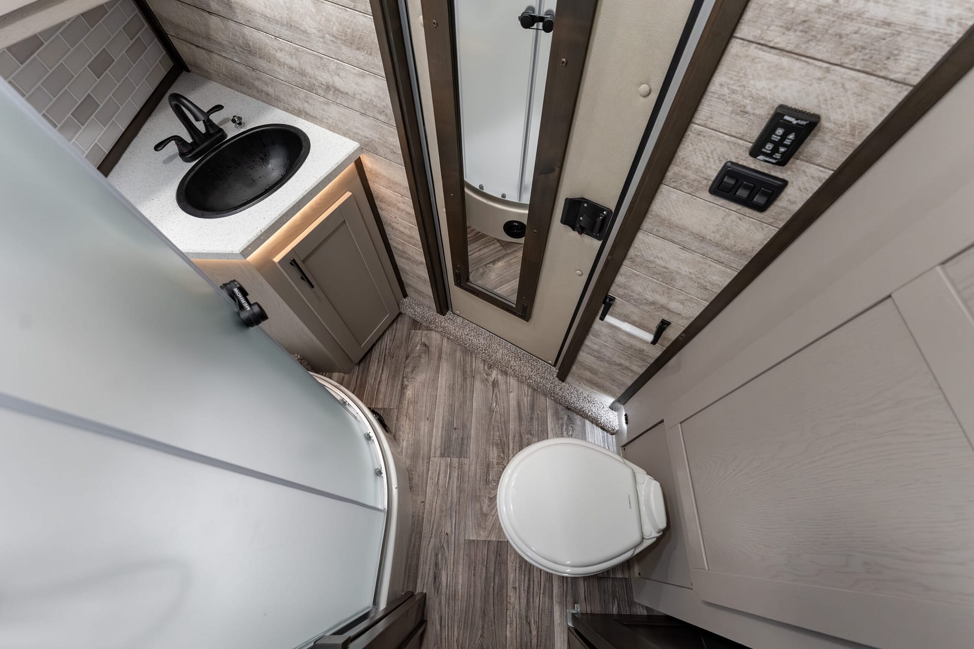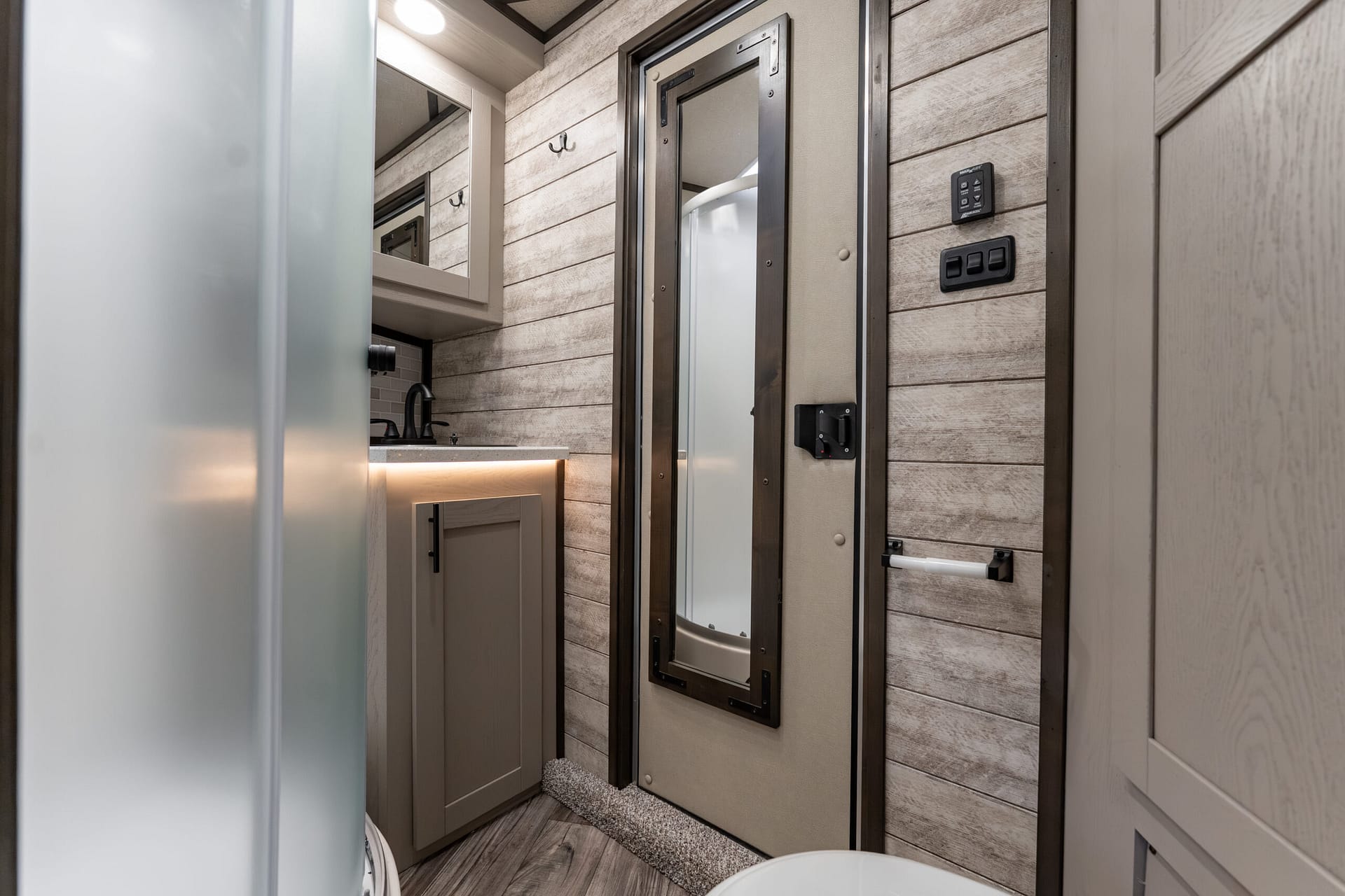 Shiplap accents (bath slant wall & LQ riser wall)