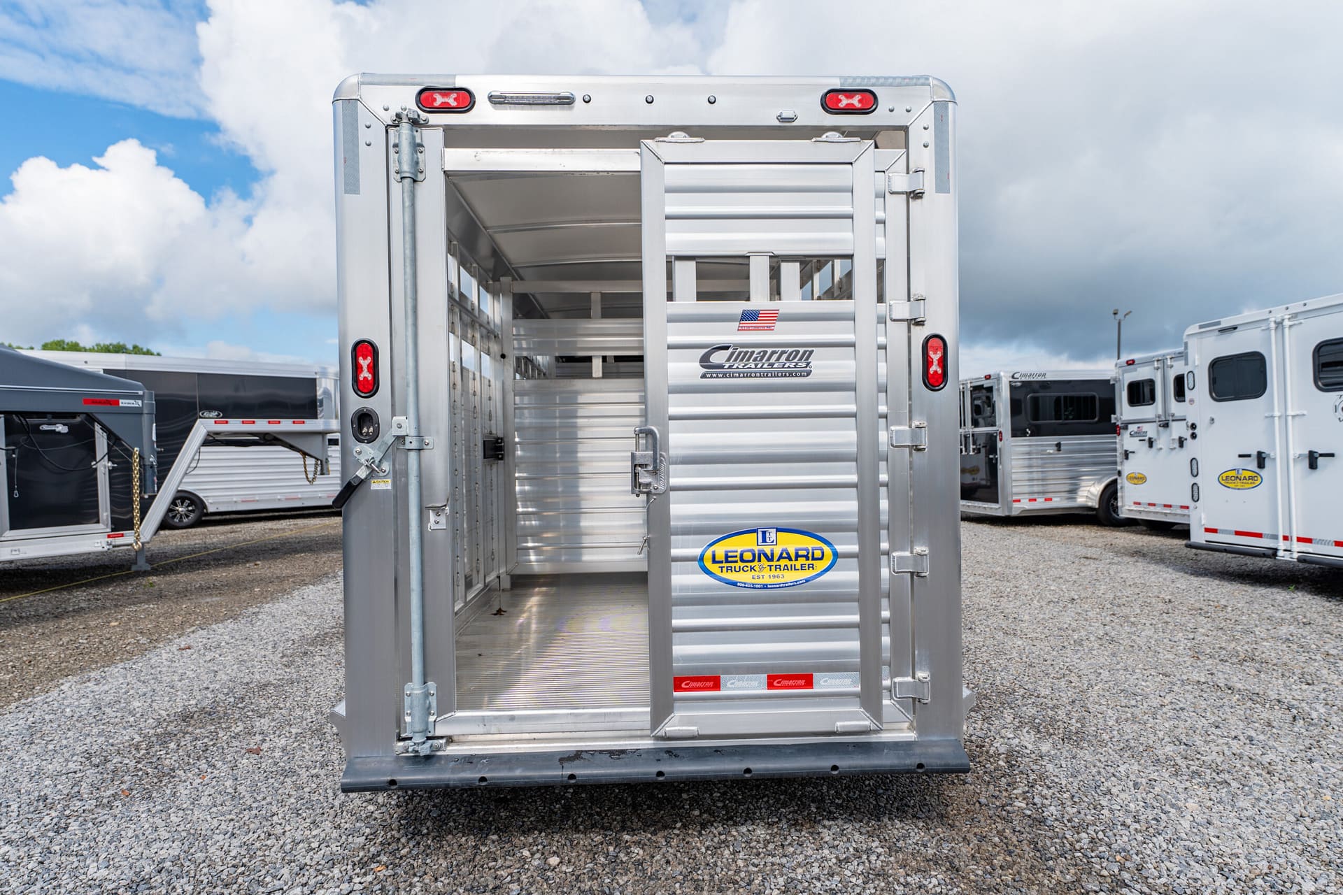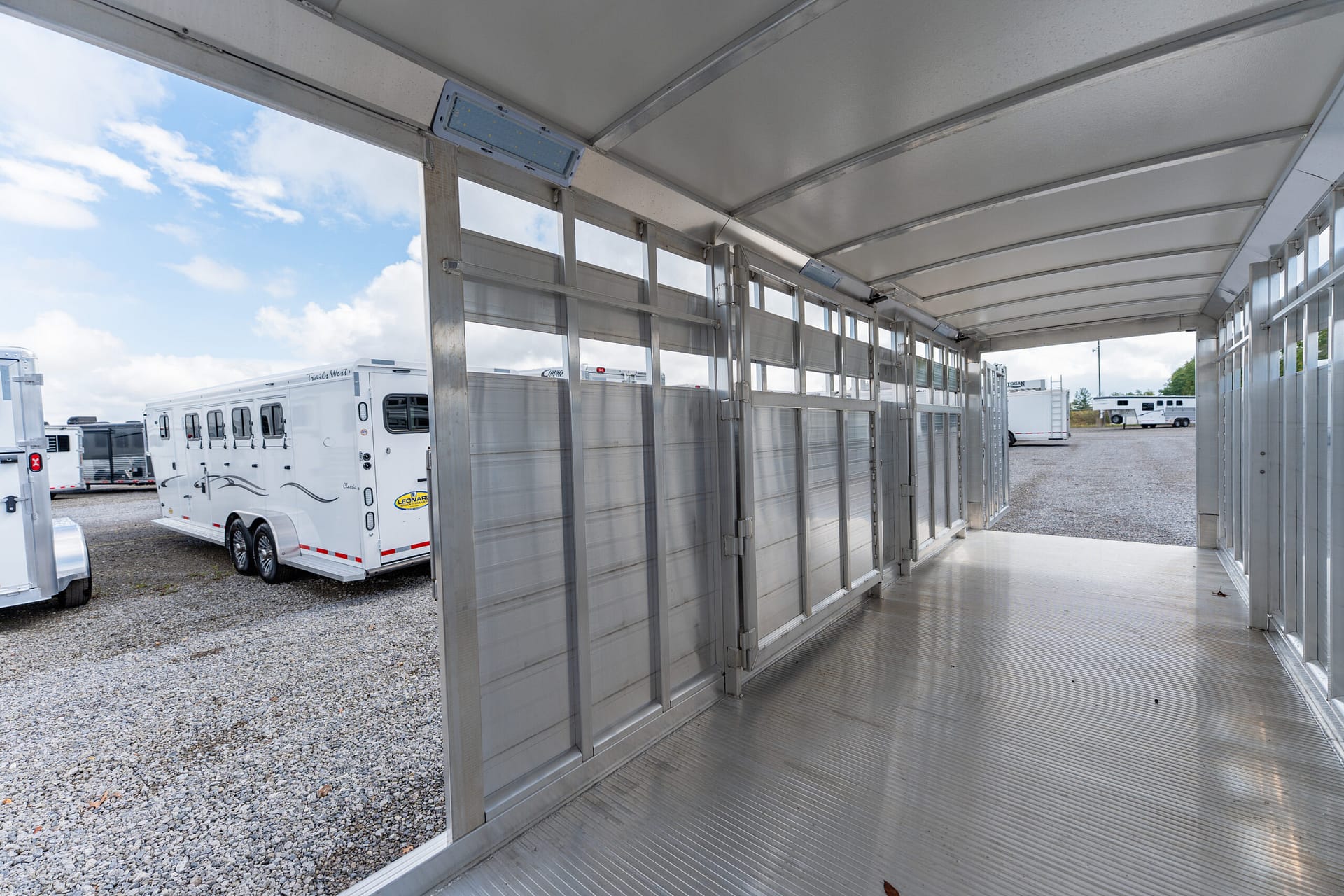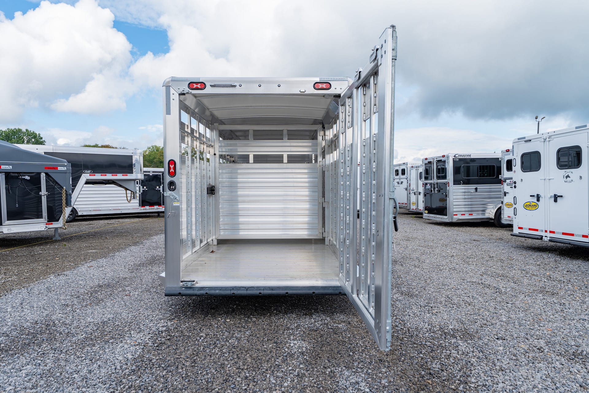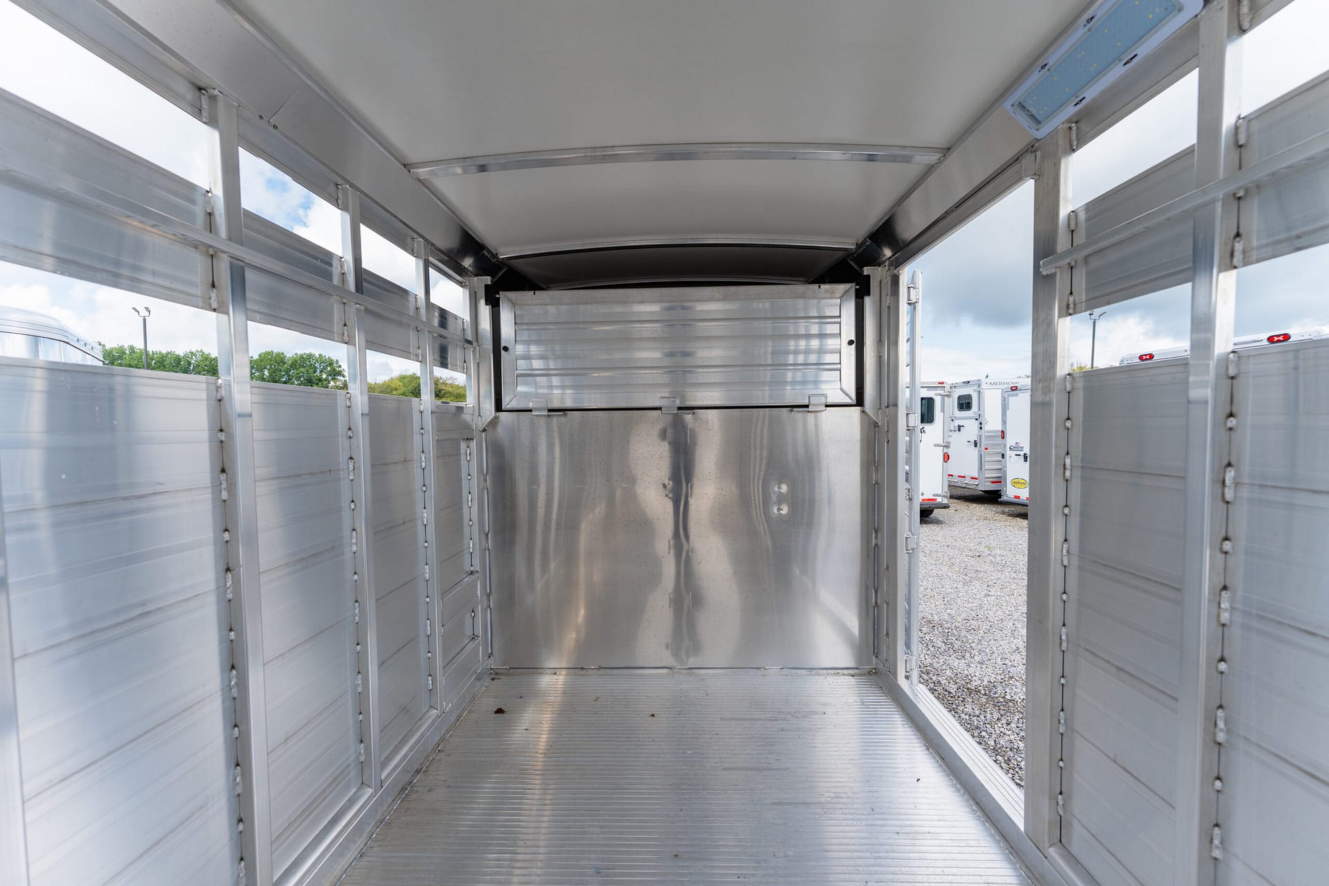 This stock combo trailer has extruded aluminum flooring with mats, side slat aluminum walls with plexiglass inserts and a full swing center gate. The dress in this stock trailer is a full wall with bridle hooks, clothes bars, saddle racks and a brush tray. This unit also has a full swinging rear door with a slider.