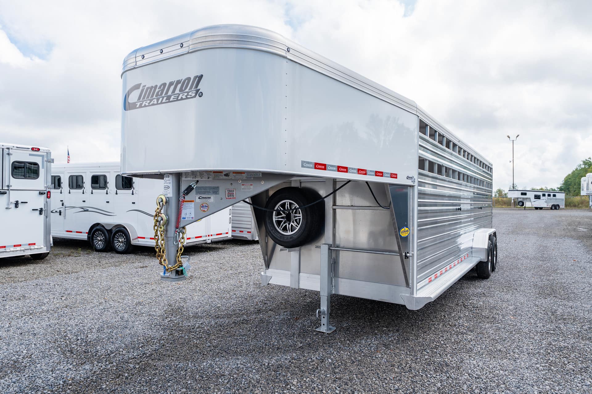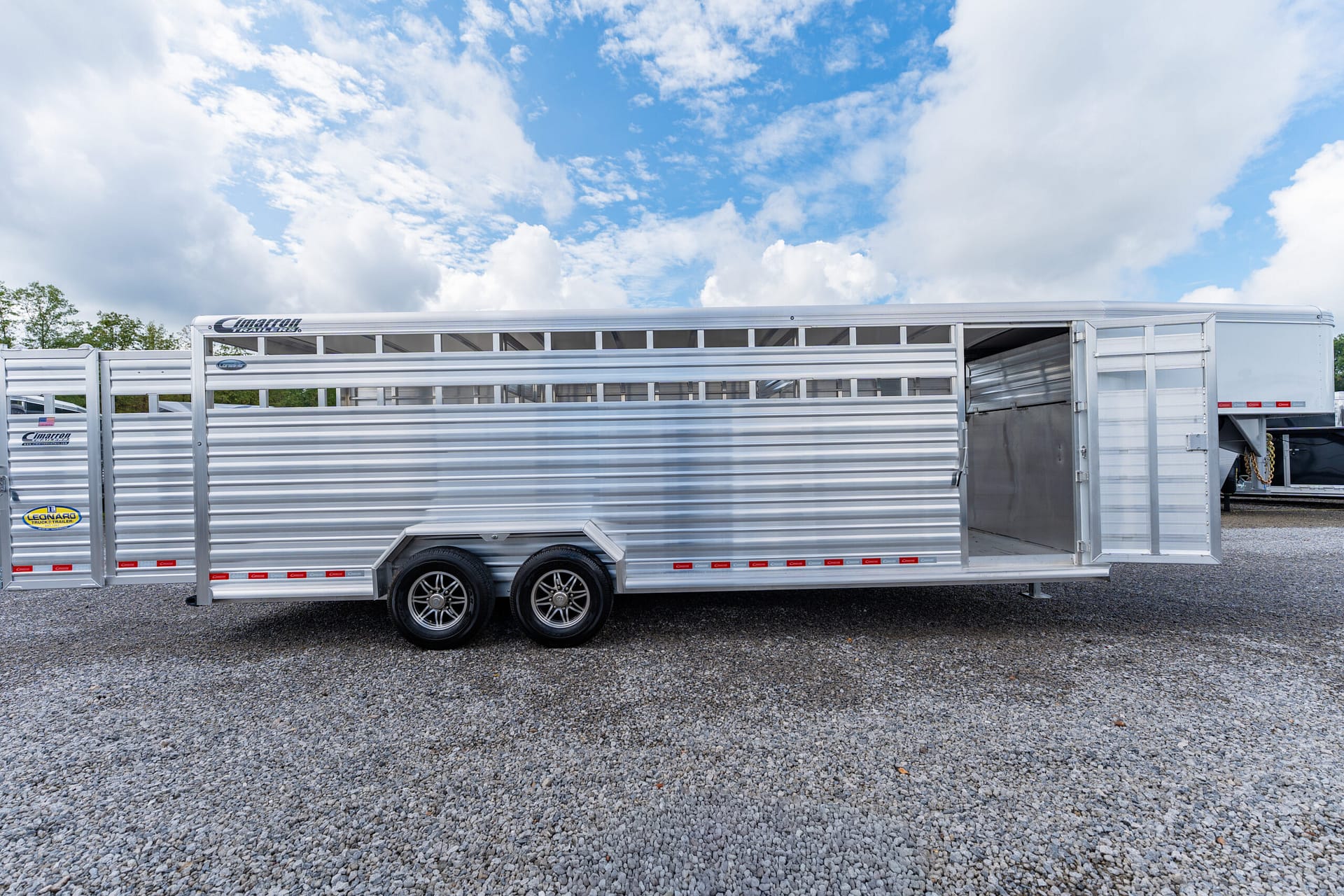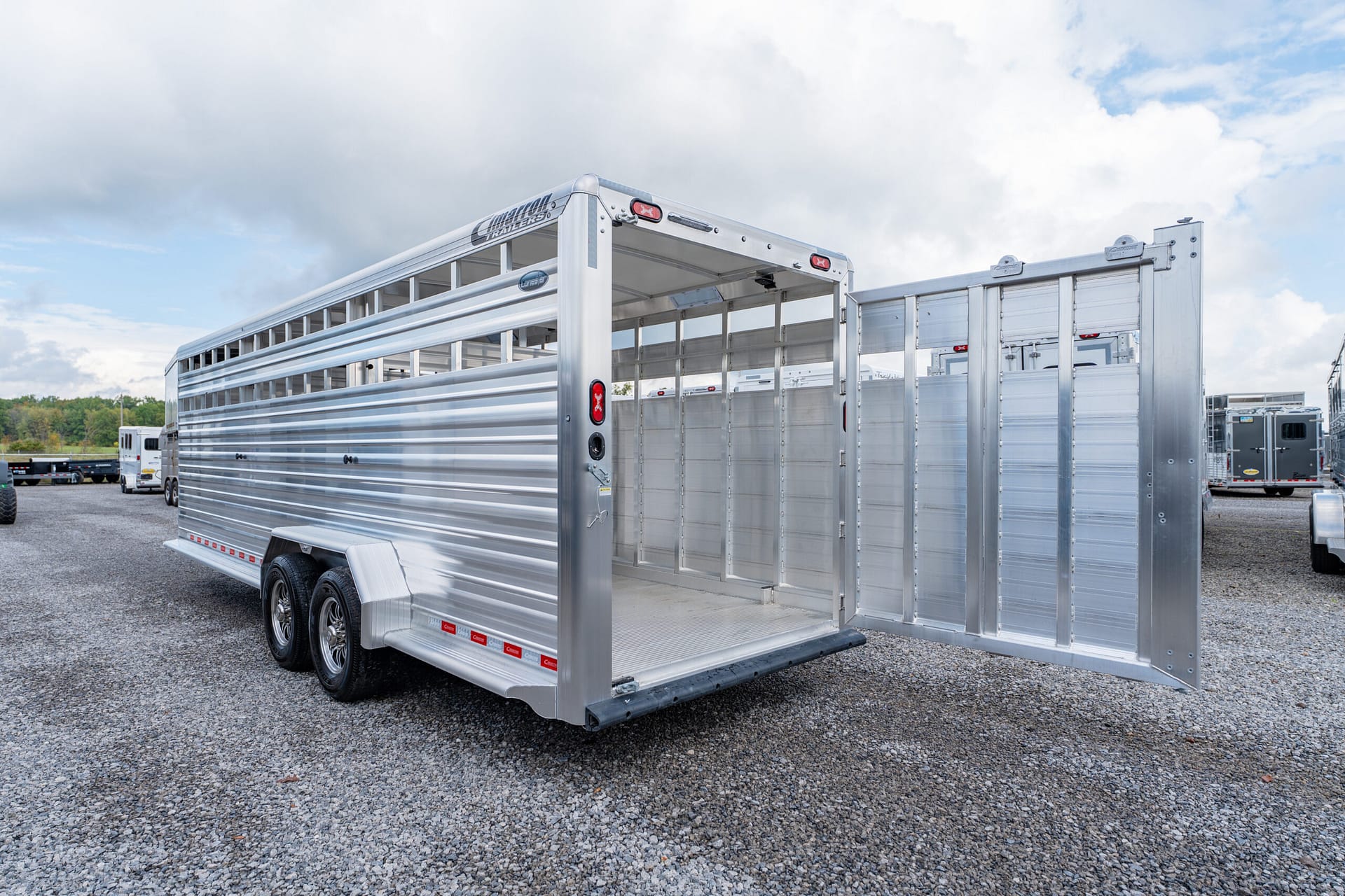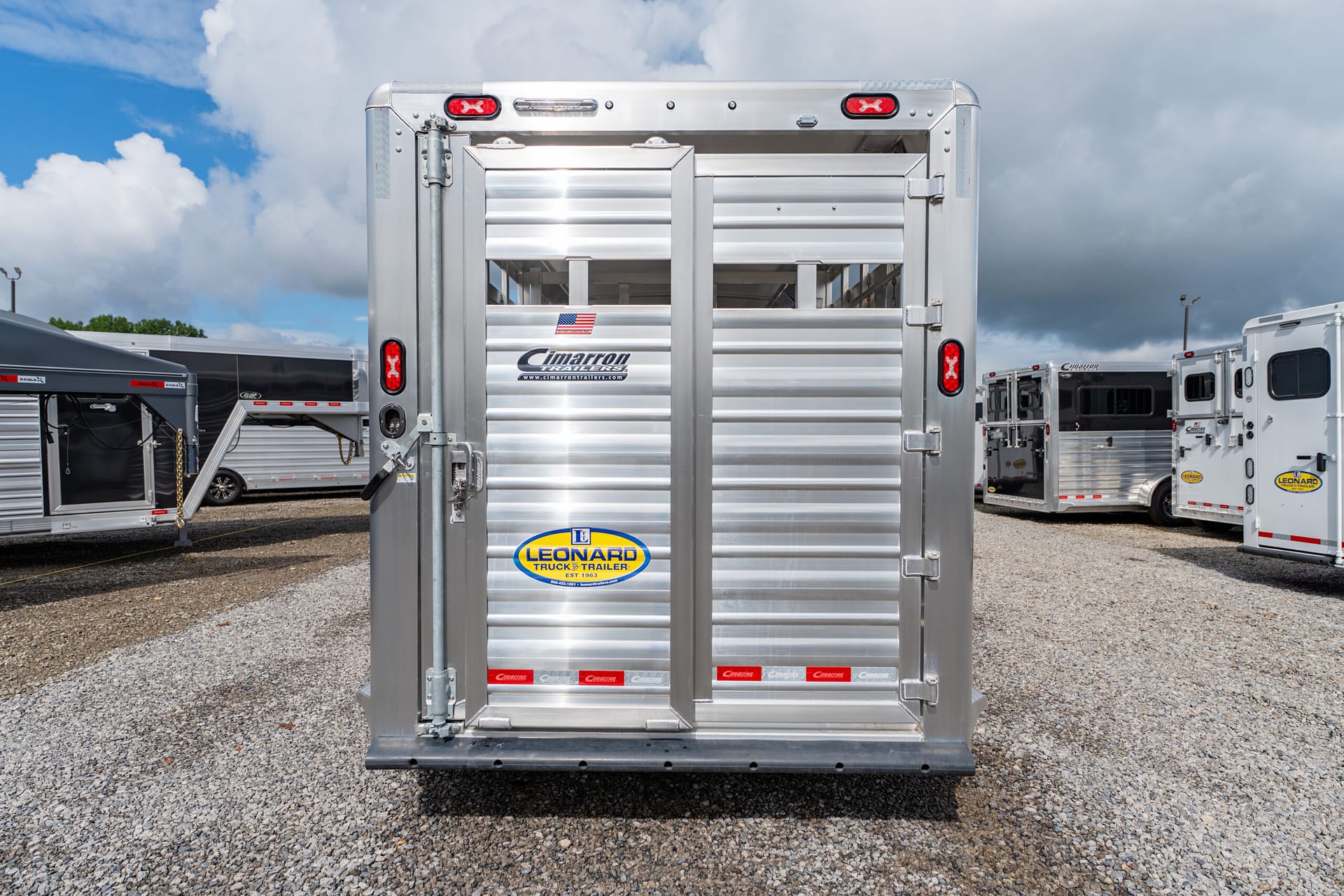This stock combo trailer has extruded aluminum flooring with mats, side slat aluminum walls with plexiglass inserts and a full swing center gate. The dress in this stock trailer is a full wall with bridle hooks, clothes bars, saddle racks and a brush tray. This unit also has a full swinging rear door with a slider.