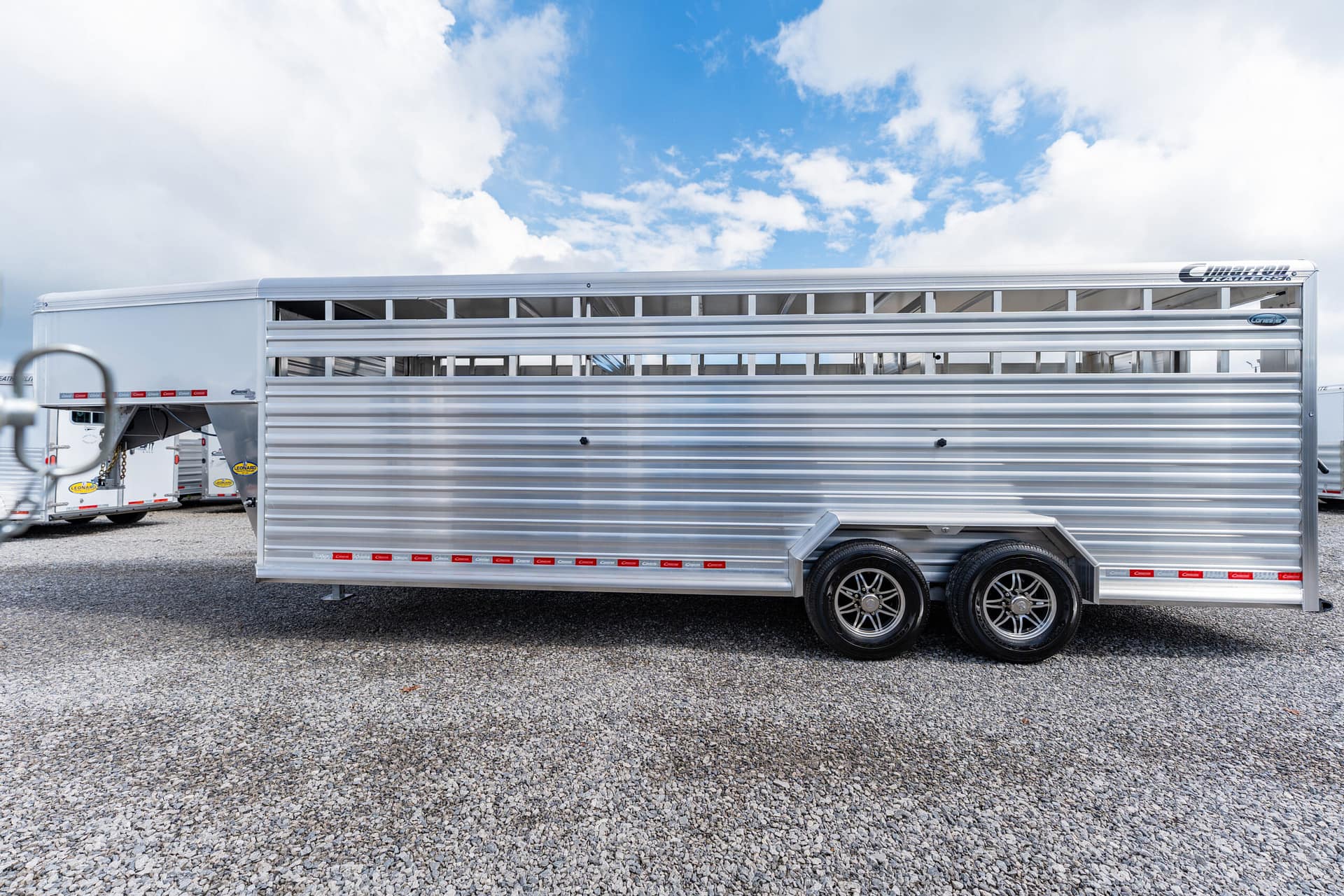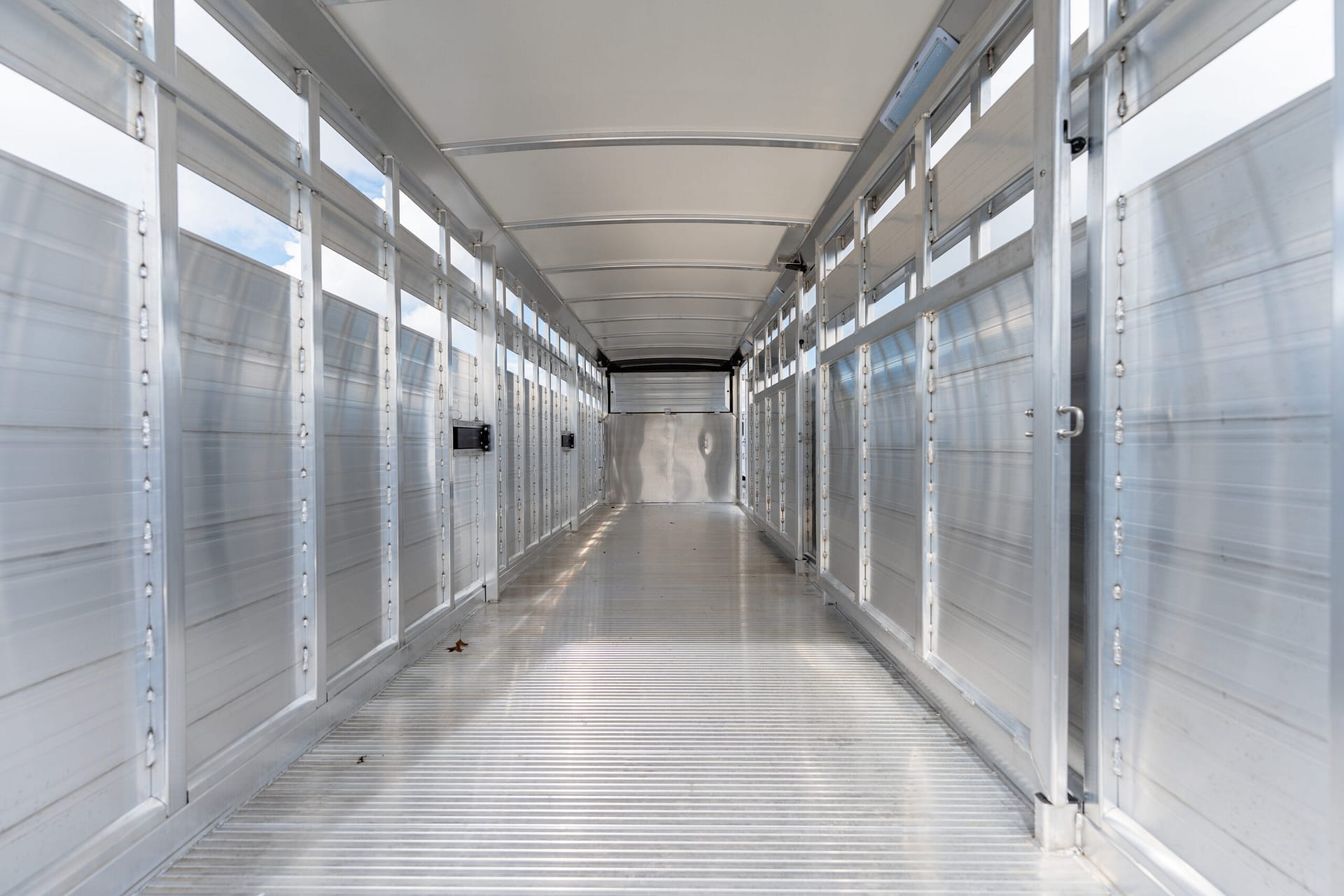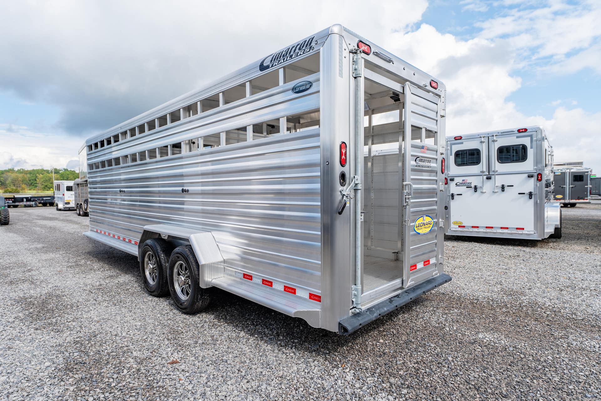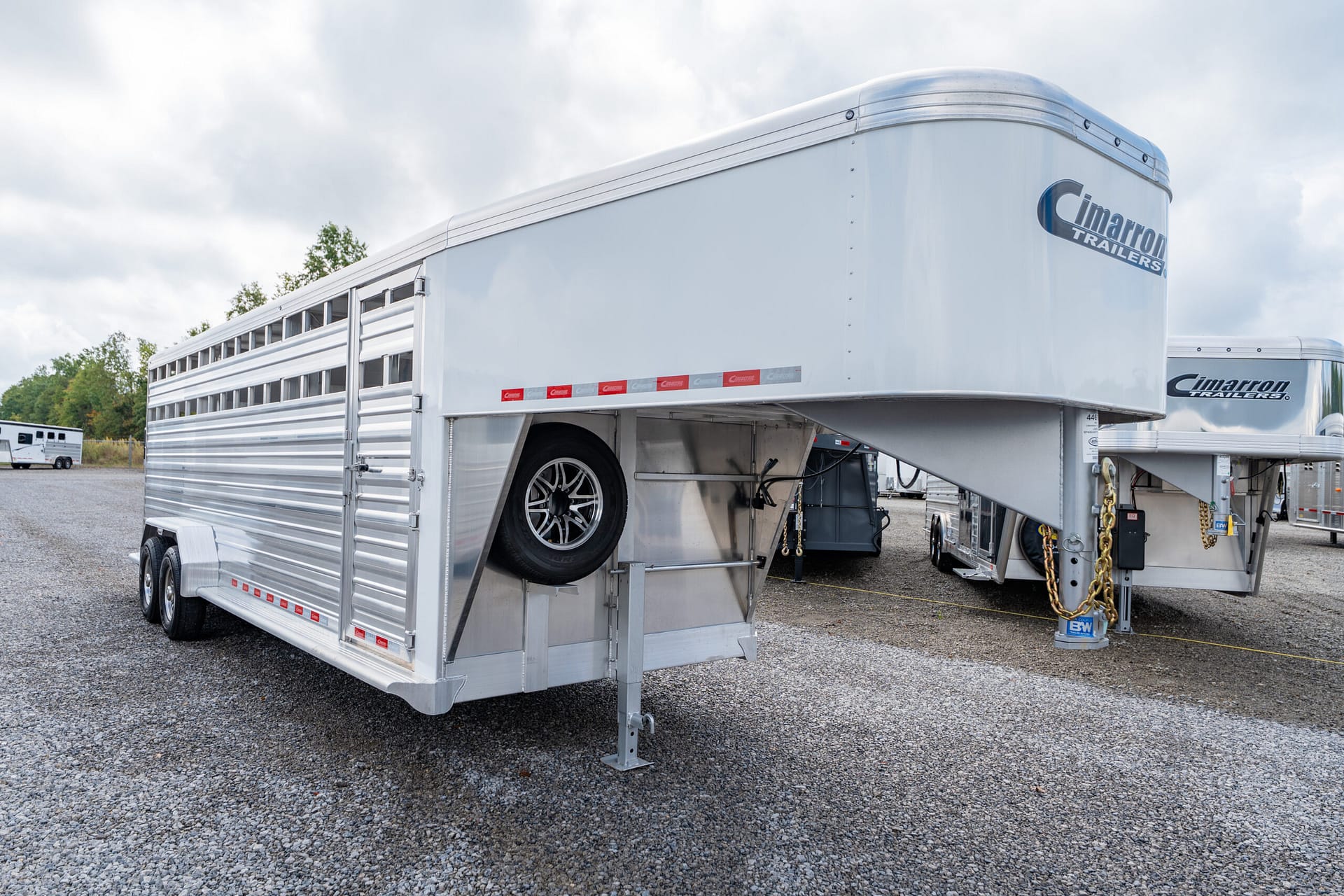 This stock combo trailer has extruded aluminum flooring with mats, side slat aluminum walls with plexiglass inserts and a full swing center gate. The dress in this stock trailer is a full wall with bridle hooks, clothes bars, saddle racks and a brush tray. This unit also has a full swinging rear door with a slider.