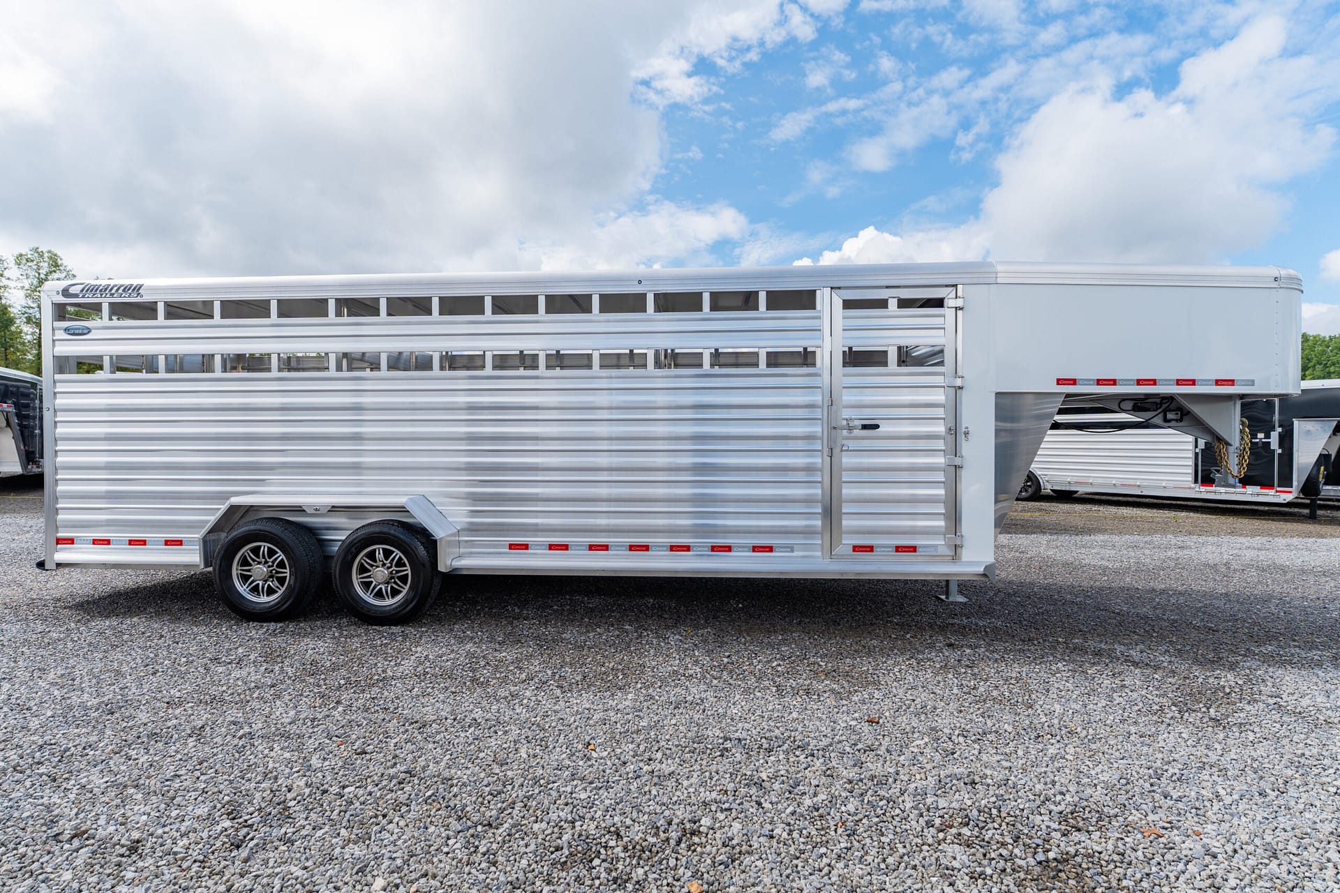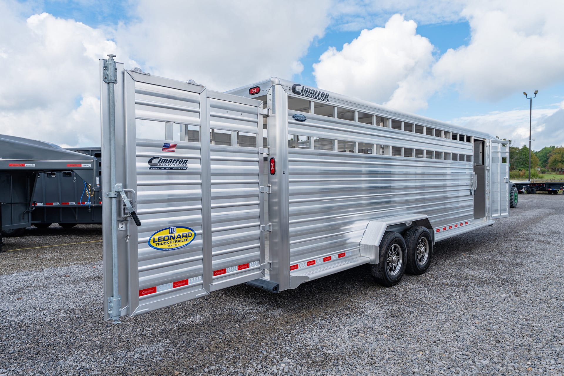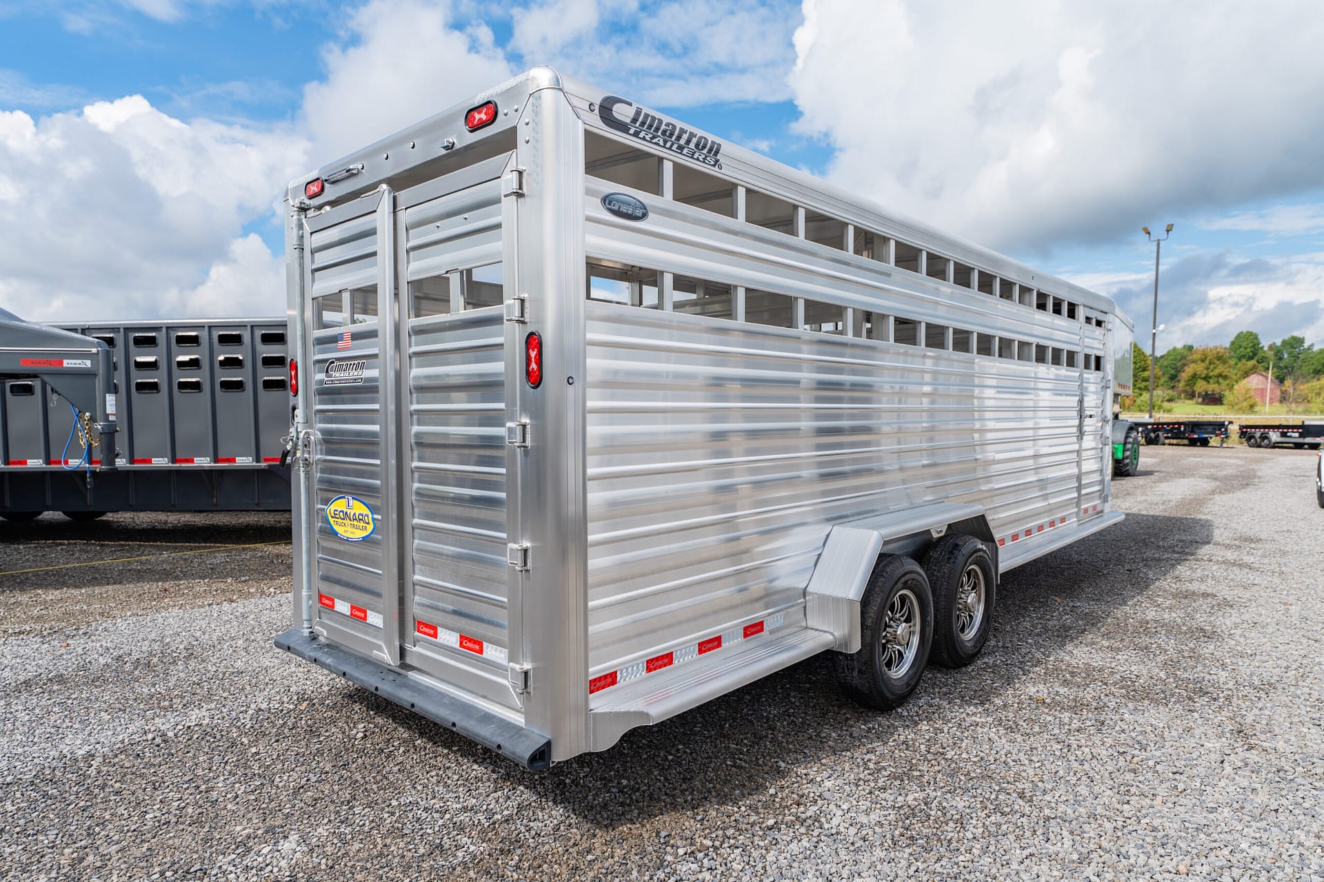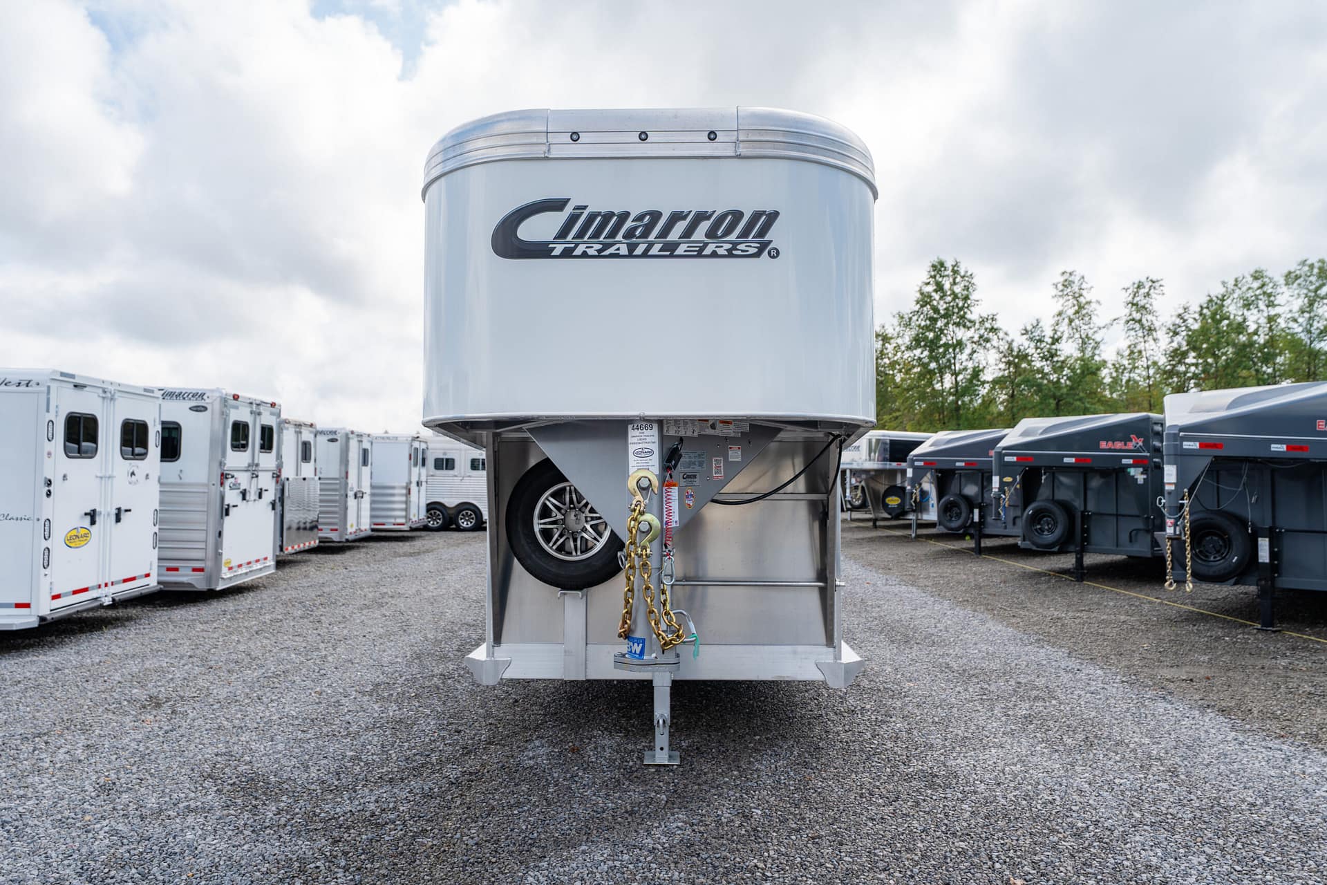 This stock combo trailer has extruded aluminum flooring with mats, side slat aluminum walls with plexiglass inserts and a full swing center gate. The dress in this stock trailer is a full wall with bridle hooks, clothes bars, saddle racks and a brush tray. This unit also has a full swinging rear door with a slider.