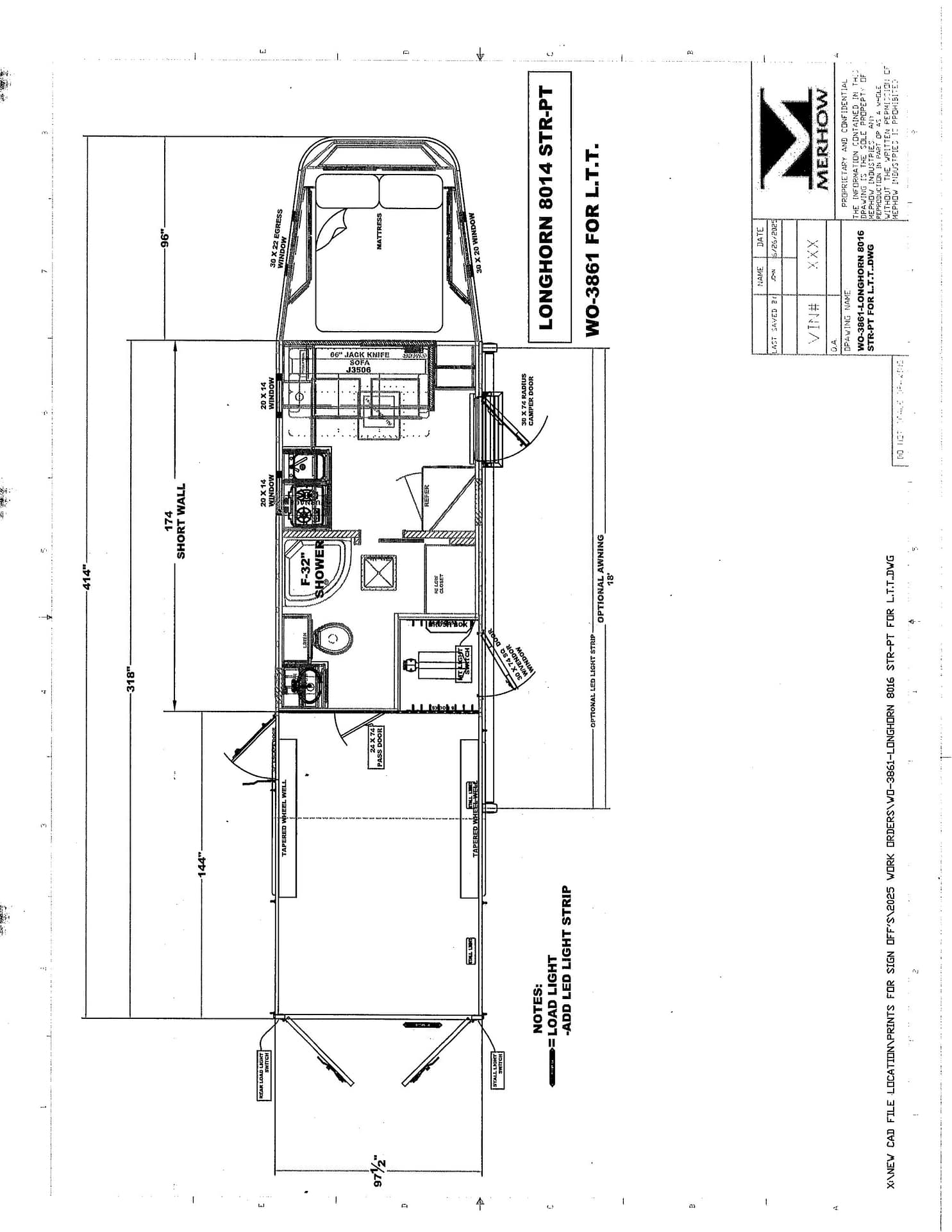 Doors & Access: 30″ escape door w/ cam bar; escape door specified to be 2/3 door above the wheel well; walk-thru LQmid-tack and mid-tackstock doors; square camper door (radius to LQ) with screen (to LQ)