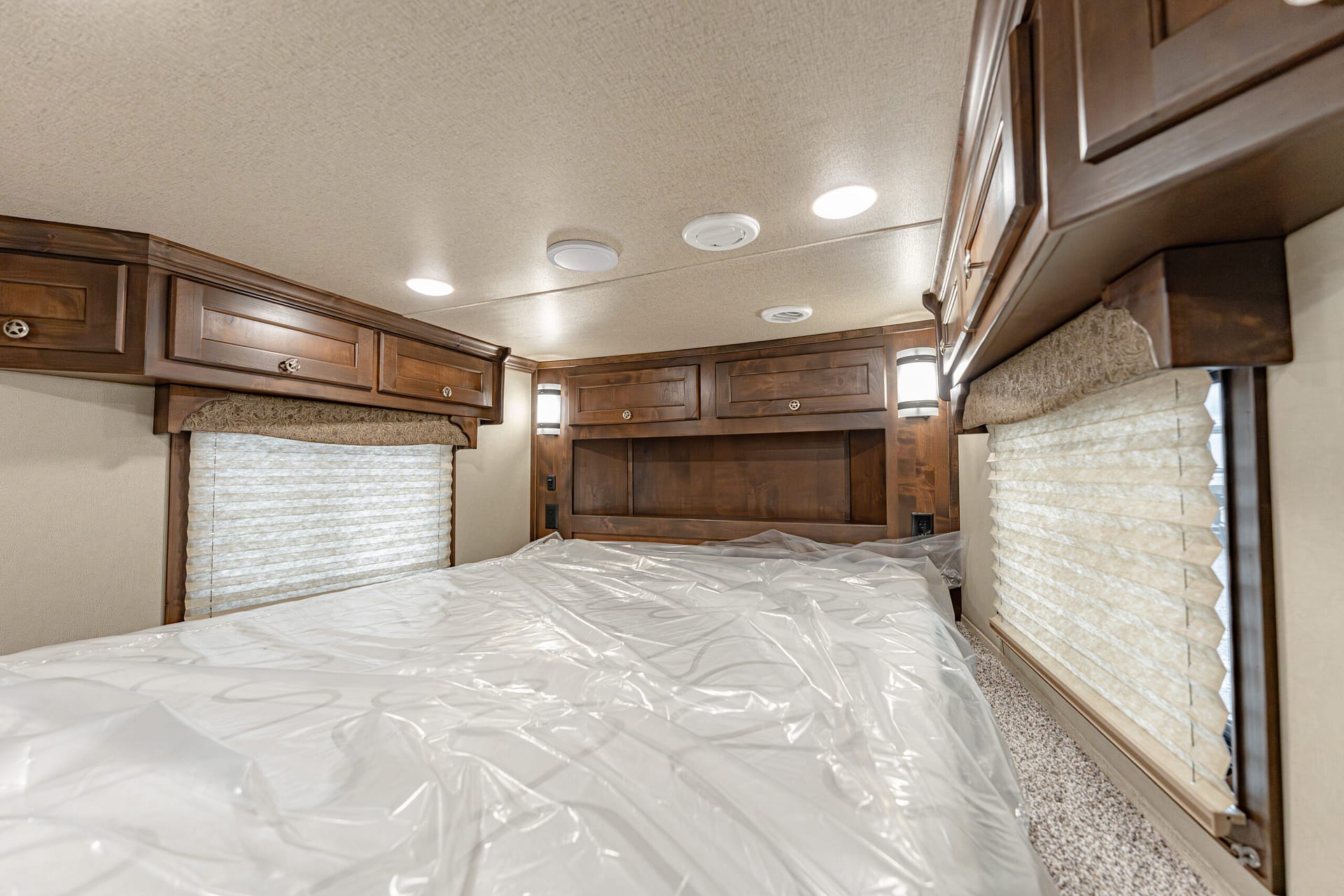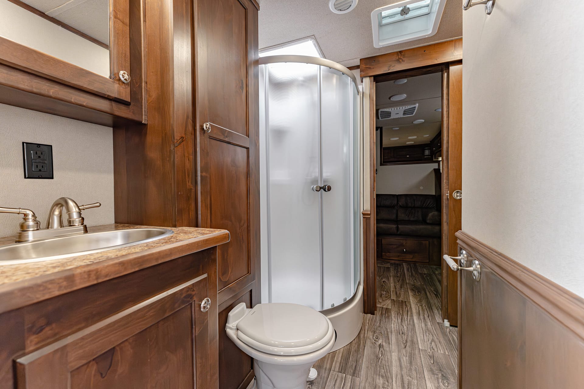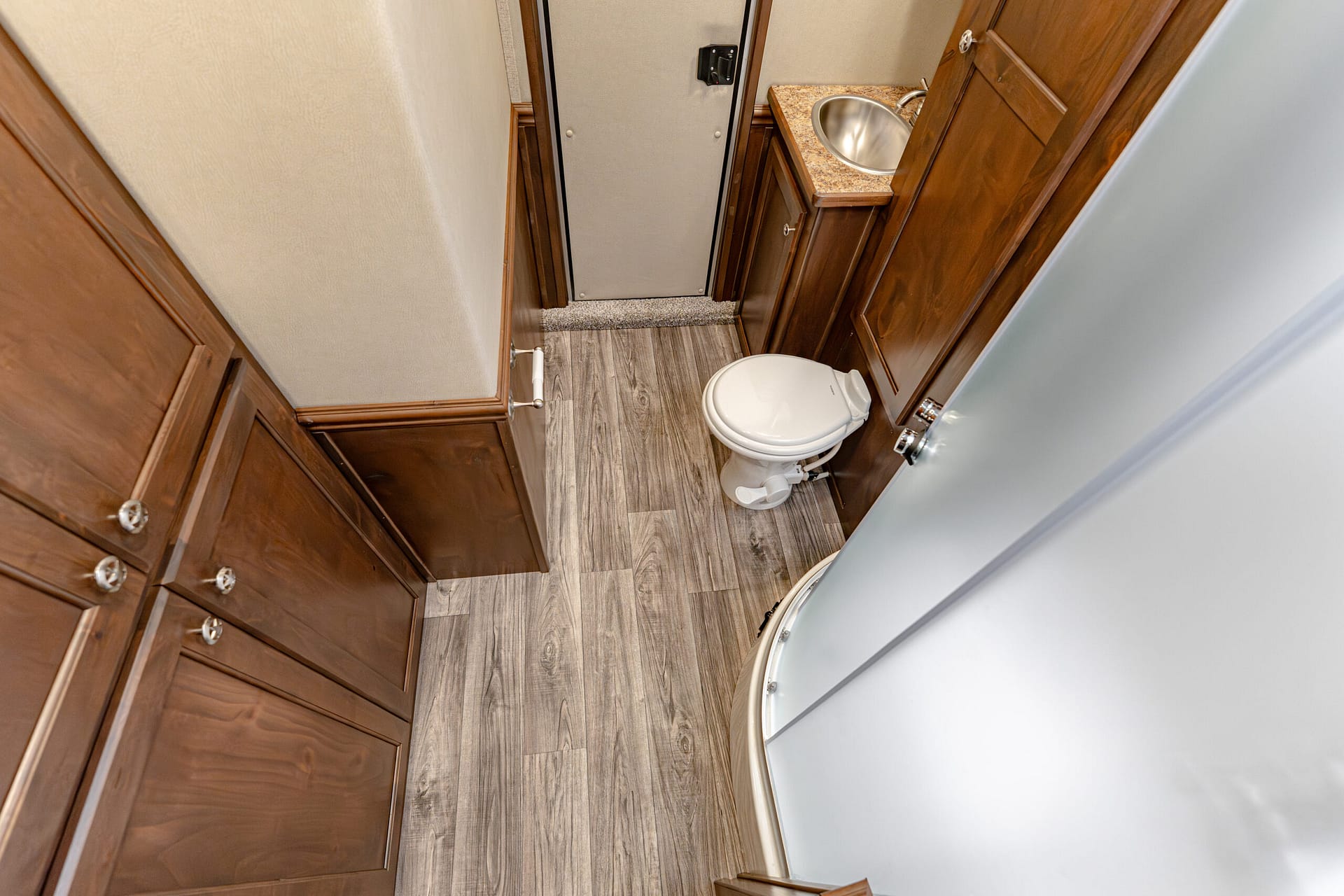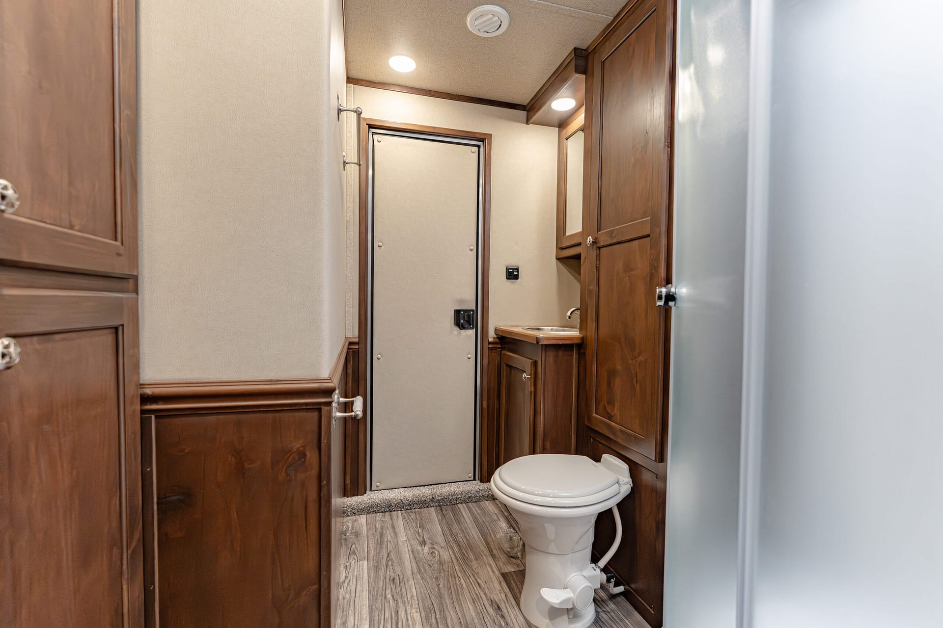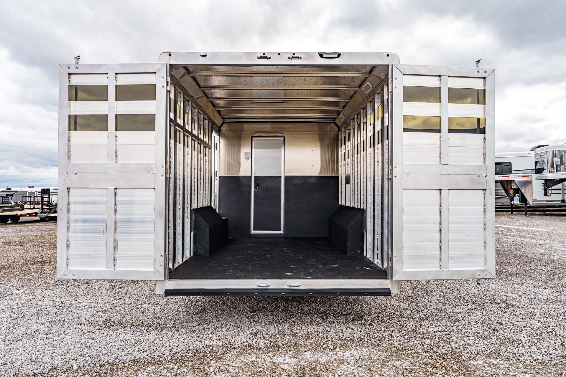 Doors & Access: 30″ escape door w/ cam bar; escape door specified to be 2/3 door above the wheel well; walk-thru LQmid-tack and mid-tackstock doors; square camper door (radius to LQ) with screen (to LQ)