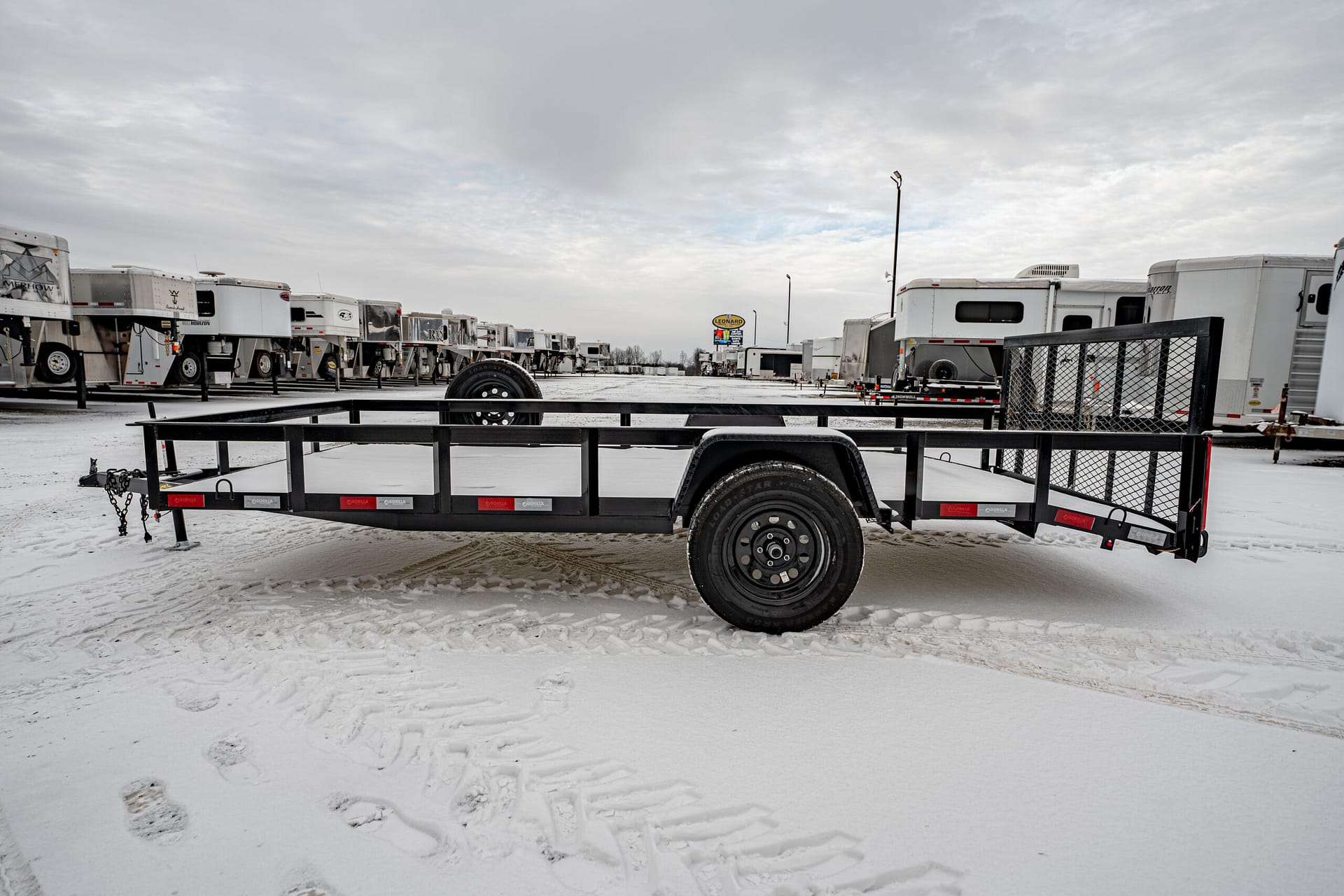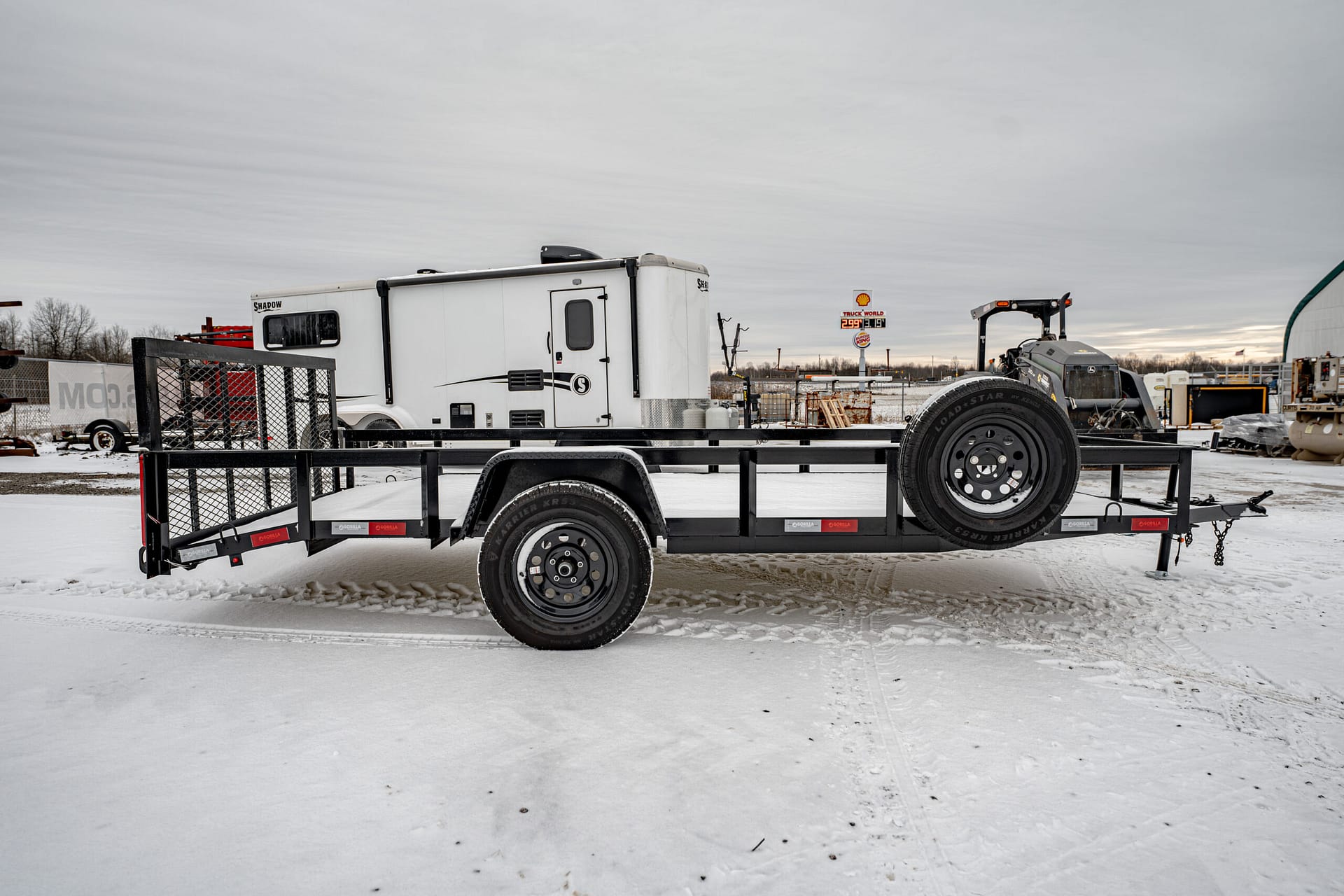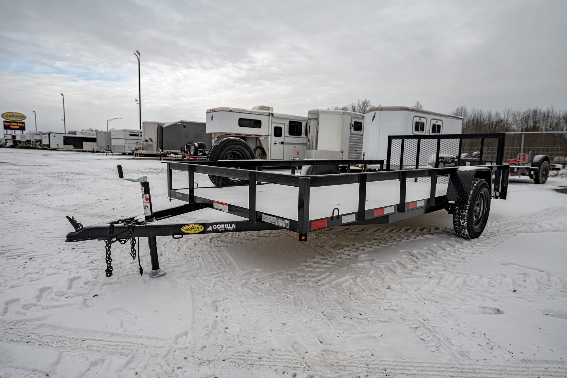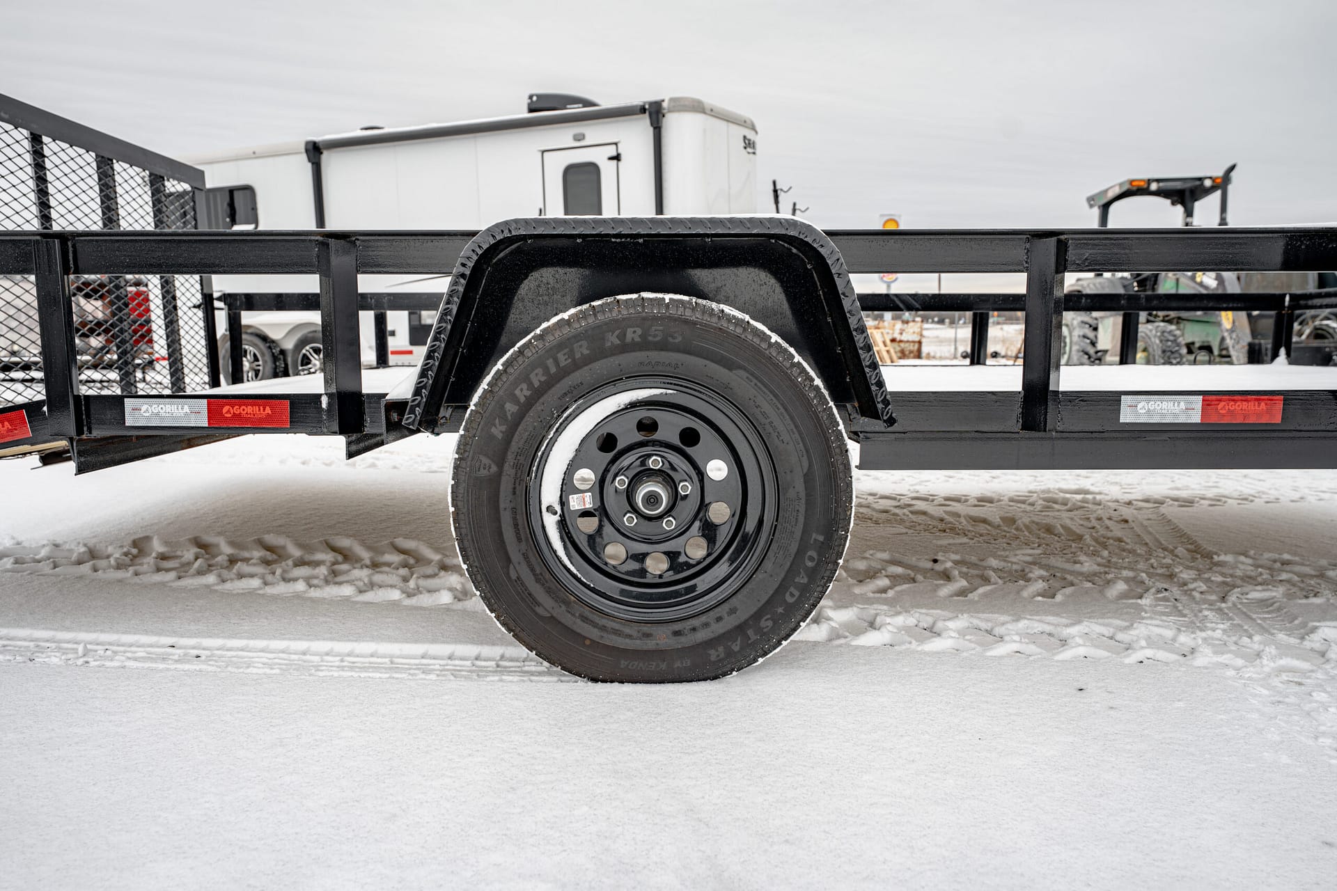 Gorilla Utility Trailers are built for durability with a heavy-duty 3/16-inch, 2 x 3 angle iron frame and 24-inch on-center crossmembers. The pressure-treated 2 x 8 wood deck ensures longevity, while diamond plate tear-drop fenders and Tredit 15-inch radial tires add style and reliability. A spare tire mount, 3.5K Dexter axle, and Optronic LED lights