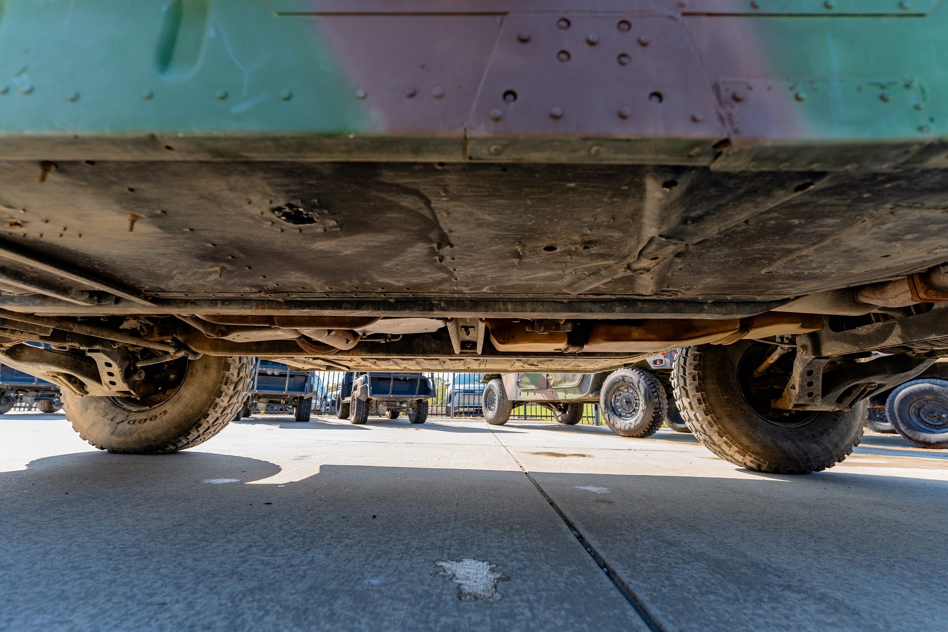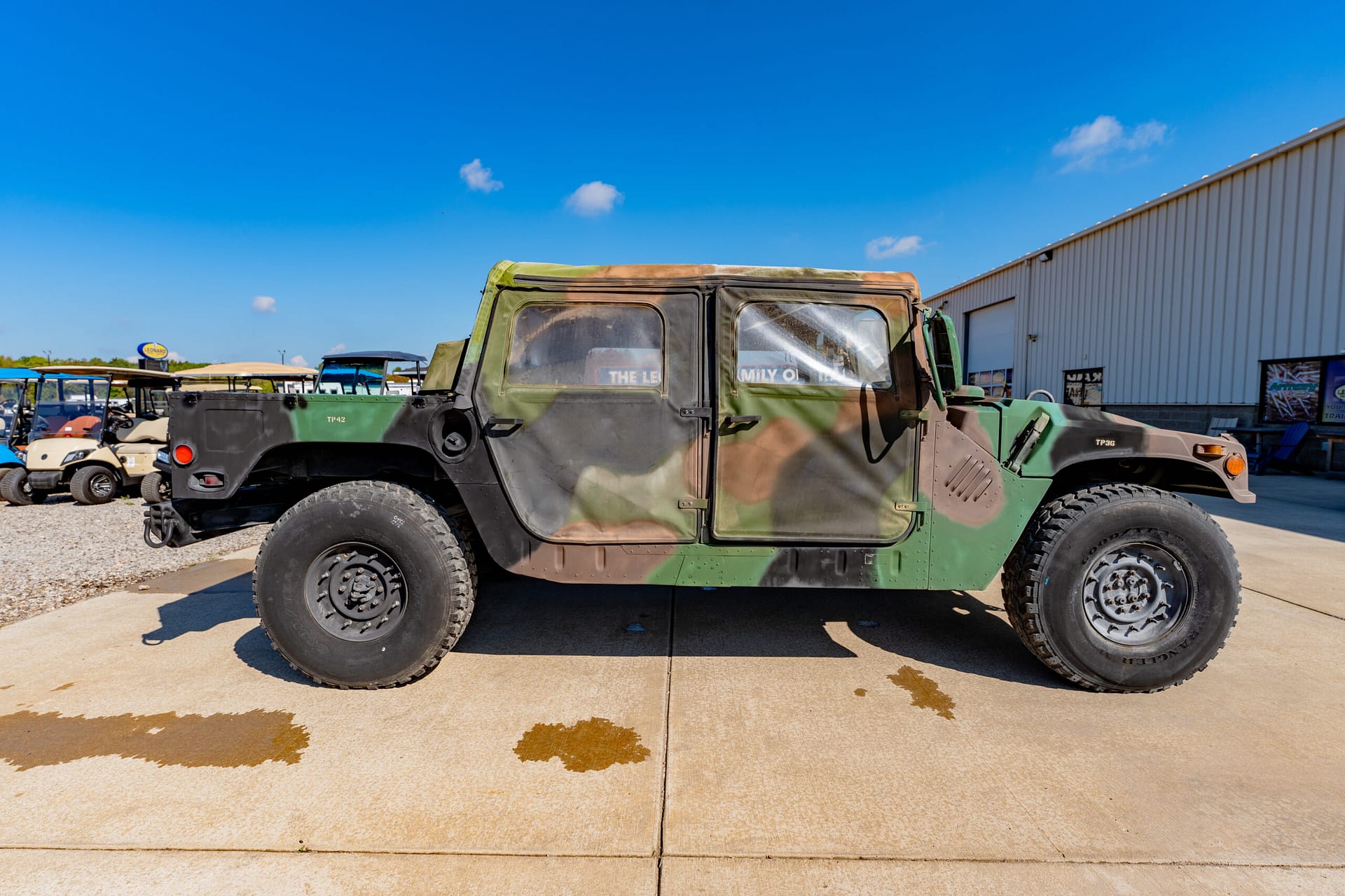 The Humvee has a 16 in ground clearance, a high-mounted radiator, and waterproof electronics. It also has disk brakes, double A-arm independent suspension, and coil springs. It runs and drives well and everything works as it should, and we did check the fluids and overall condition of the vehicle.