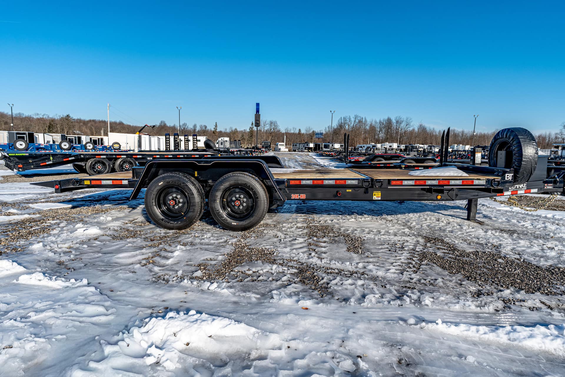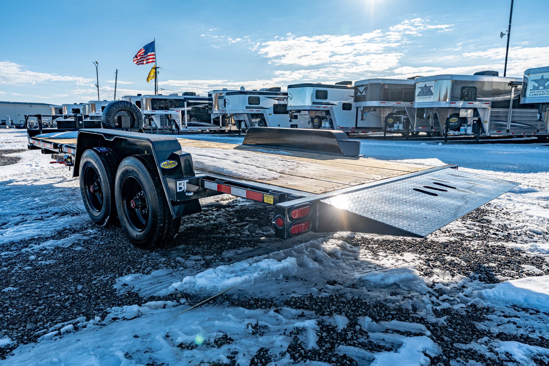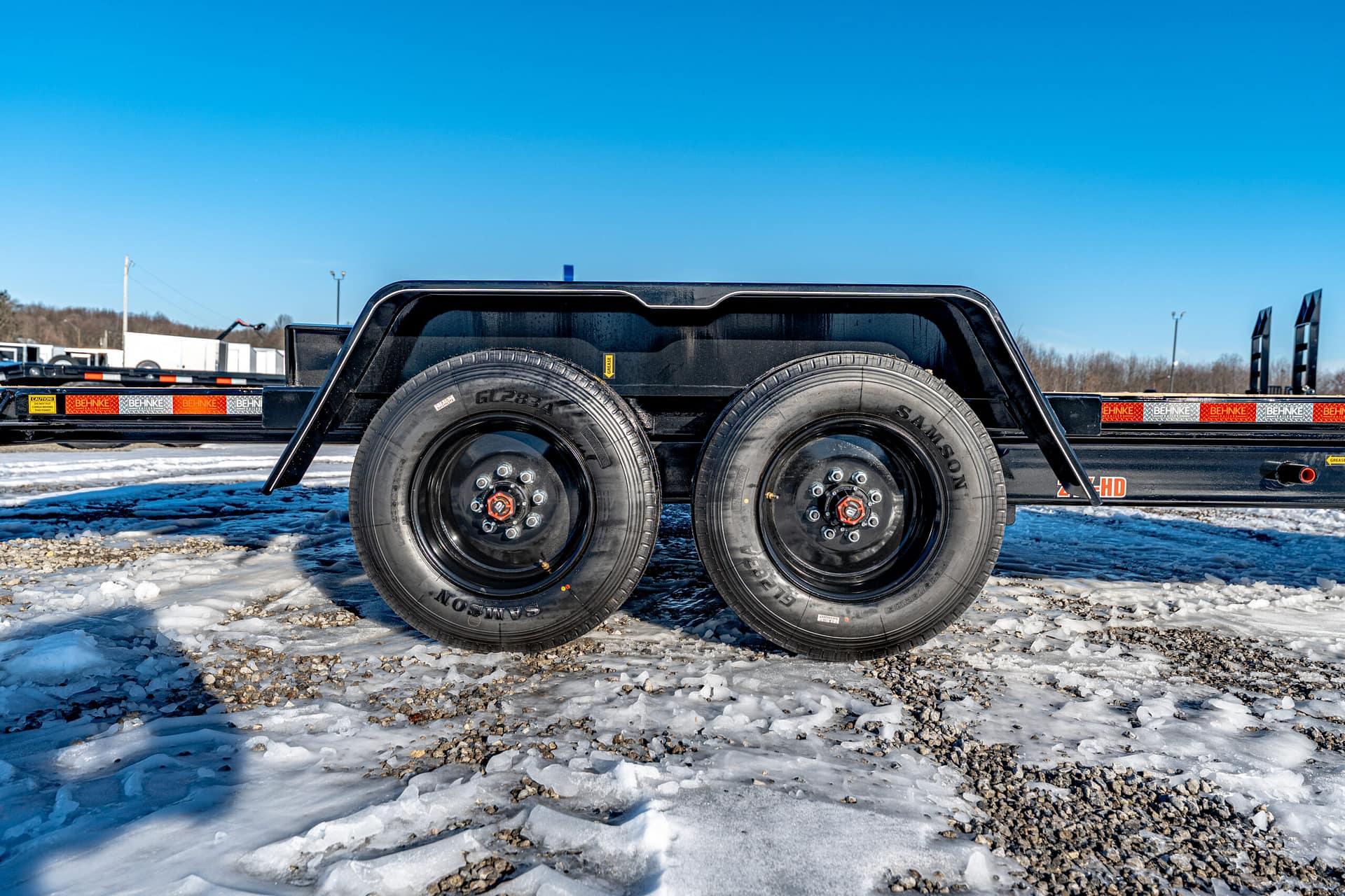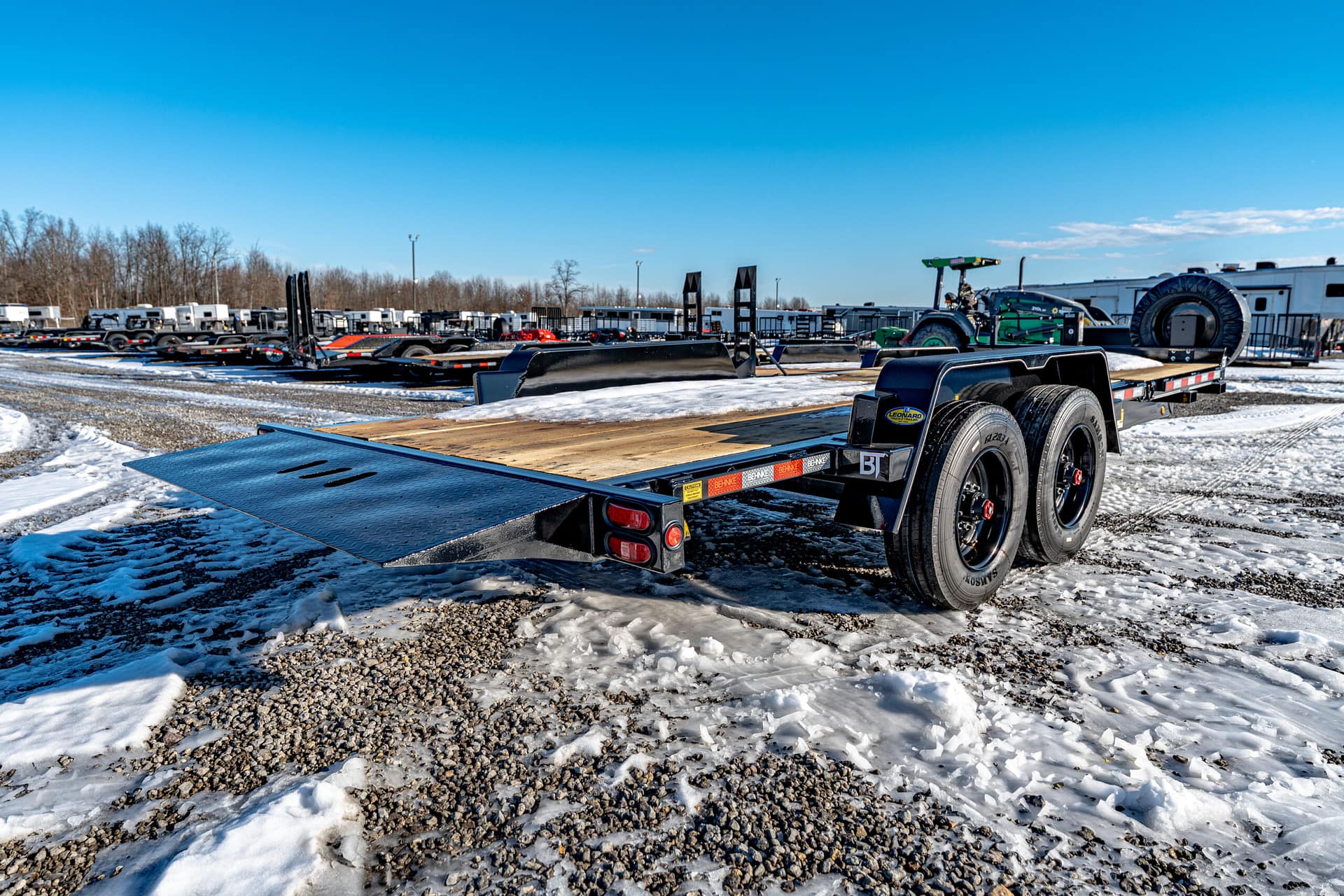 Extras & Accessories: Heavy-duty 1/8″ formed fenders with fender guards, 12,000 lb. Jost spring-loaded dropleg jack, rubber-mounted LED lights, stake pockets, D-rings at tilt and stationary ends, modular wire harness, 12-volt breakaway kit, reflector tape, zinc-rich primed and powder coated, spare tire and rim, spare tire mount, rub rail