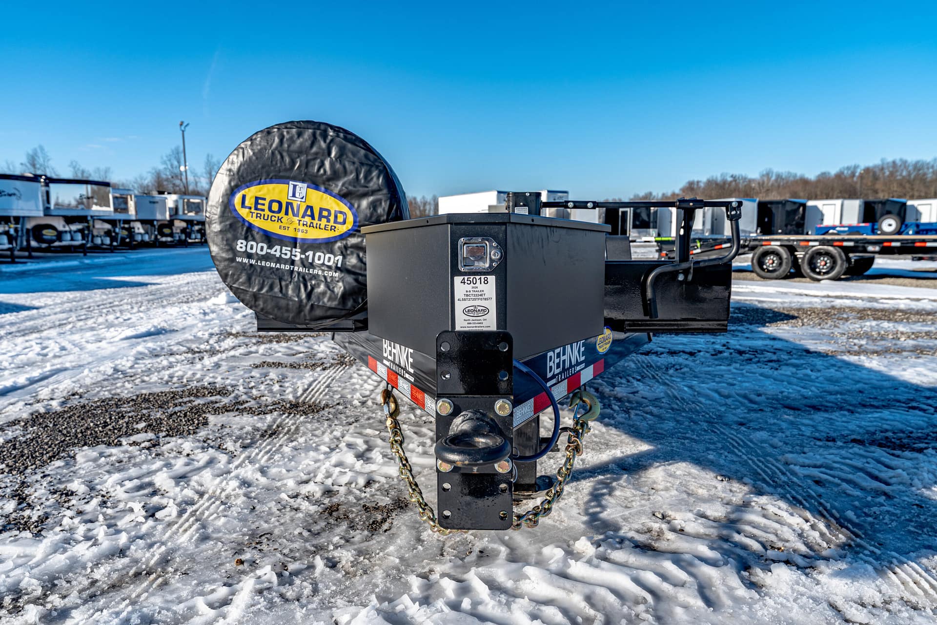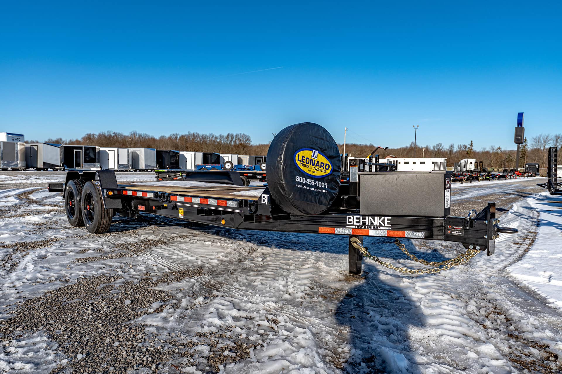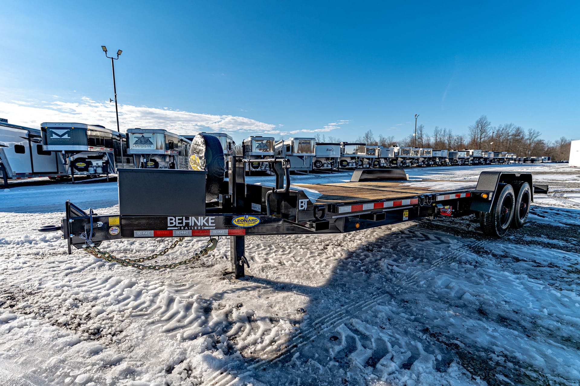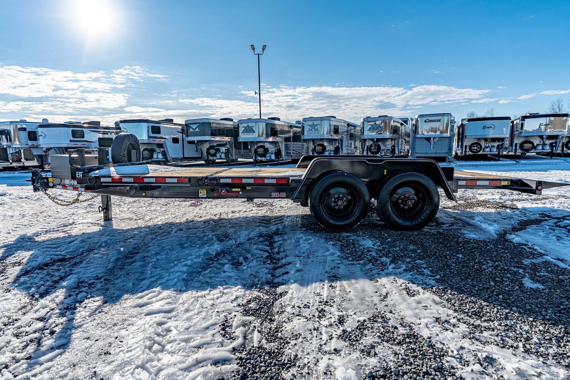 Extras & Accessories: Heavy-duty 1/8″ formed fenders with fender guards, 12,000 lb. Jost spring-loaded dropleg jack, rubber-mounted LED lights, stake pockets, D-rings at tilt and stationary ends, modular wire harness, 12-volt breakaway kit, reflector tape, zinc-rich primed and powder coated, spare tire and rim, spare tire mount, rub rail
