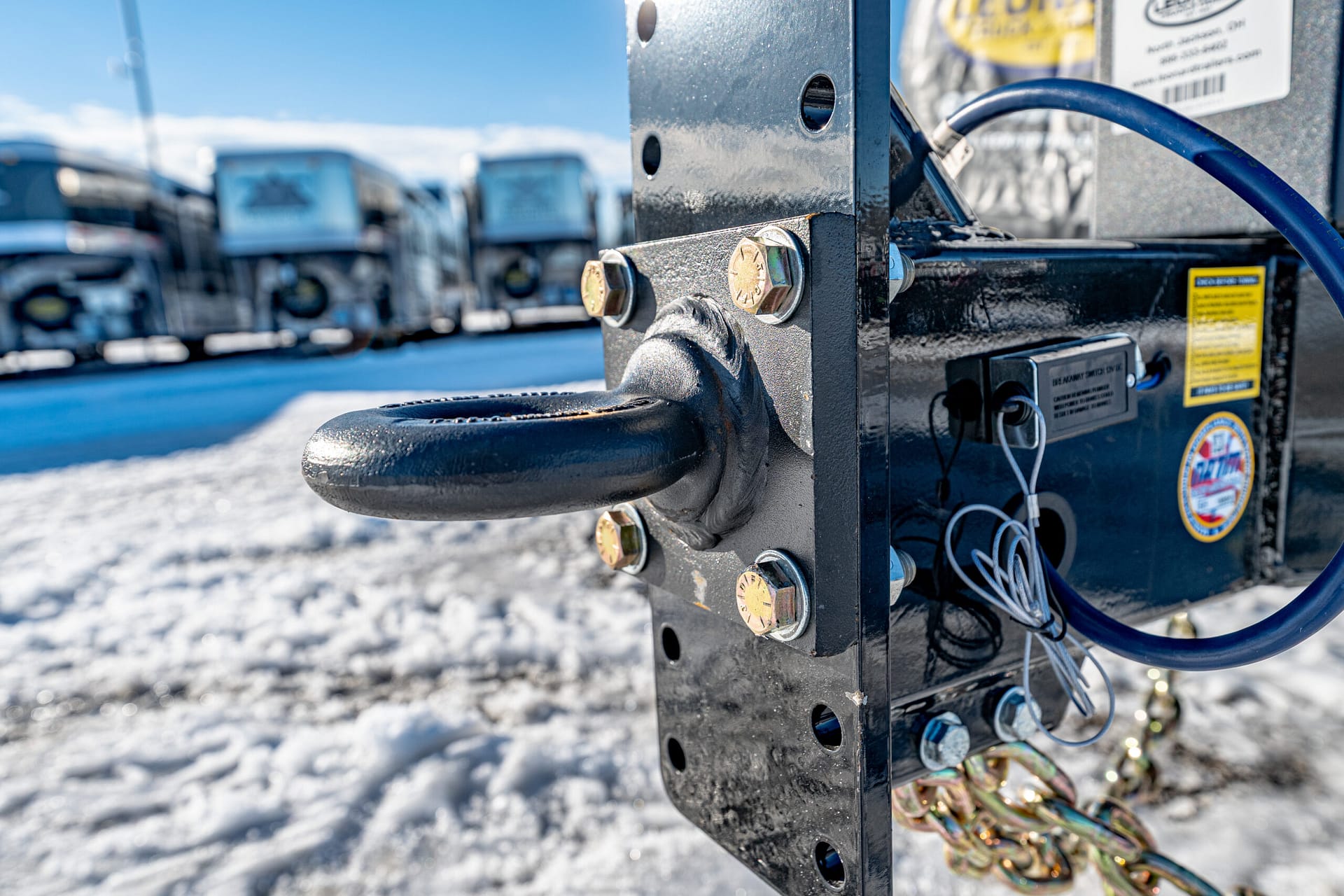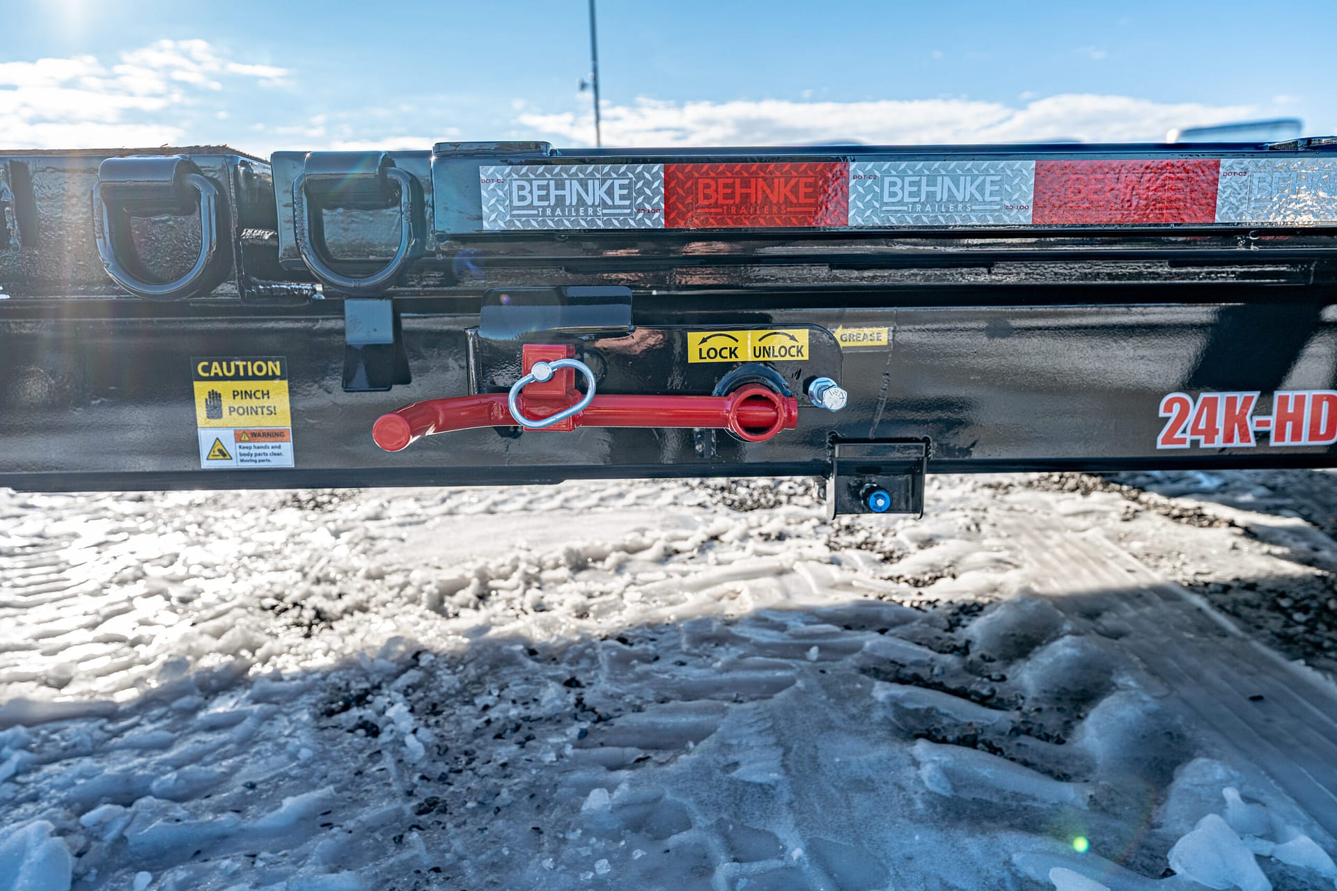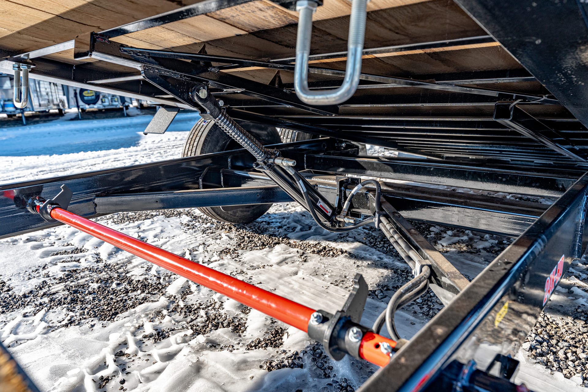 Convenience & Safety: Tilt latch mechanism painted red for visibility, pallet fork holders accessible from both sides, 3″ channel crossmembers every 12″, pintle hitch