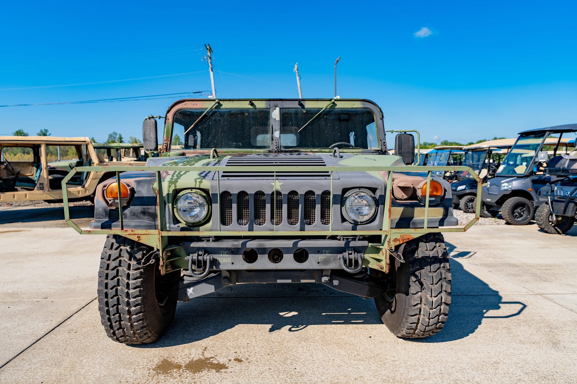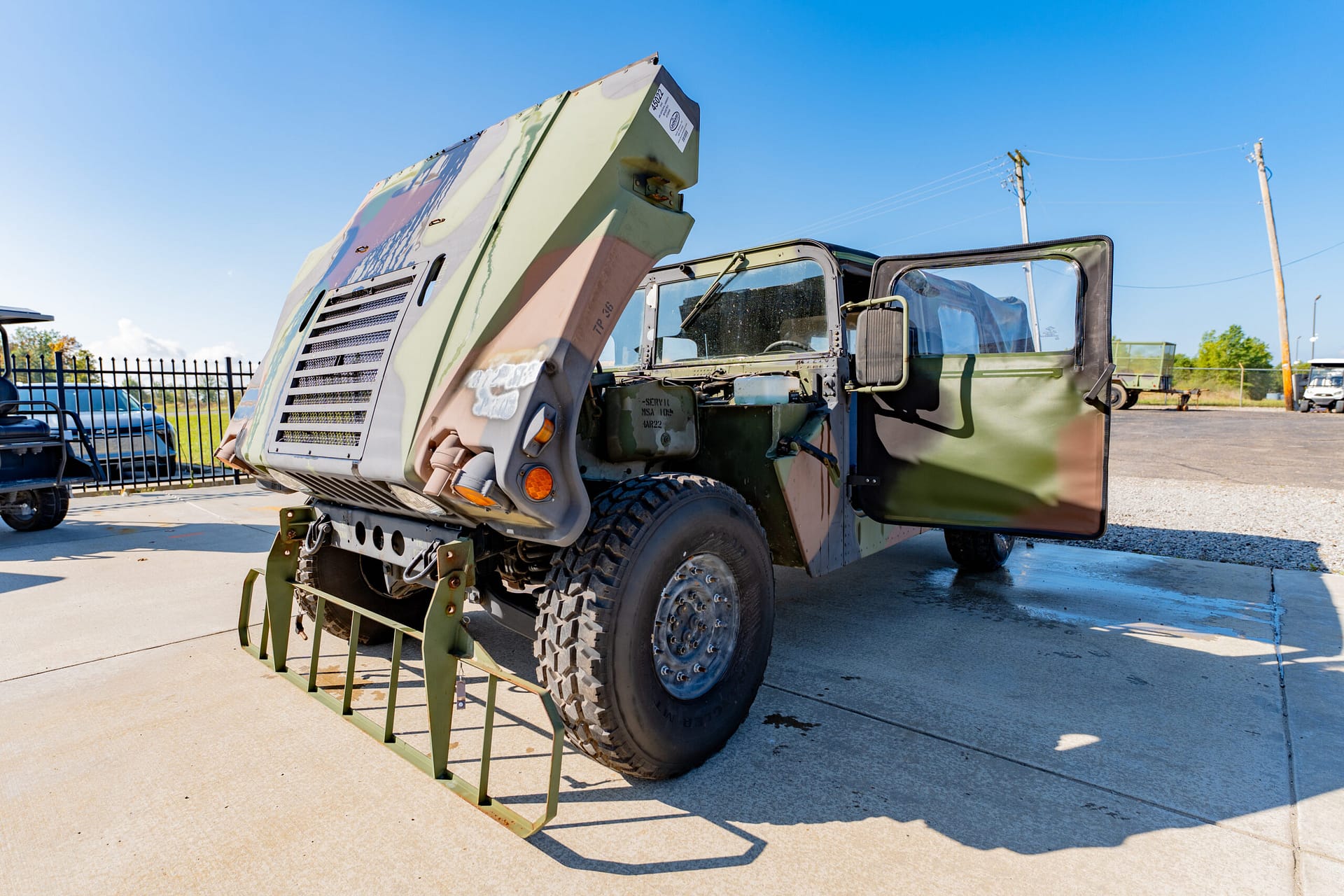 The Humvee has a 16 in ground clearance, a high-mounted radiator, and waterproof electronics. It also has disk brakes, double A-arm independent suspension, and coil springs. It runs and drives well and everything works as it should, and we did check the fluids and overall condition of the vehicle.