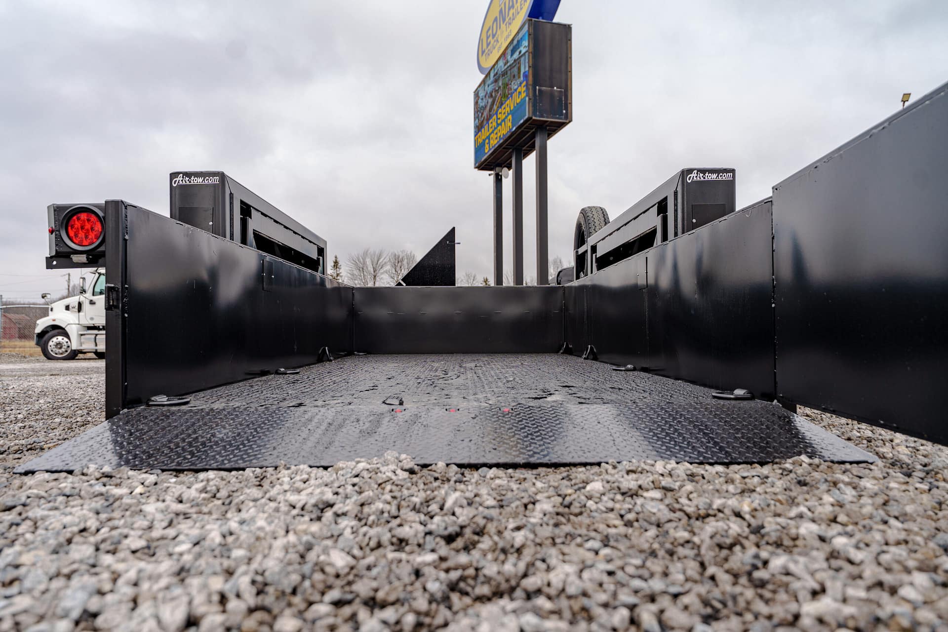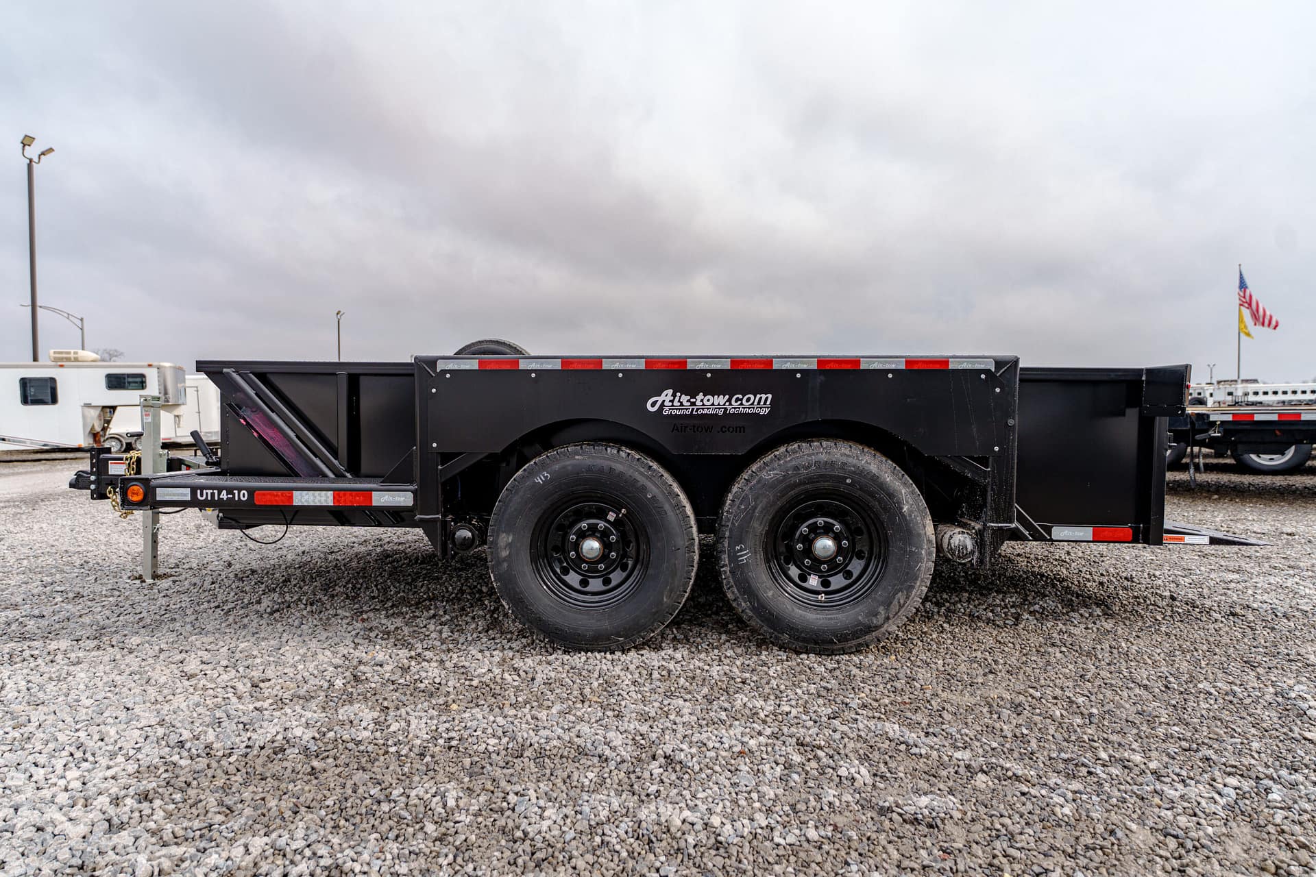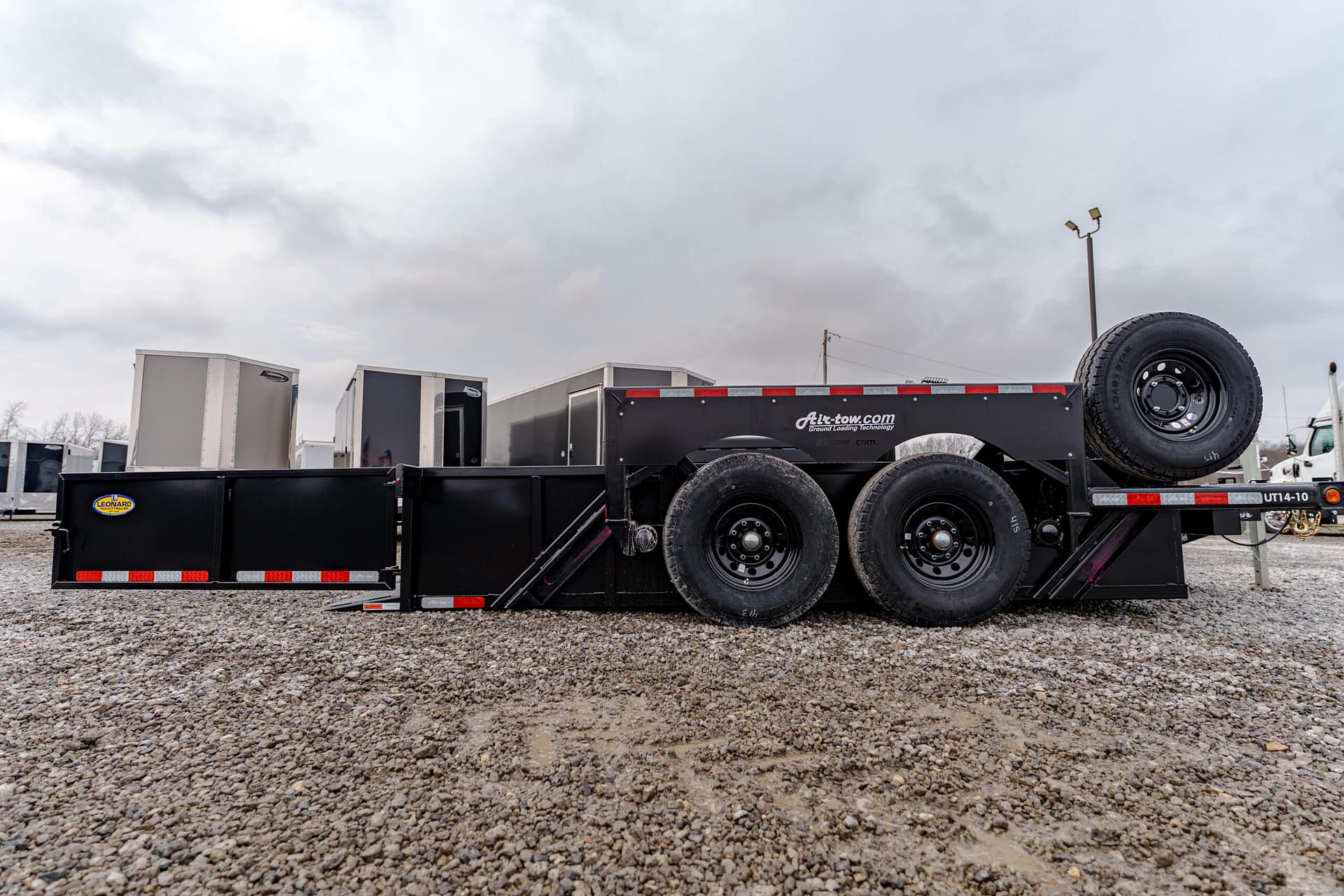 The Air-Tow UT14-10 offers the same innovative hydraulic lowering system as Air-Tow flatbeds, with the added convenience of sturdy side walls. The deck lowers to ground level for safe, easy loading, while the full-width, low-angle ramp allows smooth entry using a hand cart or dolly. Designed for versatility, Air-Tow Utility models offer a wide range of options to match your exact needs.