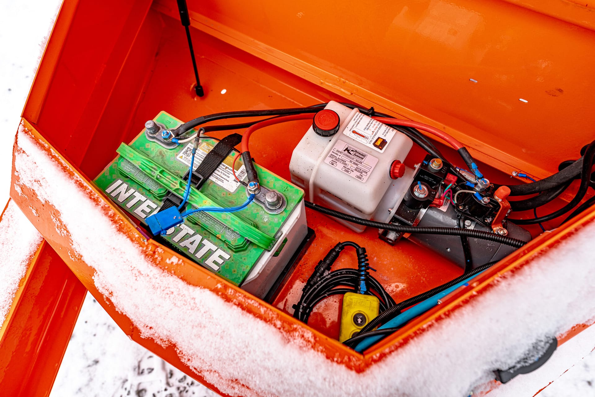 Hydraulics: Single 5″ x 16″ cylinder, 2-button KTI 12V pump, 14′ control cable