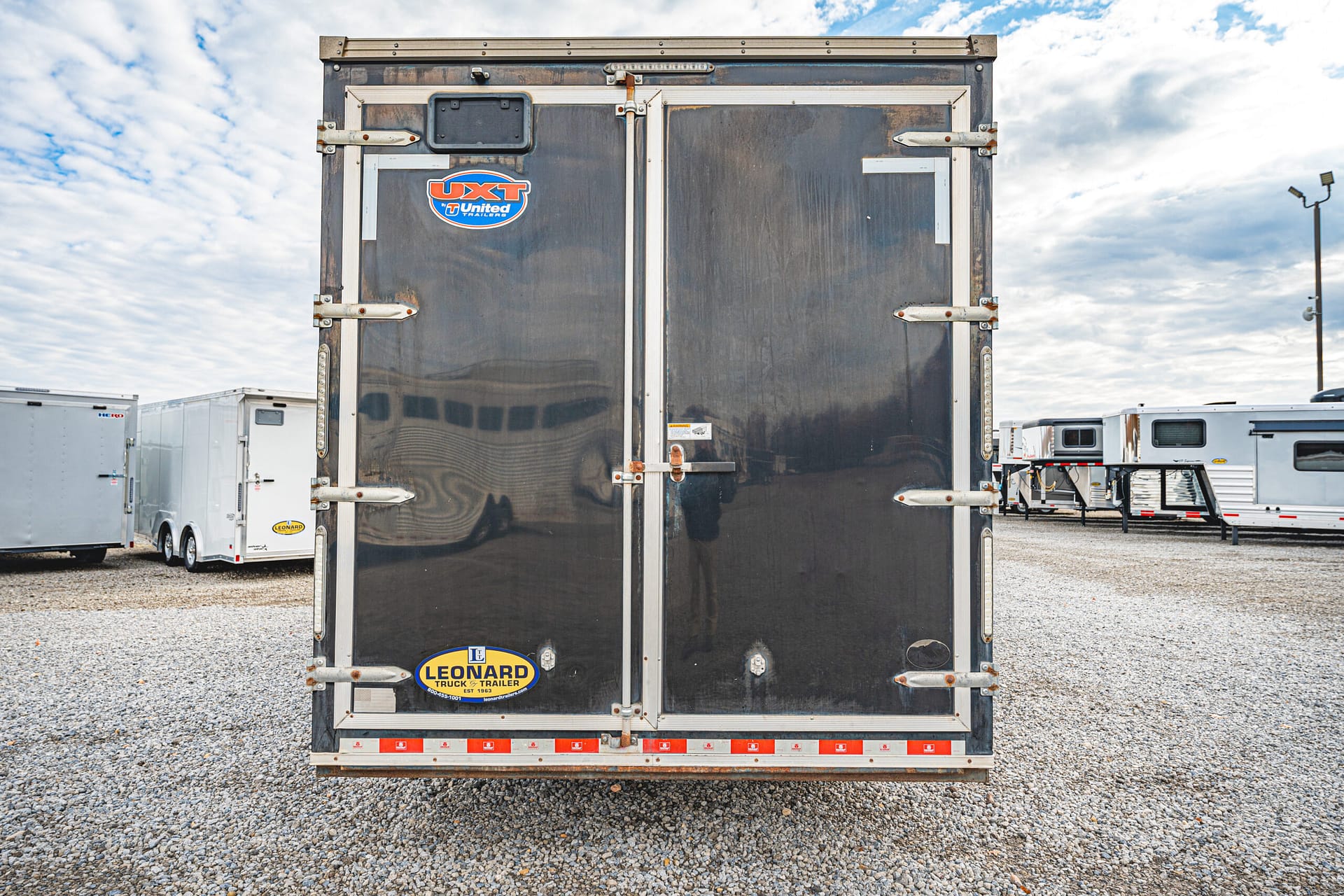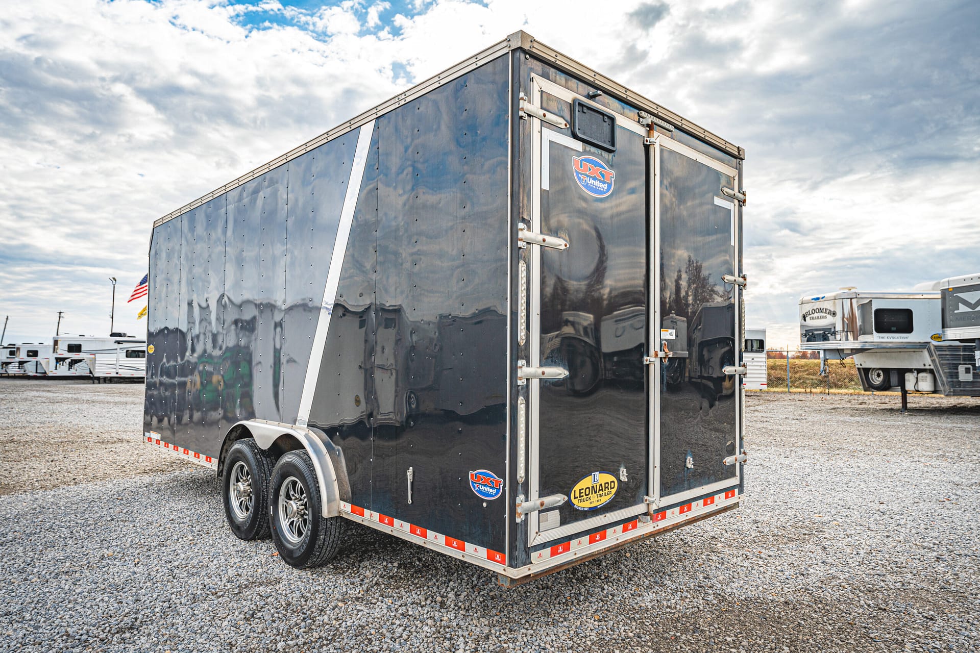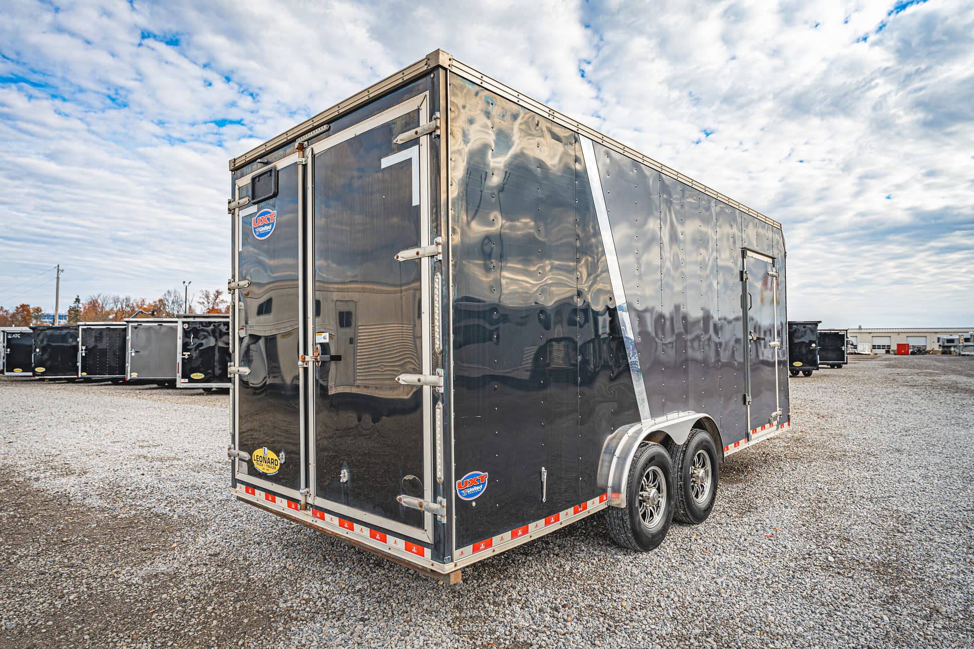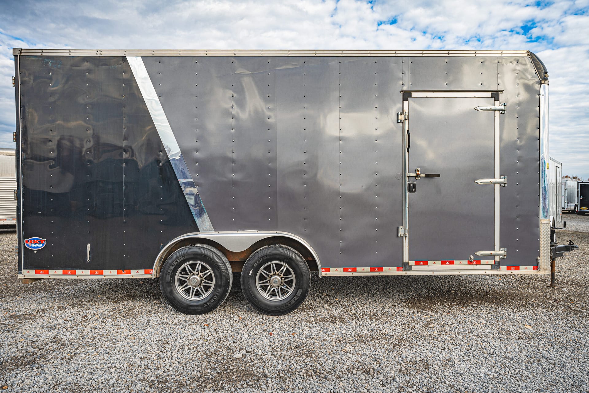 This high-quality 2020 United UXT enclosed trailer offers durability and functionality for a variety of hauling needs. Built with a robust steel frame and finished with a sleek two-tone grey and black aluminum exterior, this trailer combines strength with a professional appearance.