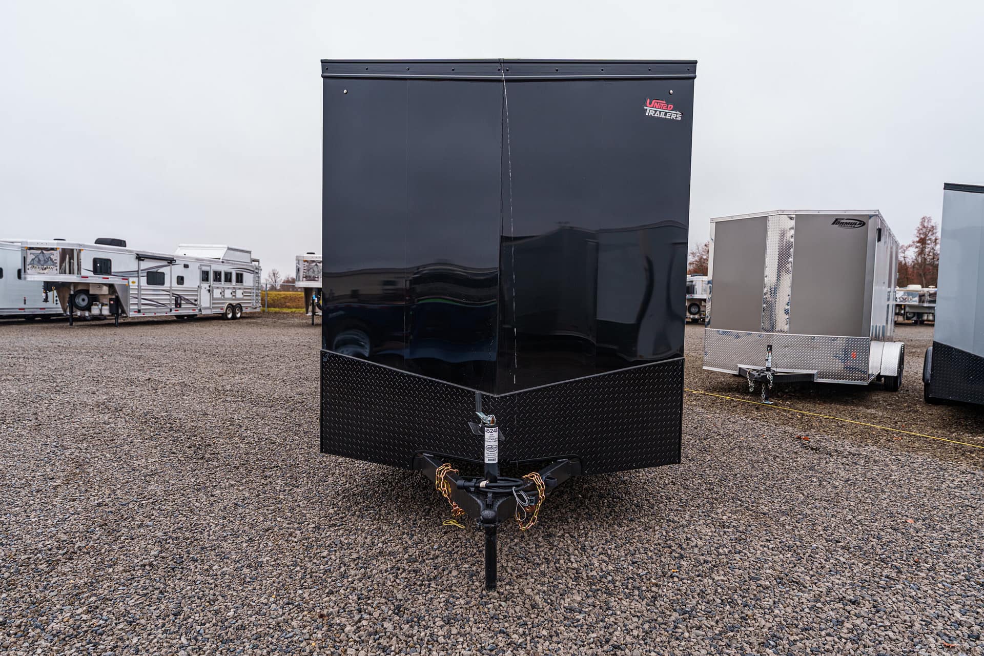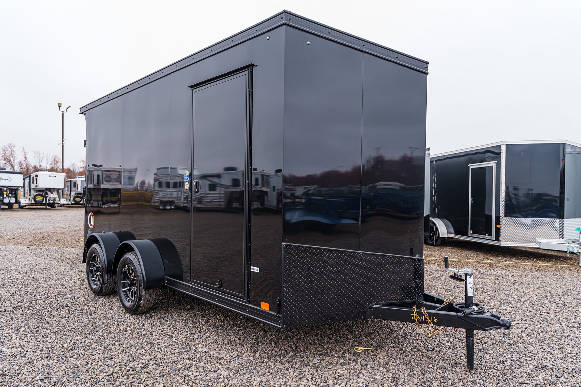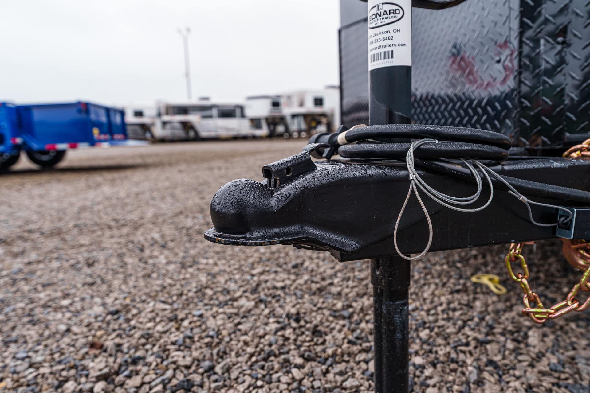 2-5/16″ coupler, 7-way plug, breakaway kit with charger, top crank jack with foot pad, and safety chains.