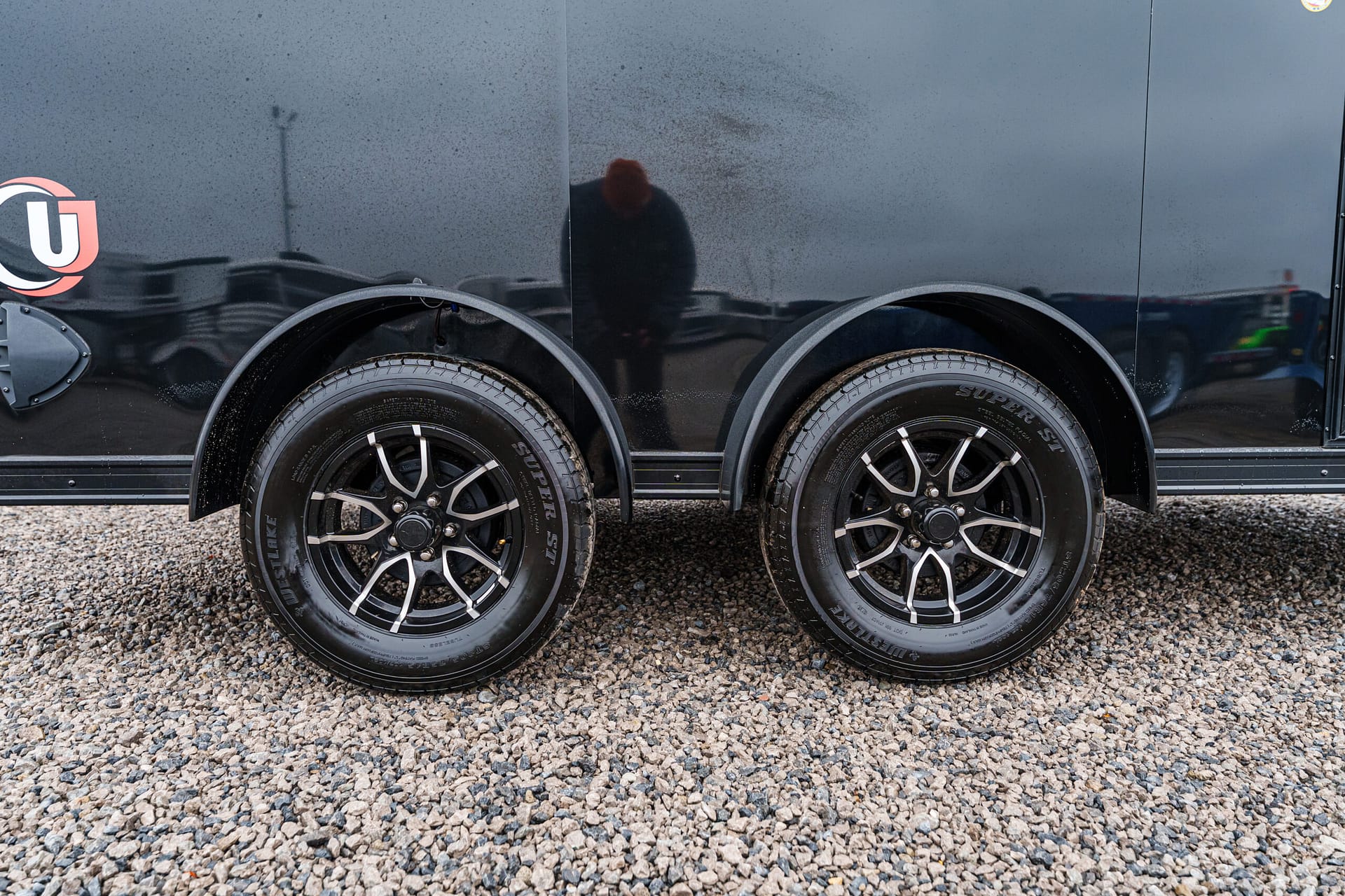 Dual 3,500-lb Dexter torsion axles with electric brakes, 5″ spread, axles moved back 5″. ST205/75R15 LRD Westlake tires on black & silver Eagle aluminum wheels.