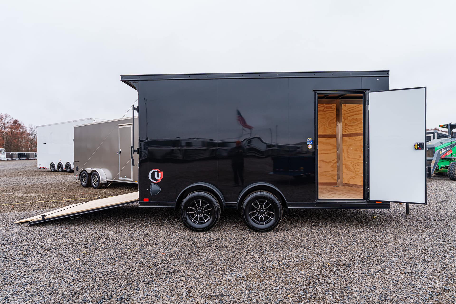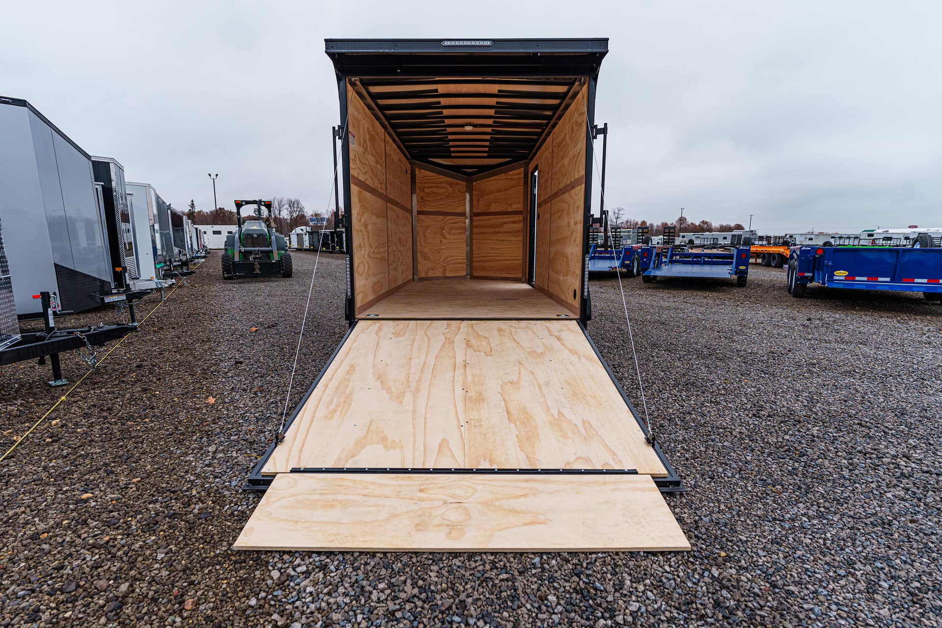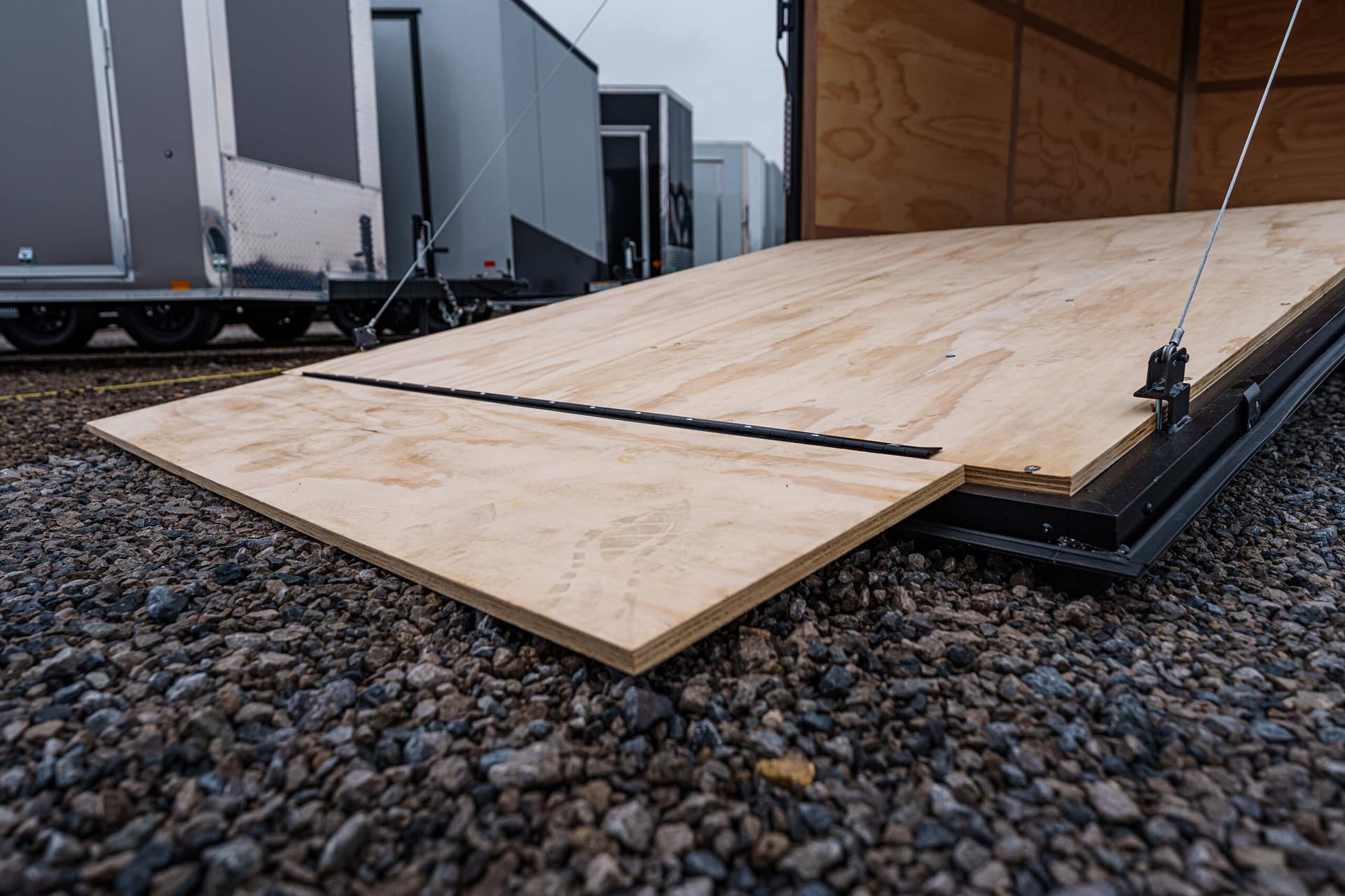 Rear ramp door with plywood flap and spring assist; 32″ x 72″ RV side door (15″ from front) with aluminum hold-back.
