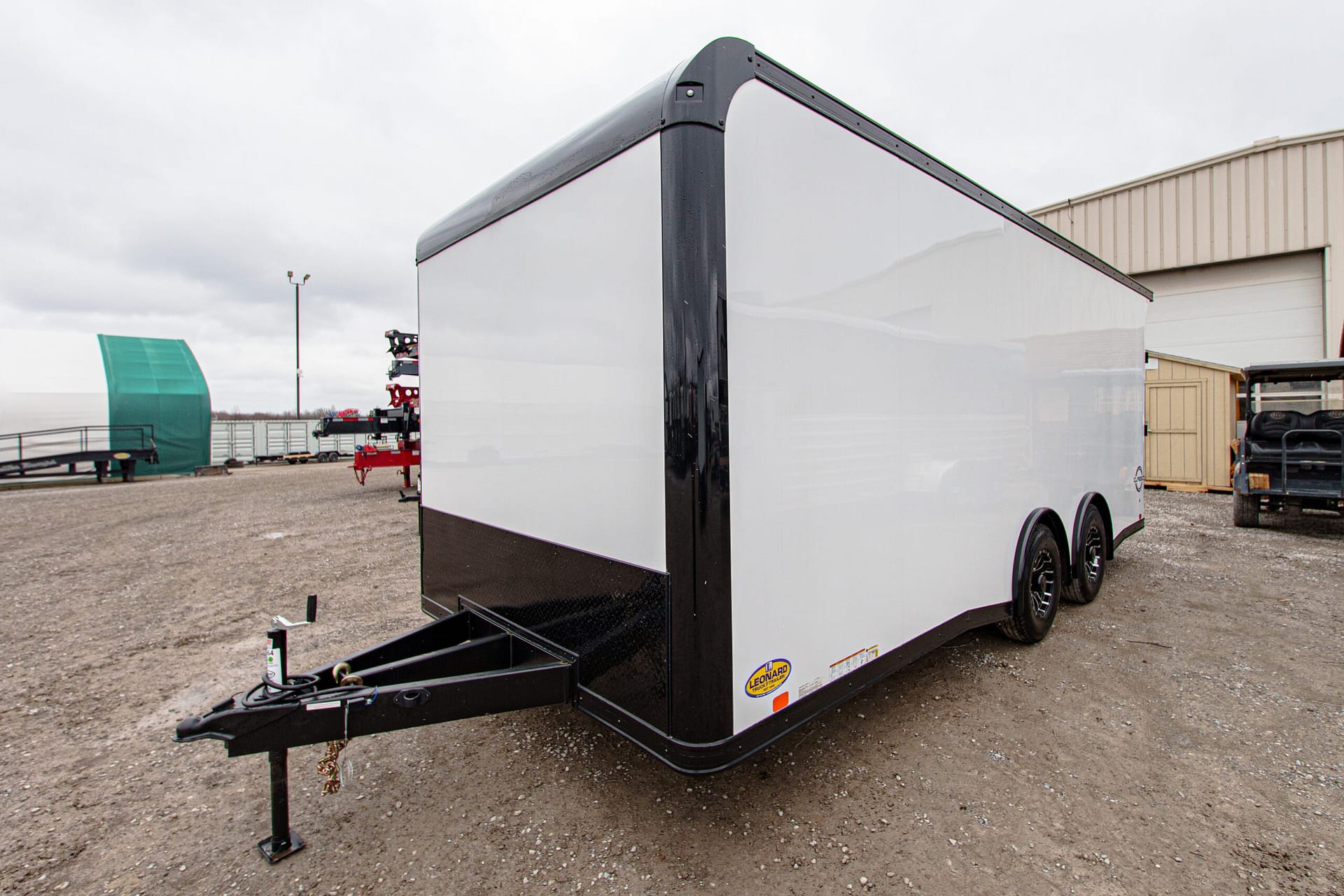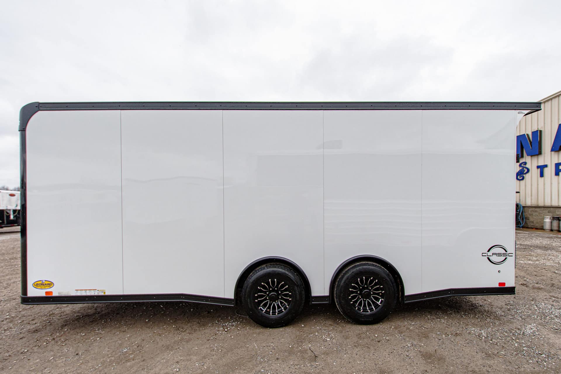 Heavy-duty United CLA-8.520TA52 designed for hauling vehicles and cargo with durability and premium construction. Features enclosed car trailer design, tandem axles, strong I-beam frame, aluminum exterior, and multiple tie-down points for secure transport.